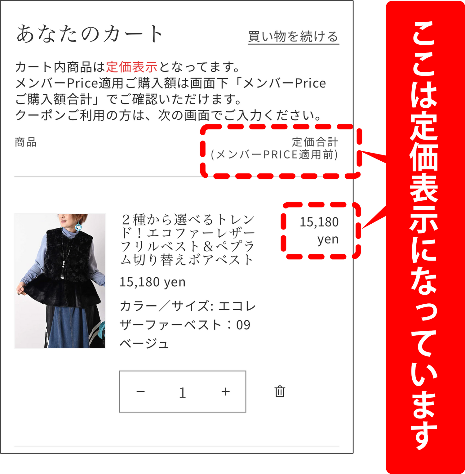 「定価ご購入額合計」と表示されている場合、定価でのご購入となります。ログイン後、再度この「カート」画面を表示してください。ログインしても表示される場合、メンバー登録のお手続きを完了させてください。