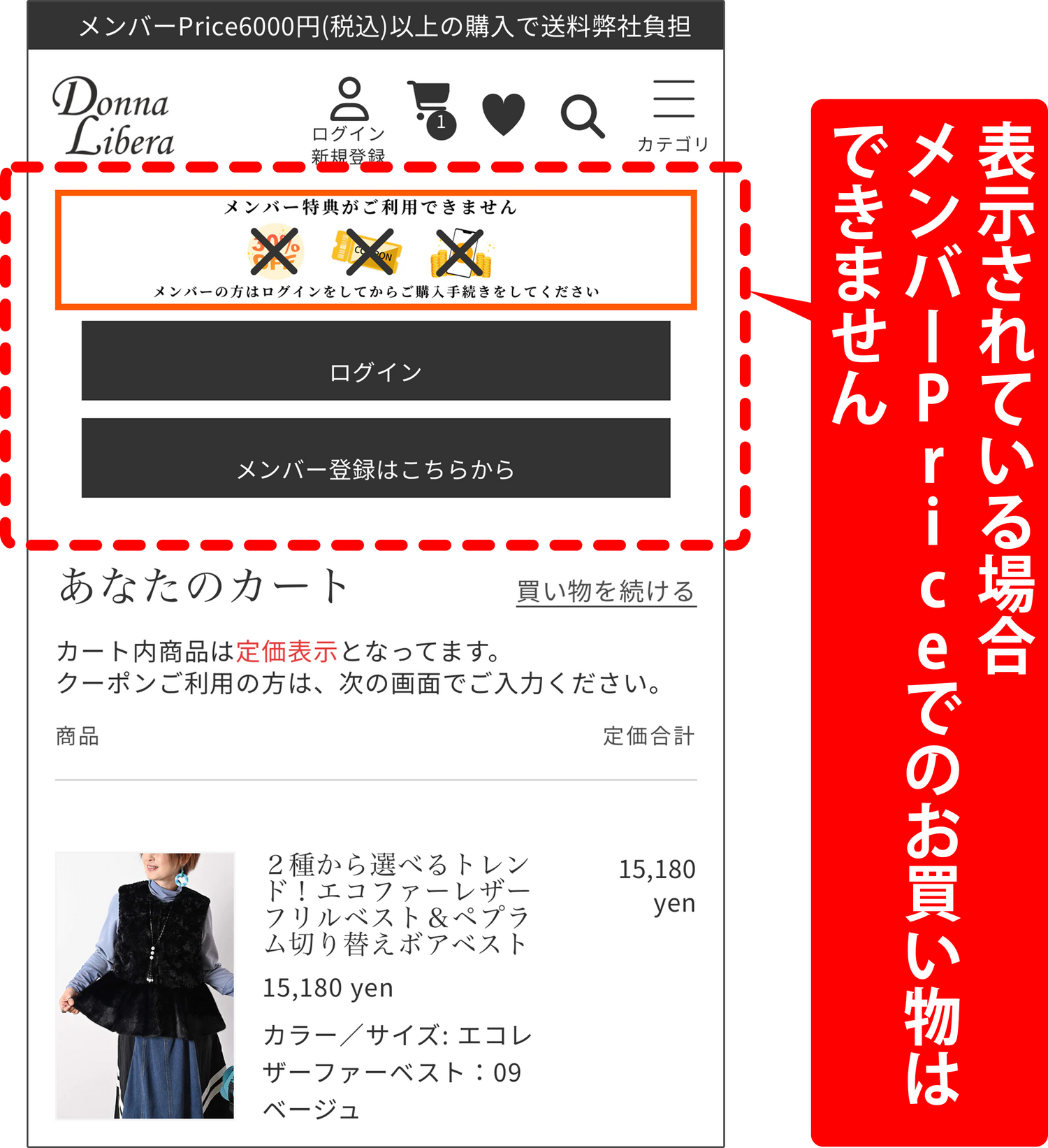 ここで「メンバー特典がご利用できません」が表示されている場合、メンバーPriceがご利用いただけません。