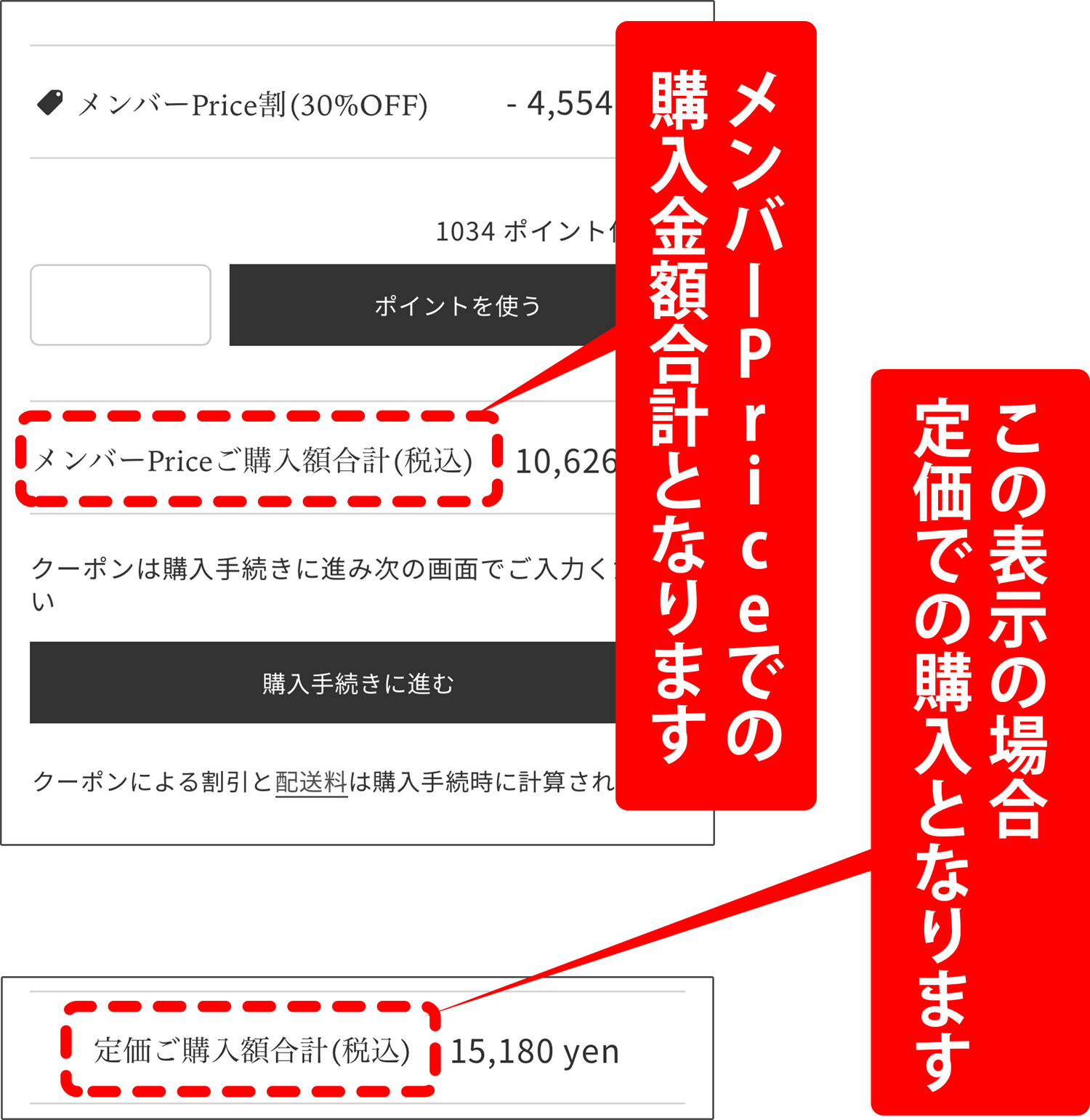 「メンバーPriceご購入額合計」と表示されている場合、メンバーPriceが適用されています。