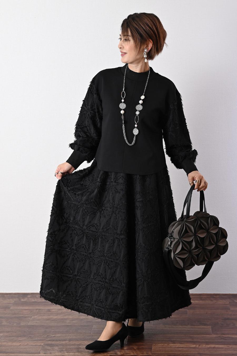 ポンチ&カットジャガードプルオーバー+カットジャガードフレアスカート2点セットコーデ