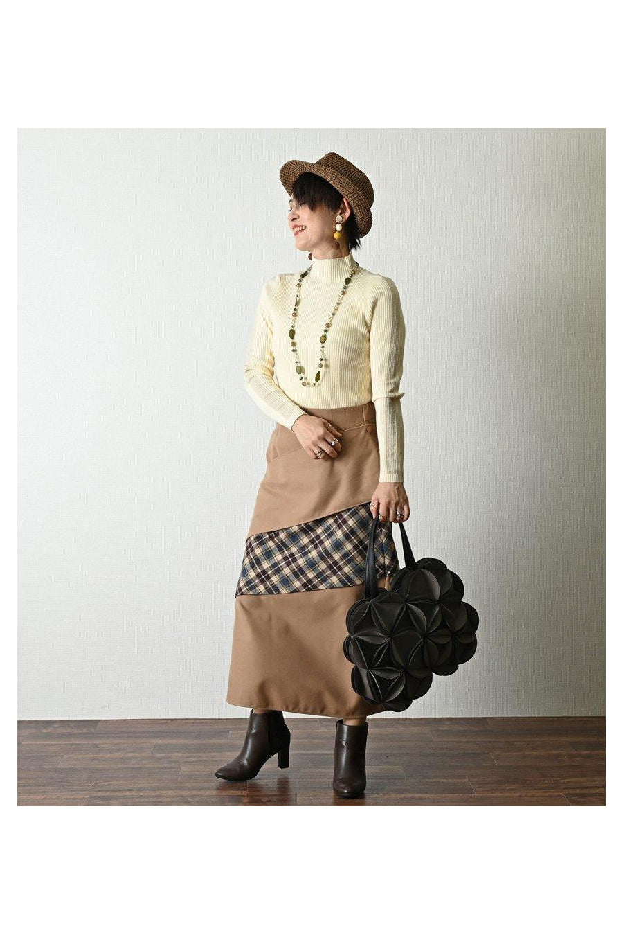 ソフトポンチ×タフタ切り替えジャケット+ジャガード多色チェックスカート2点セットコーデ