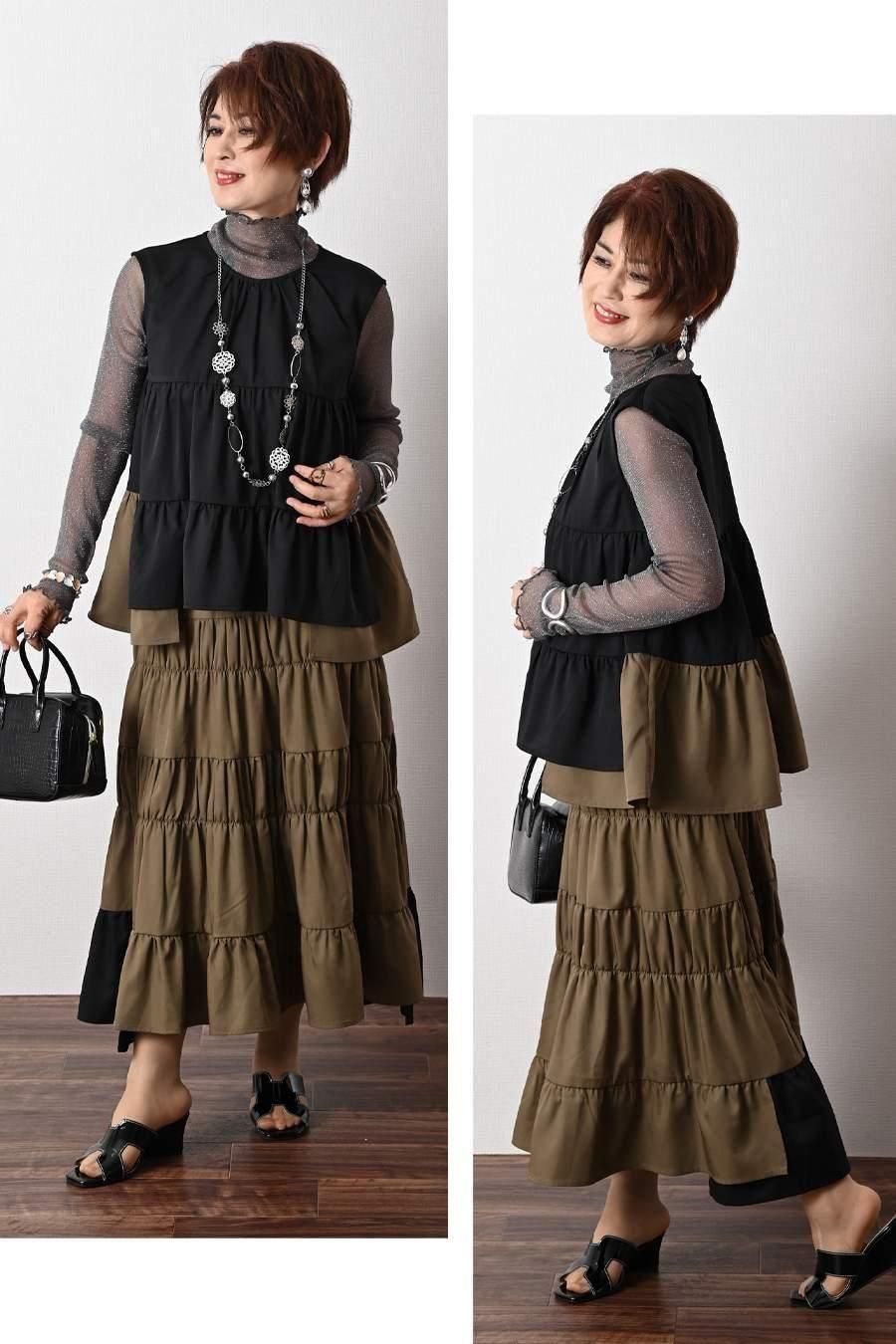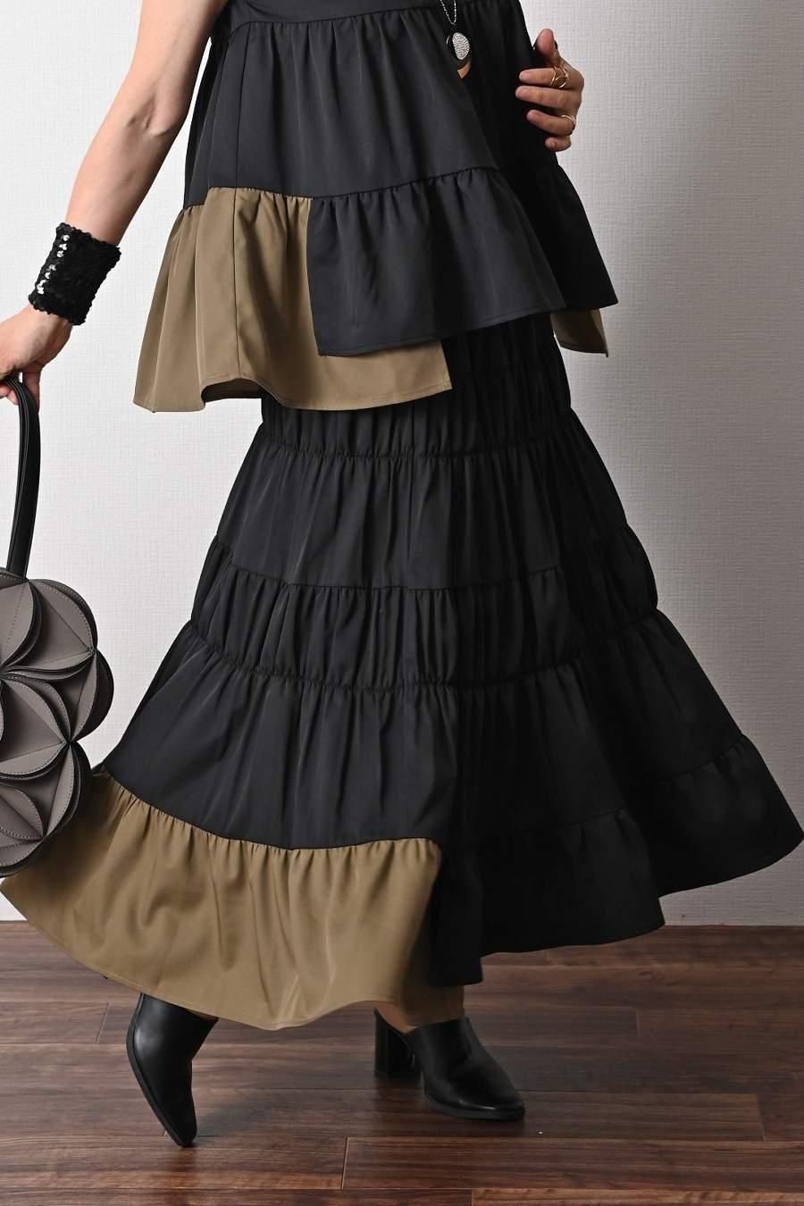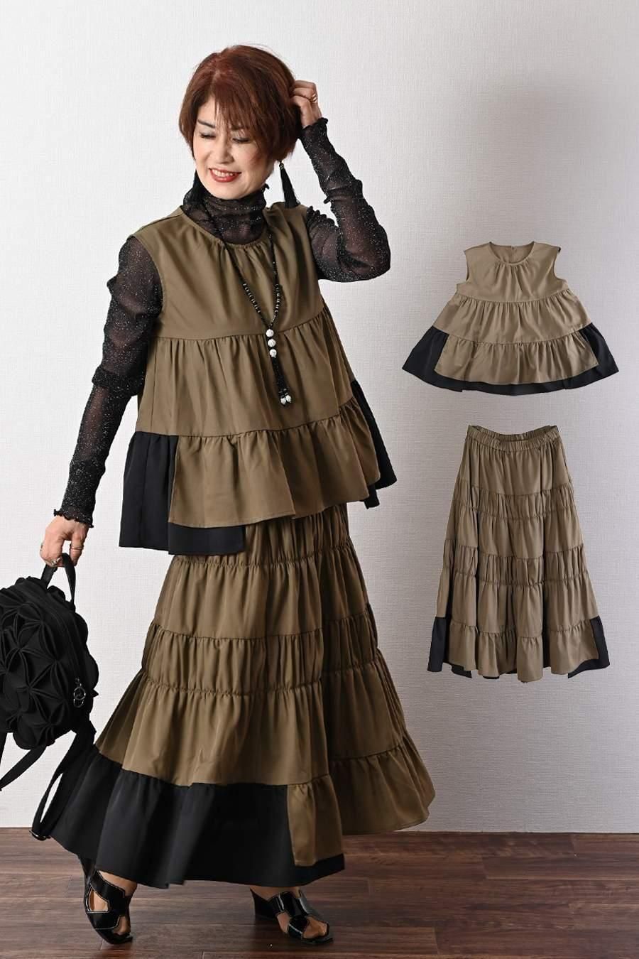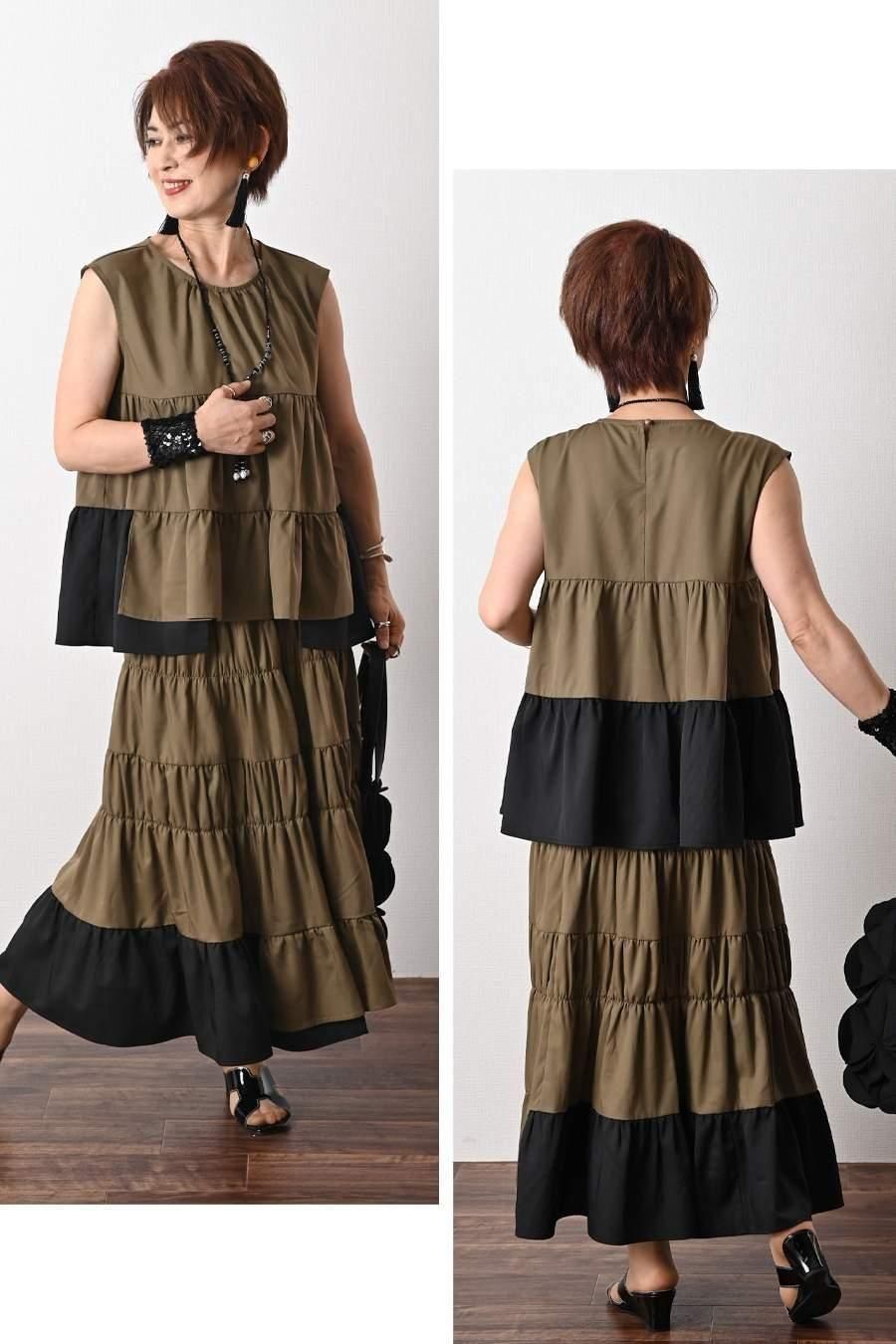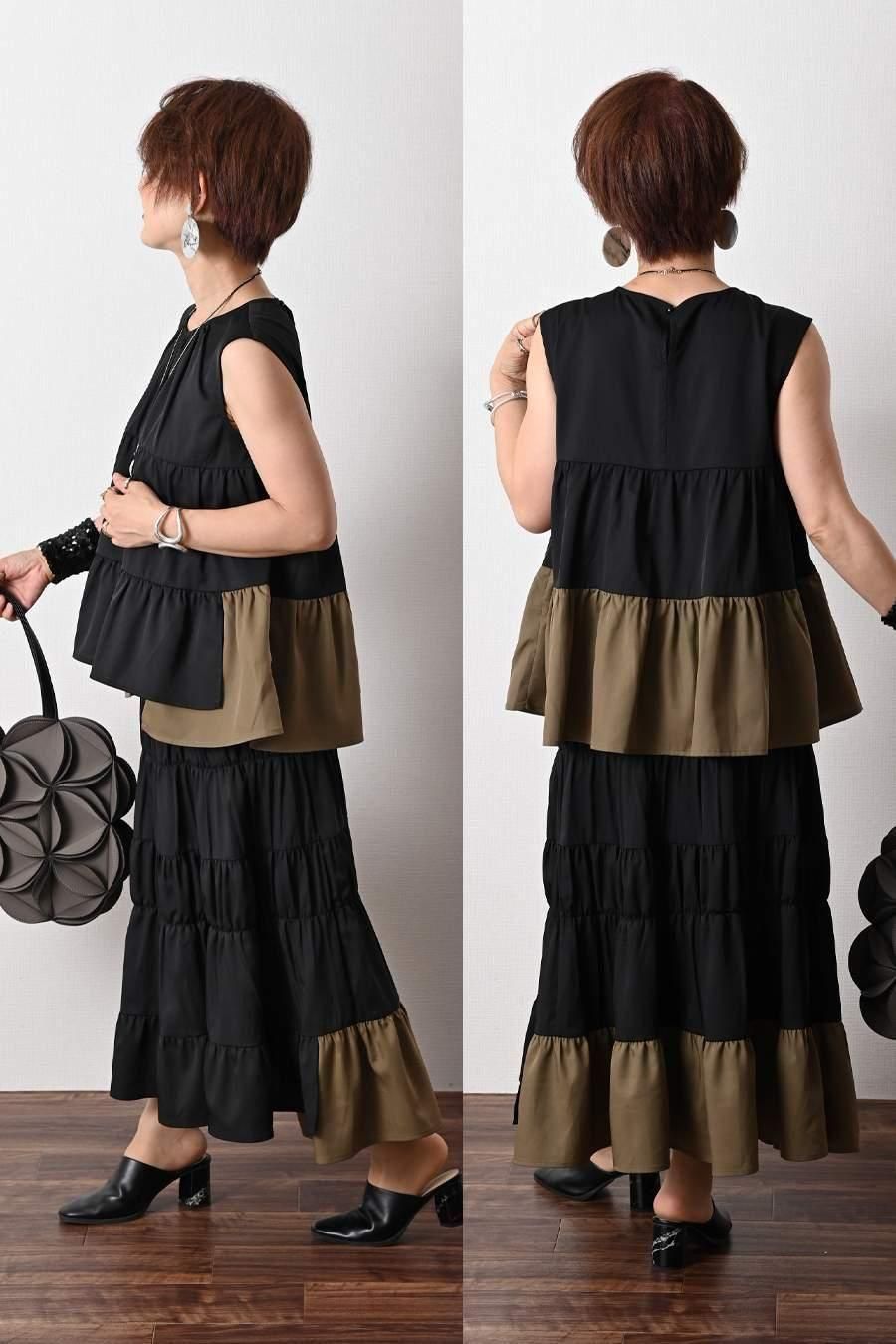 ティアード配色ノースリーブブラウス+ティアード配色スカート2点セット