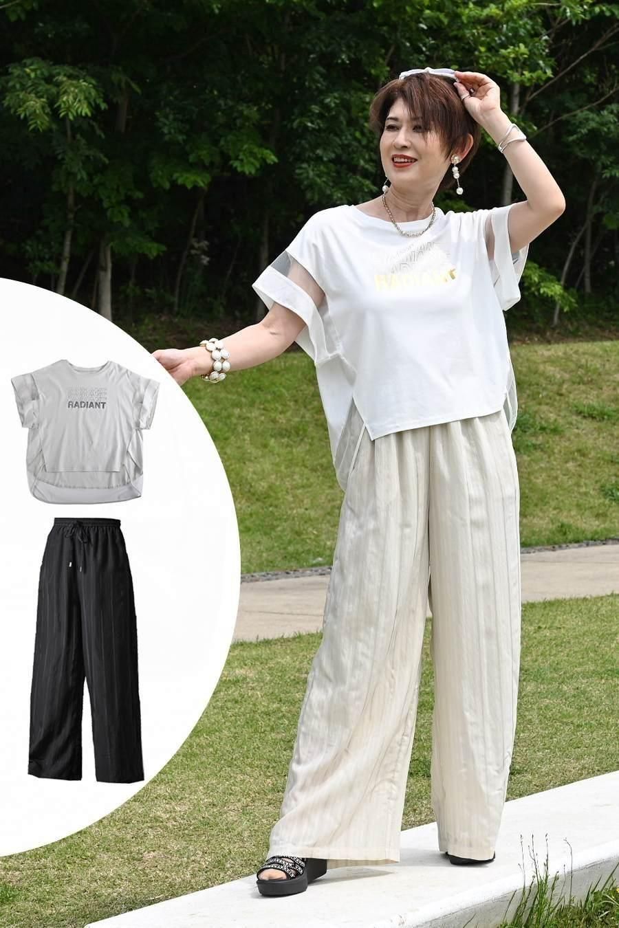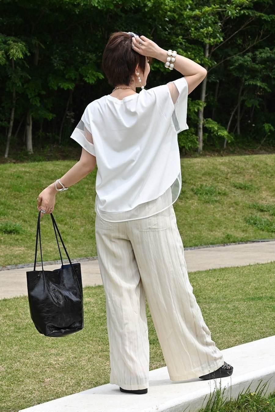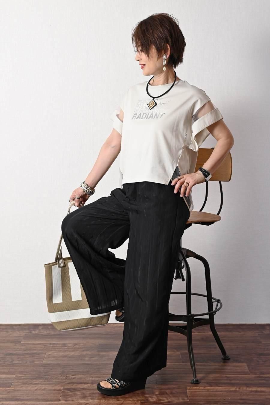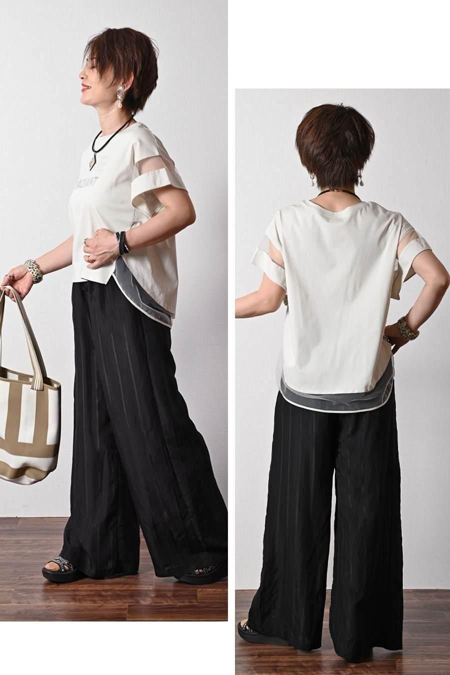 箔プリント&チュール切り替えカットソー+シャドーストライプワイドパンツ2点セットコーデ