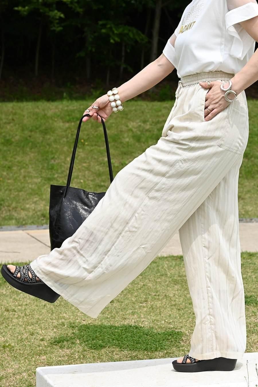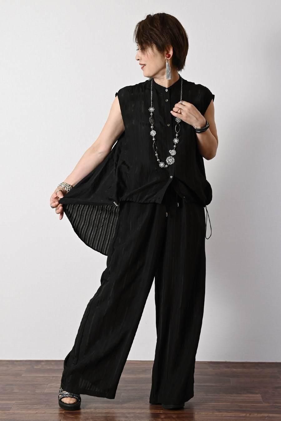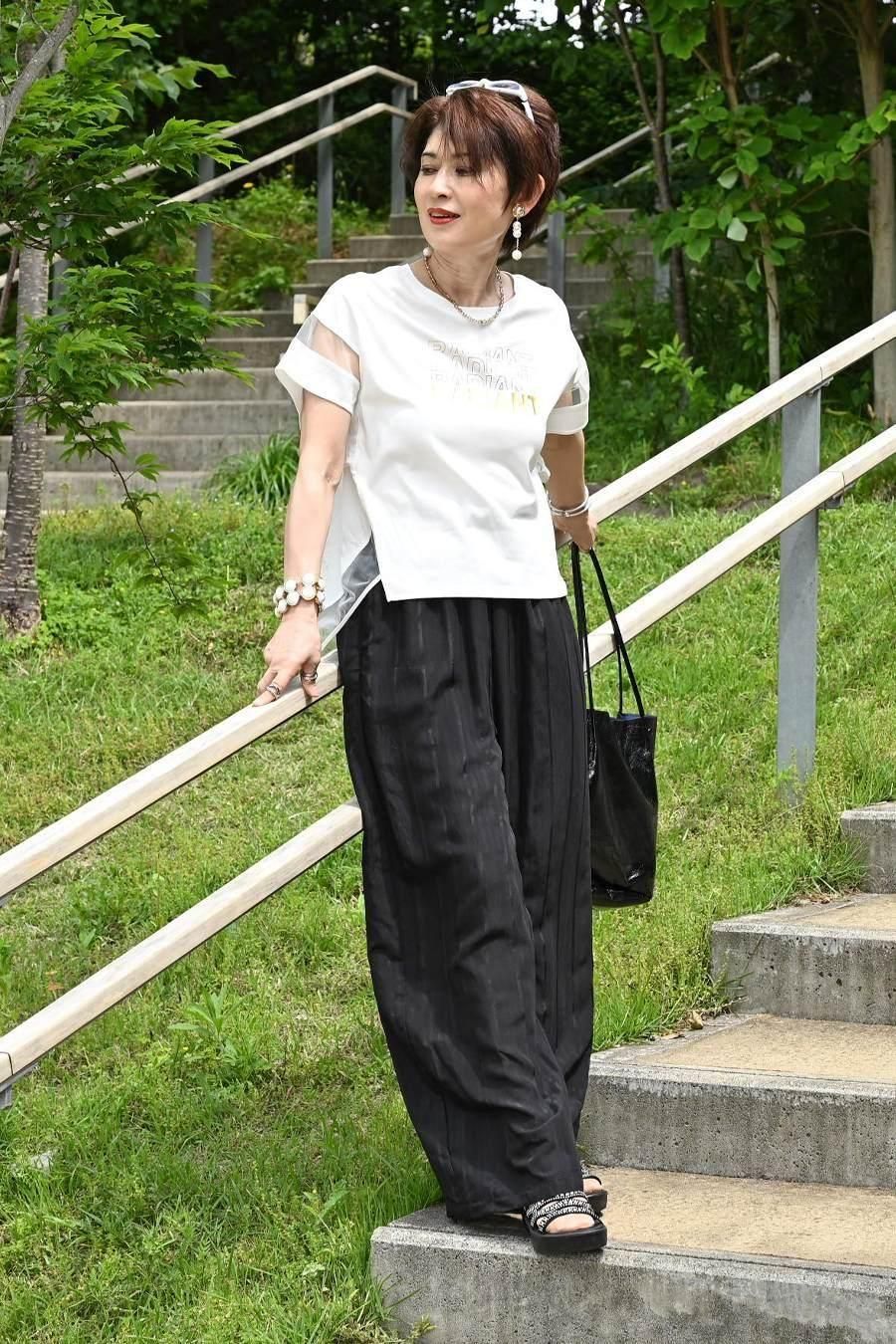箔プリント&チュール切り替えカットソー+シャドーストライプワイドパンツ2点セットコーデ