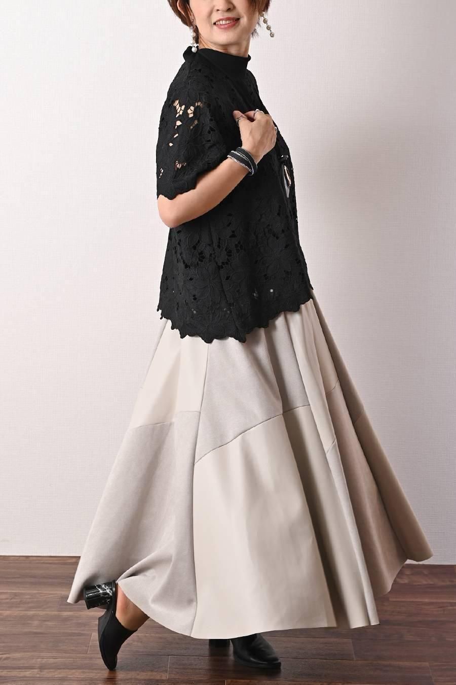 ポンチ&カットジャガードプルオーバー+カットジャガードフレアスカート2点セットコーデ