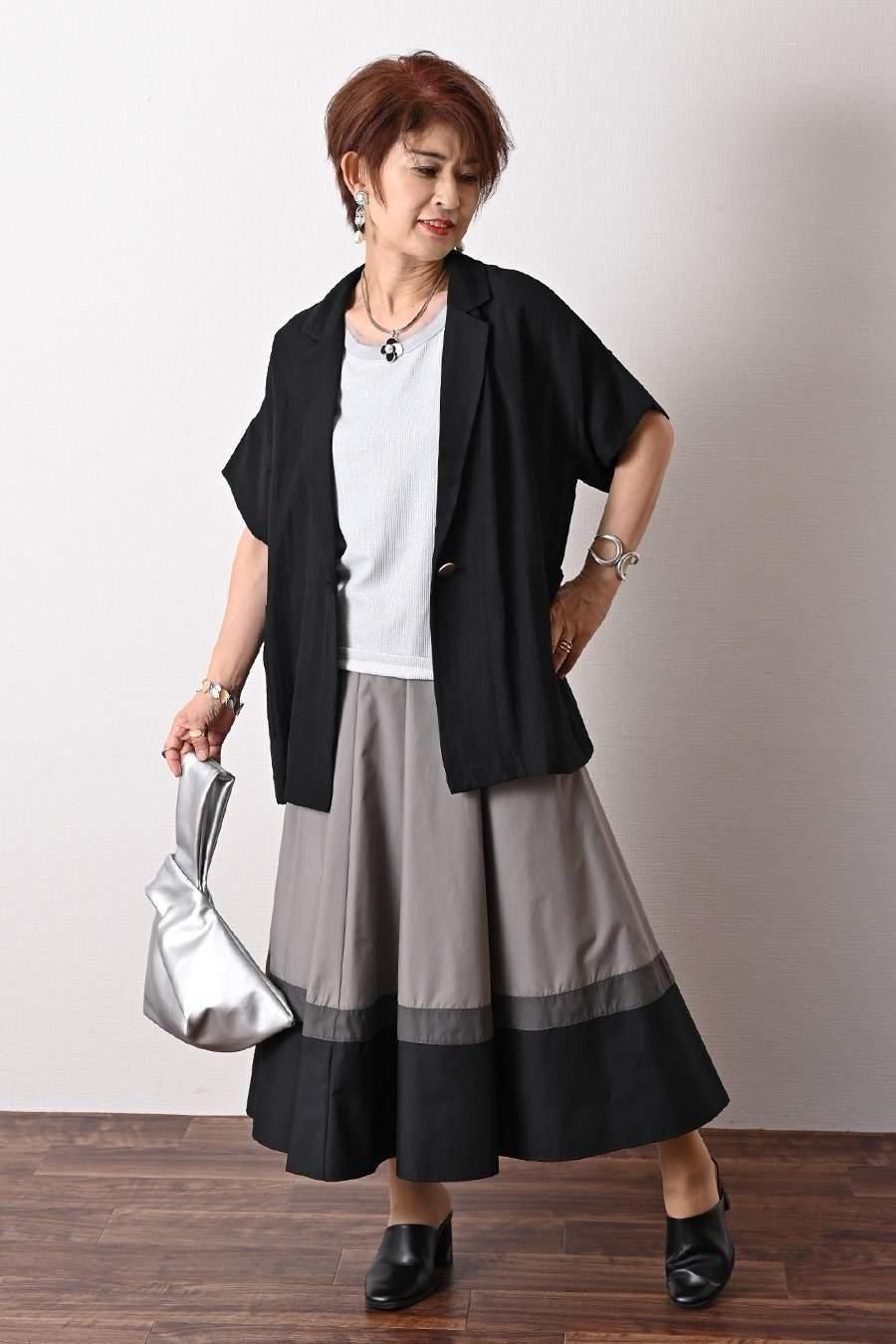 ソフトポンチ×タフタ切り替えジャケット+ジャガード多色チェックスカート2点セットコーデ