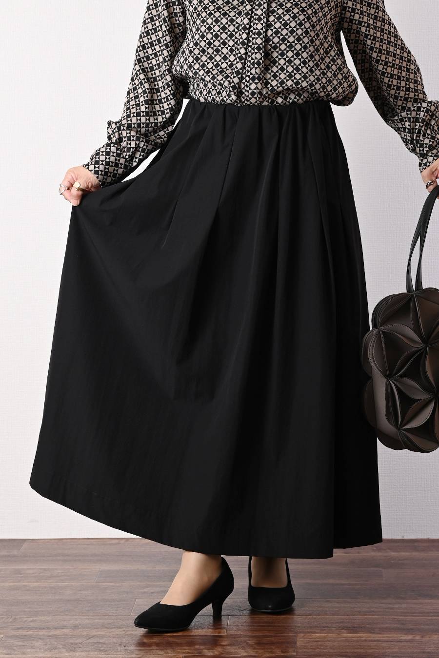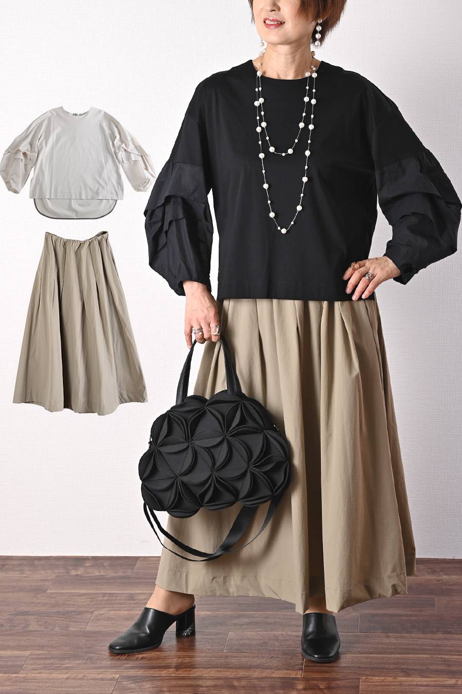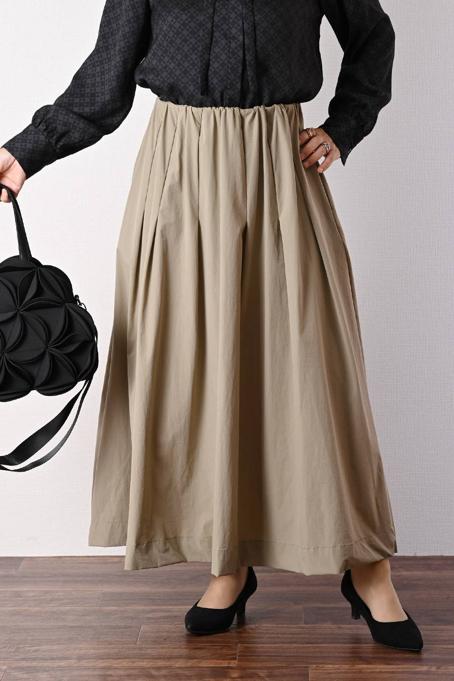 タックスリーブプルオーバー+軽量タック&ギャザー フレアスカート2点セットコーデ