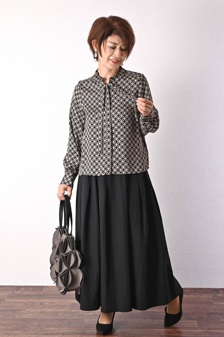 大人のバルーンブルゾン+先染めジャガード多色チェックスカート2点セットコーデ