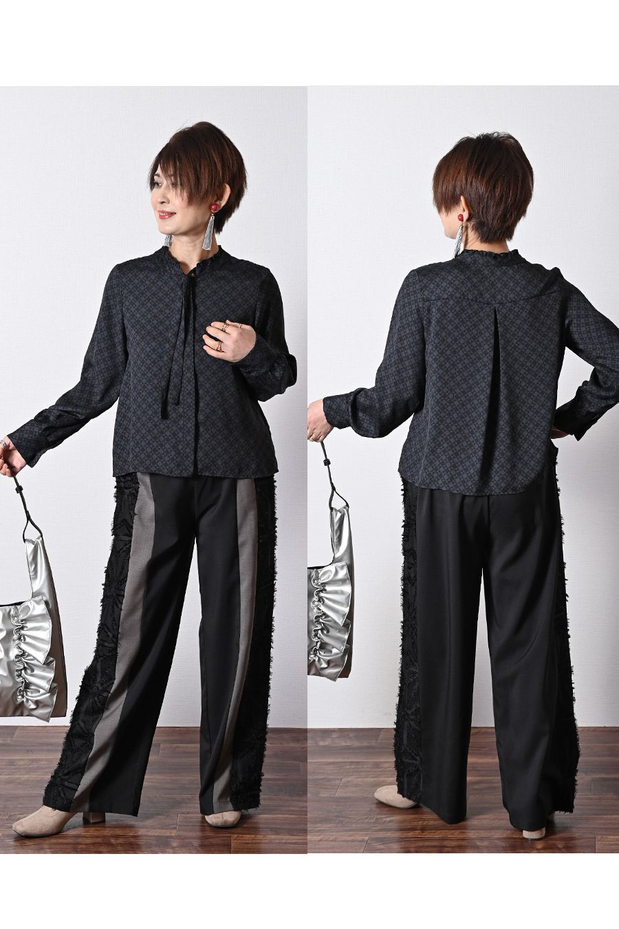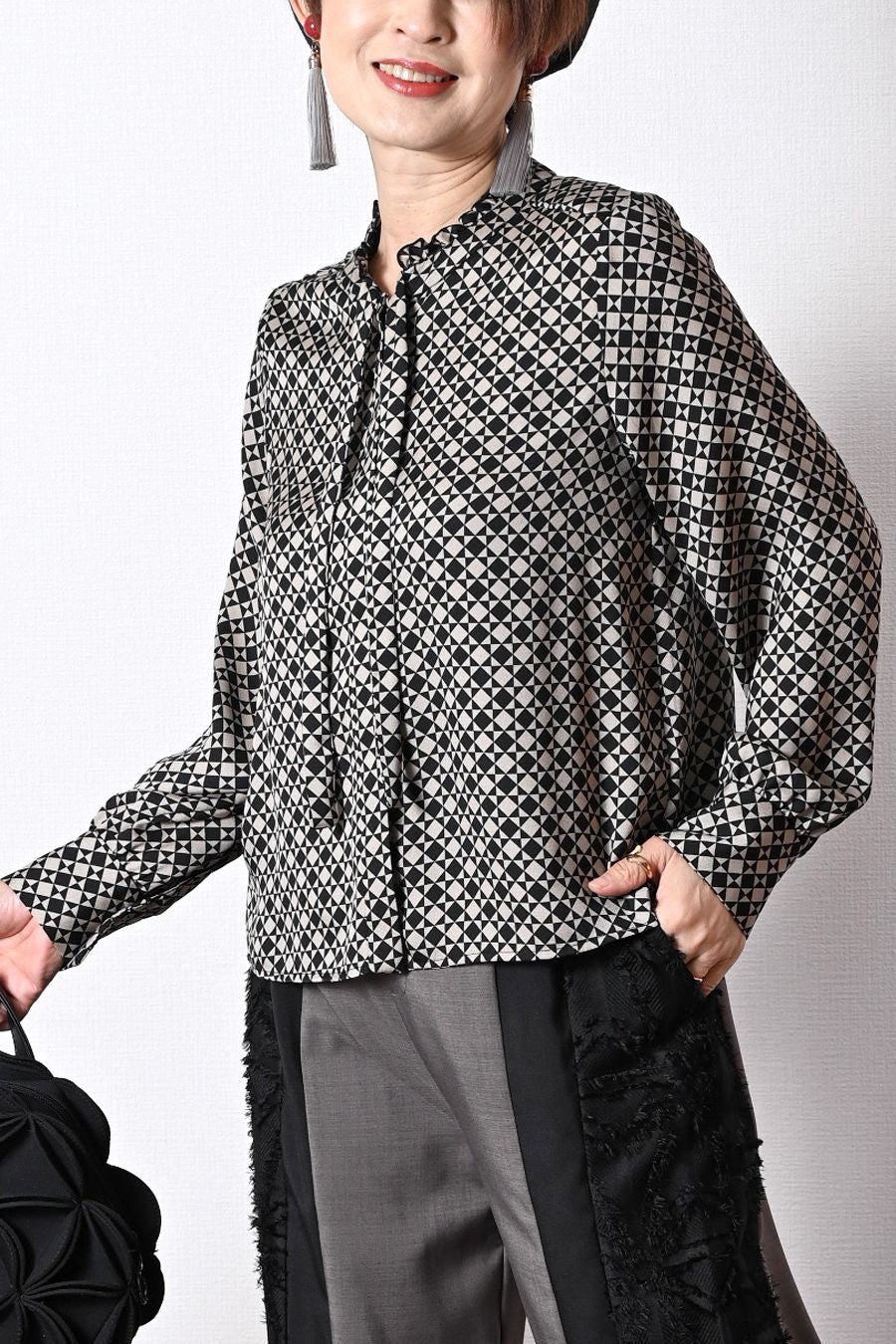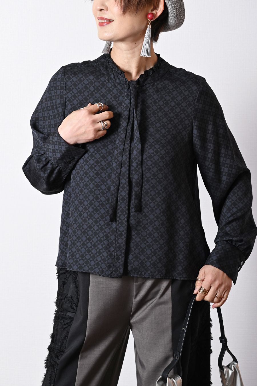 バックサテン風プリント ボウタイ付きブラウス