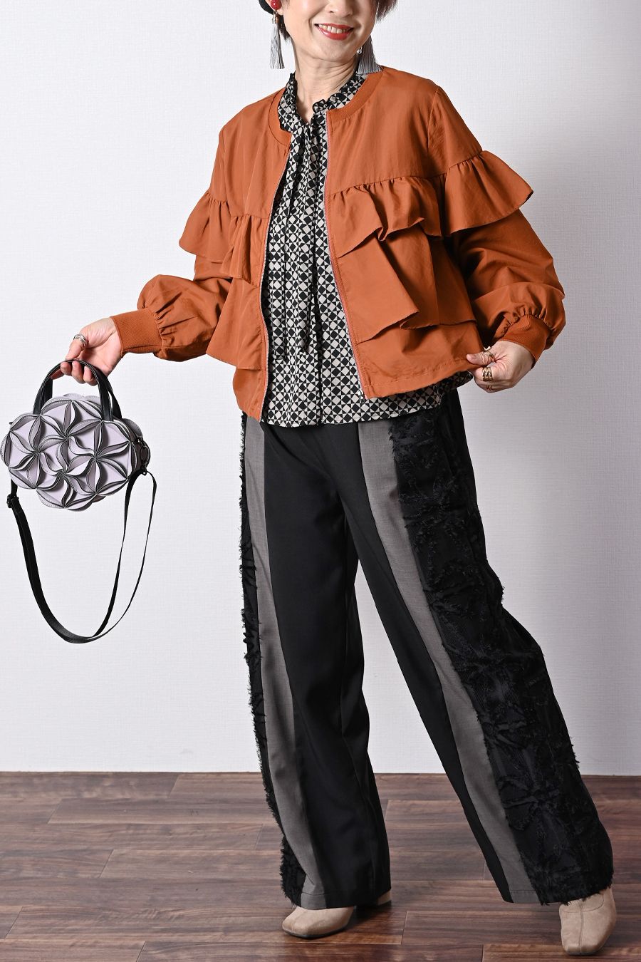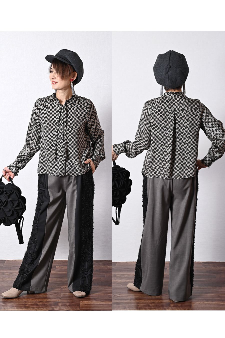 ポンチ切り替えプルオーバー+サイドプリーツワイドパンツ2点セットコーデ【2月中旬以降発送予定】