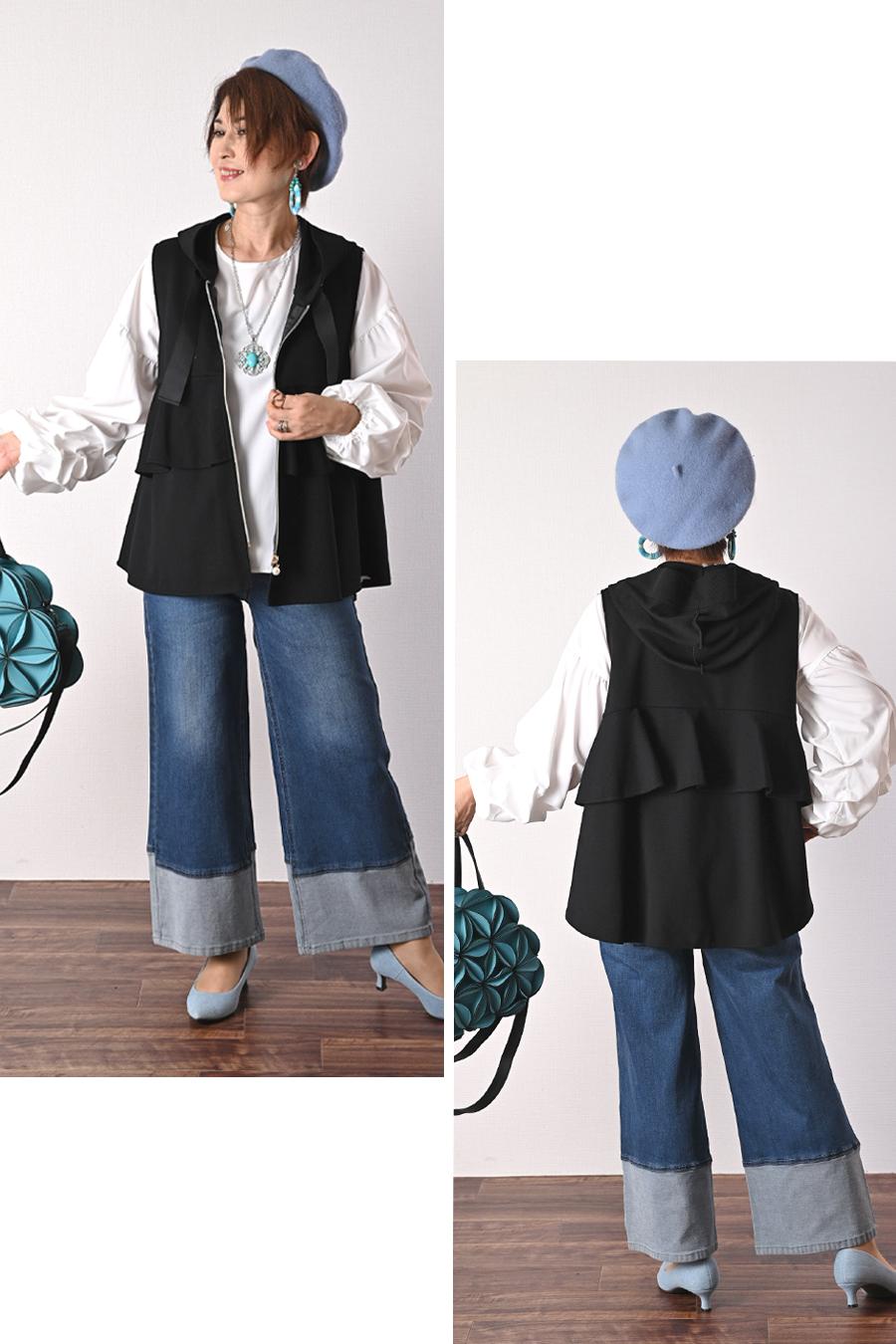 フリンジツィード ショートベスト+超美ドレープ 微起毛ワイドガウチョパンツ2点セットコーデ
