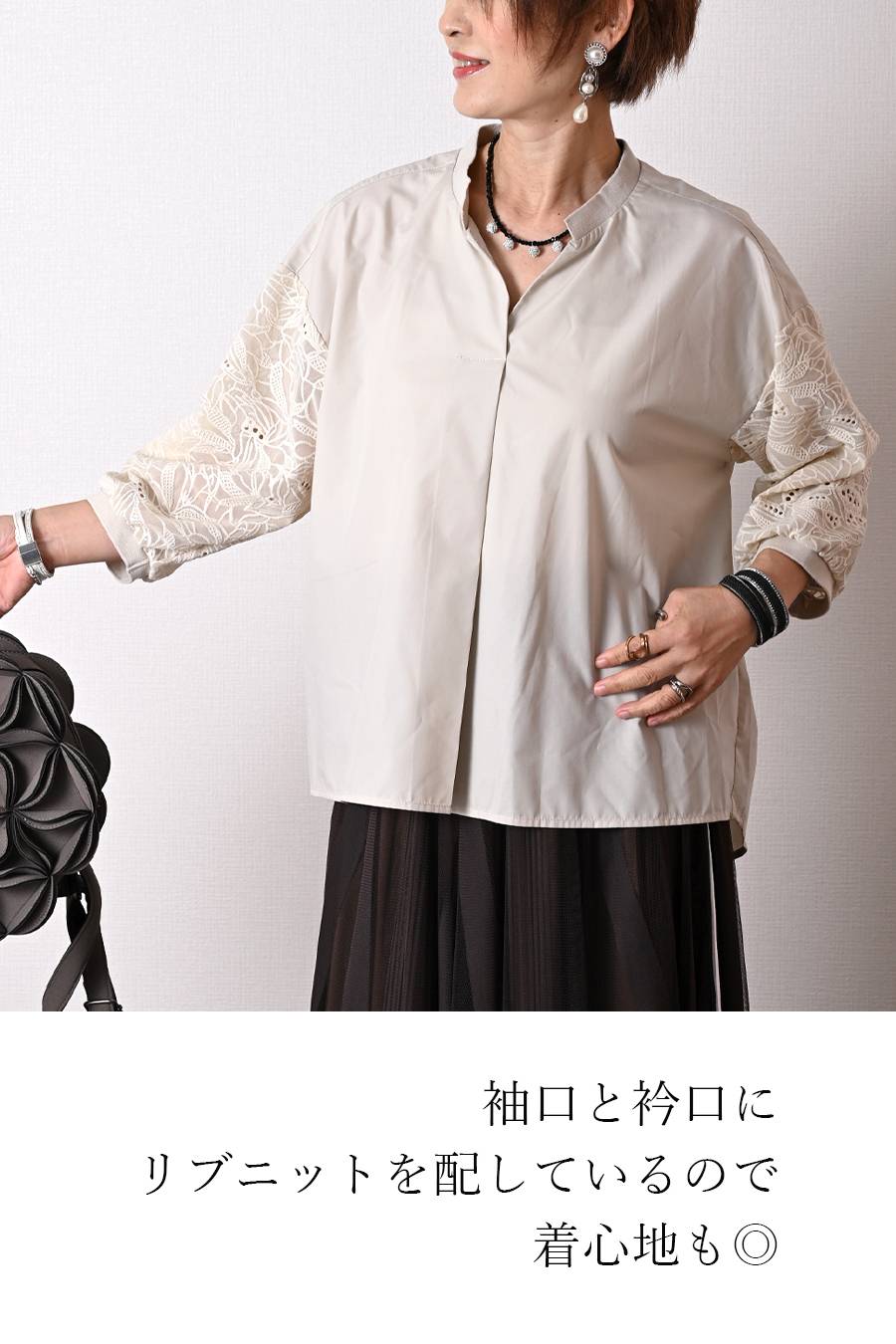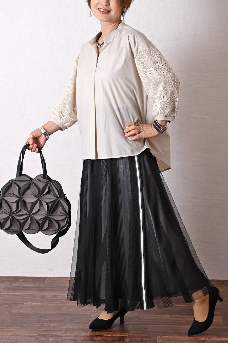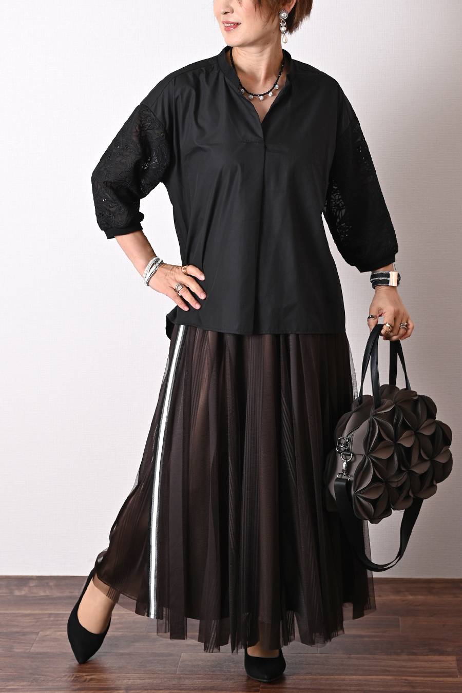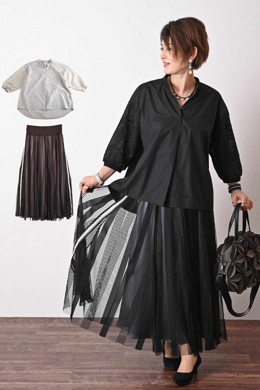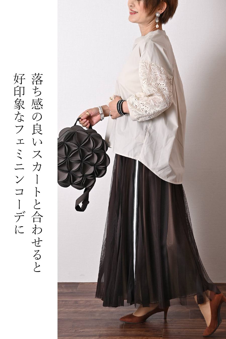 タックスリーブプルオーバー+軽量タック&ギャザー フレアスカート2点セットコーデ