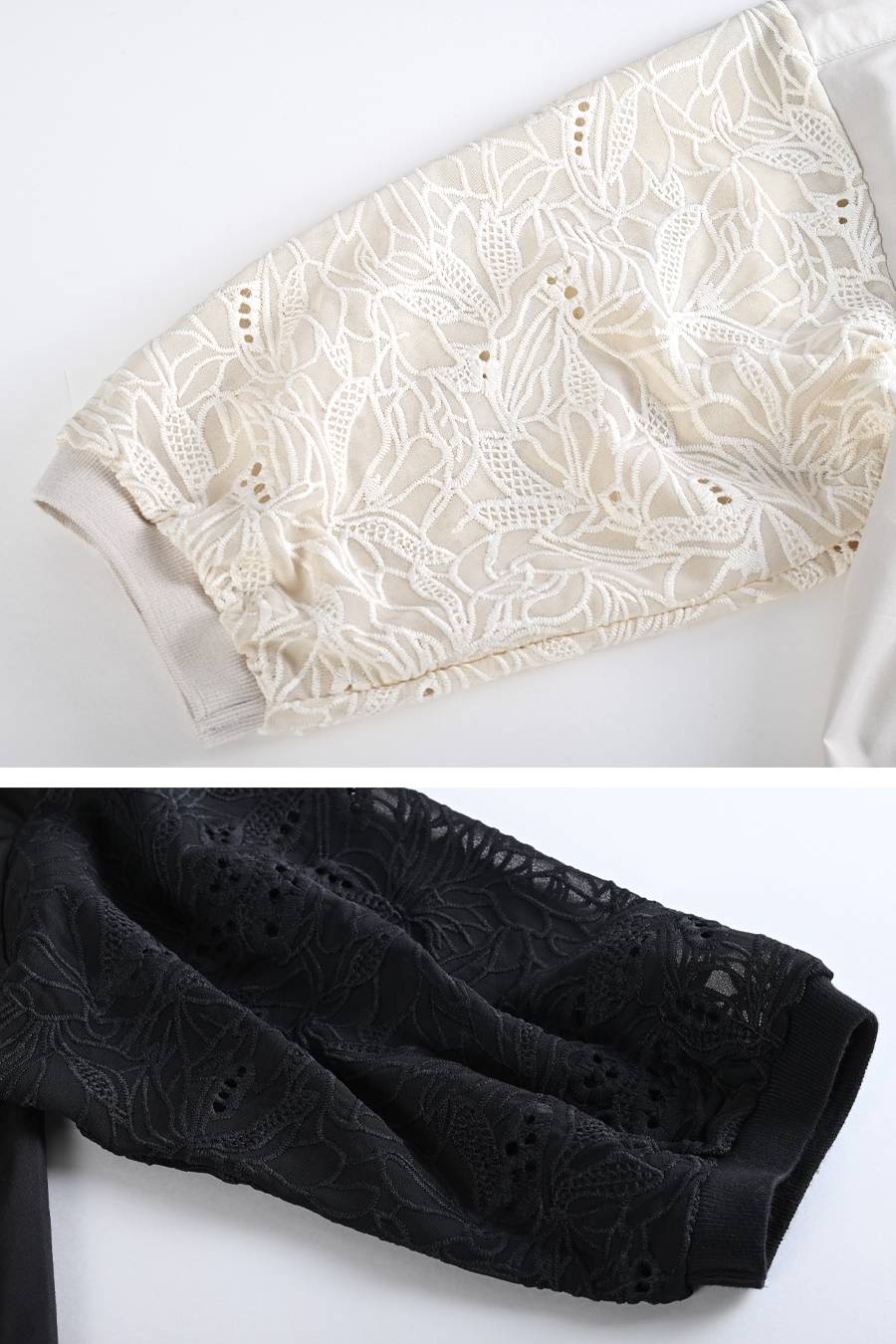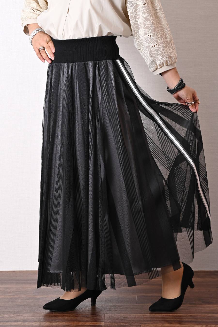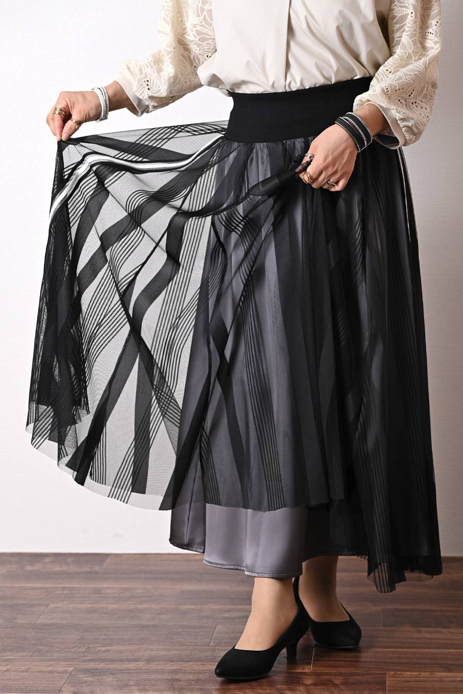 レーススリーブブラウス+ストライプチュールフレアスカート2点セットコーデ