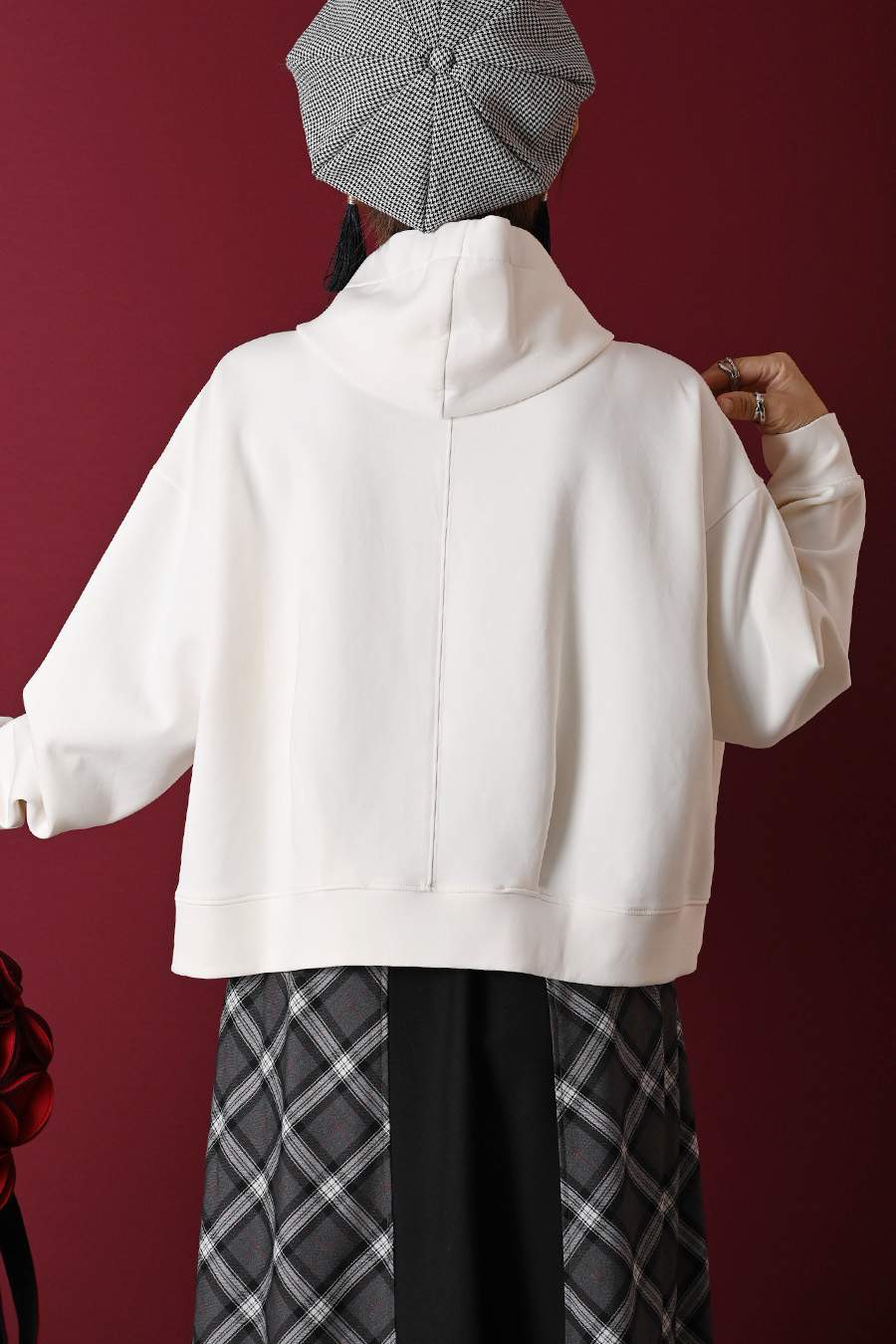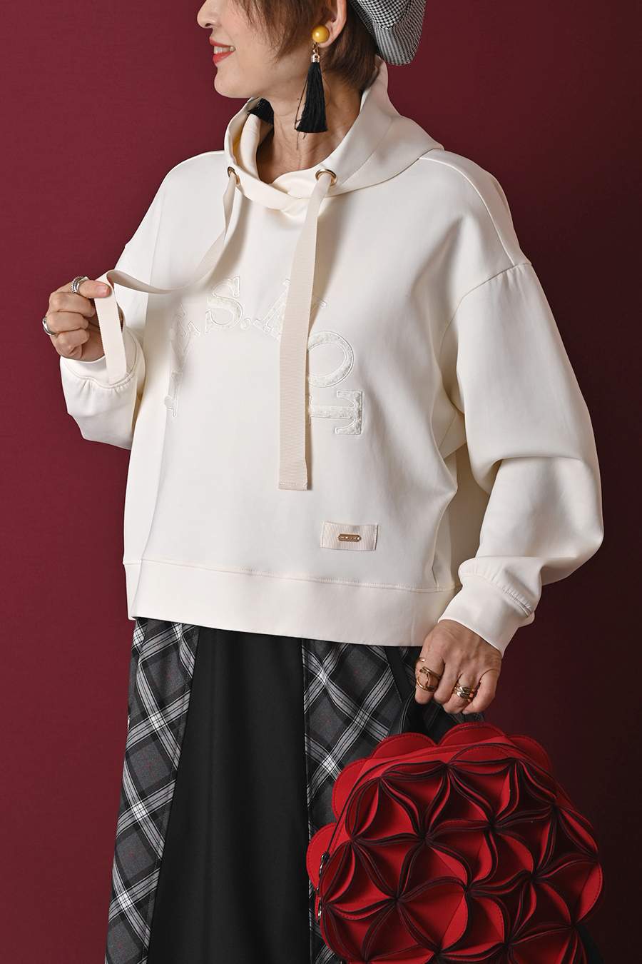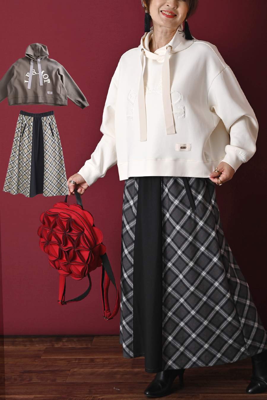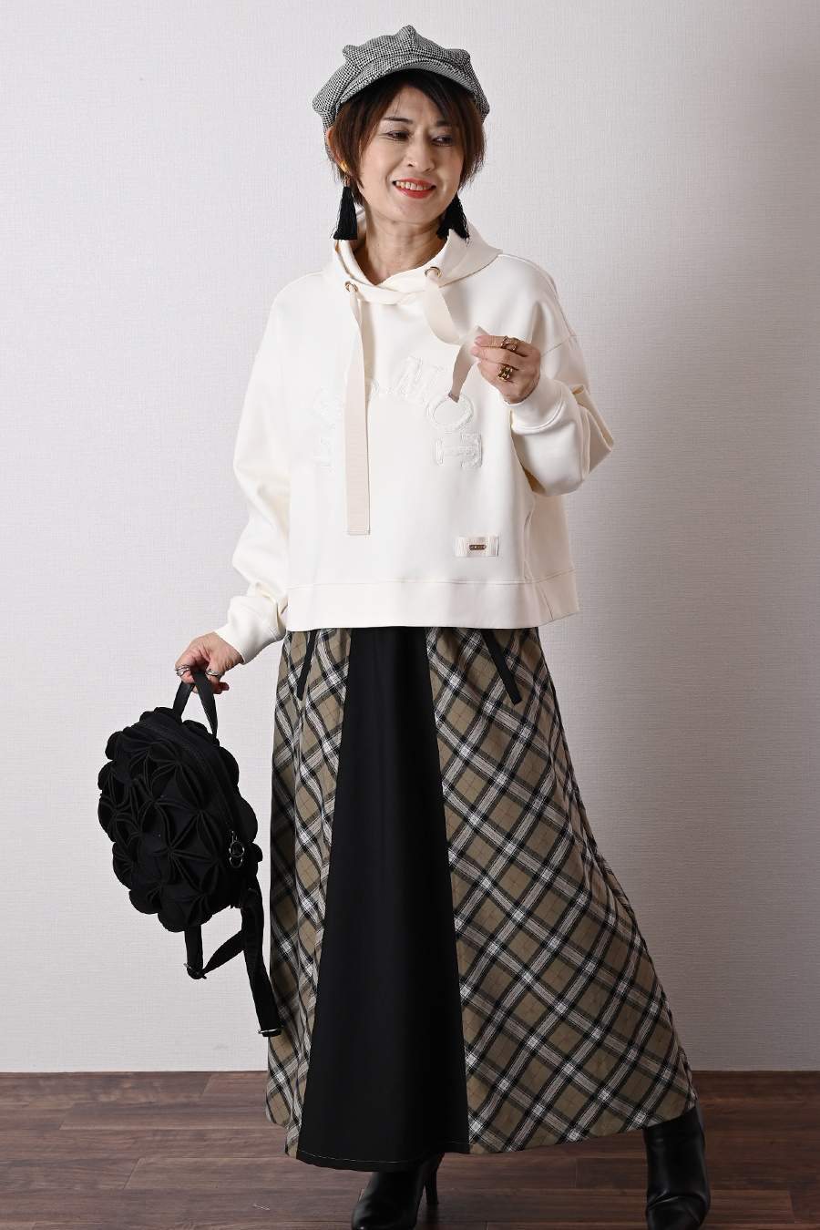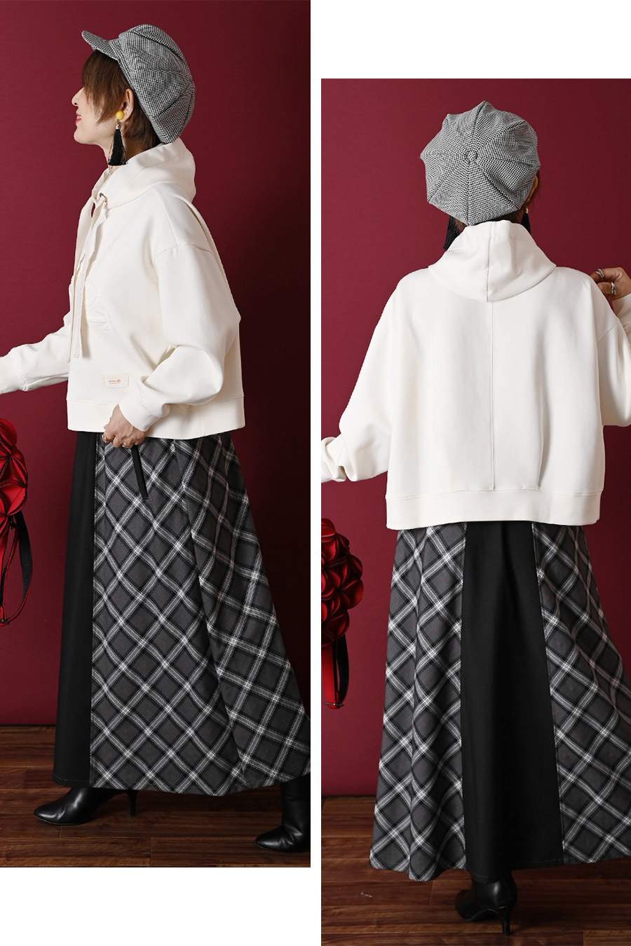 グログランアクセント 大人の為の上質パーカー+広がりすぎない美ライン!バイヤスチェック×無地 フレアスカート
