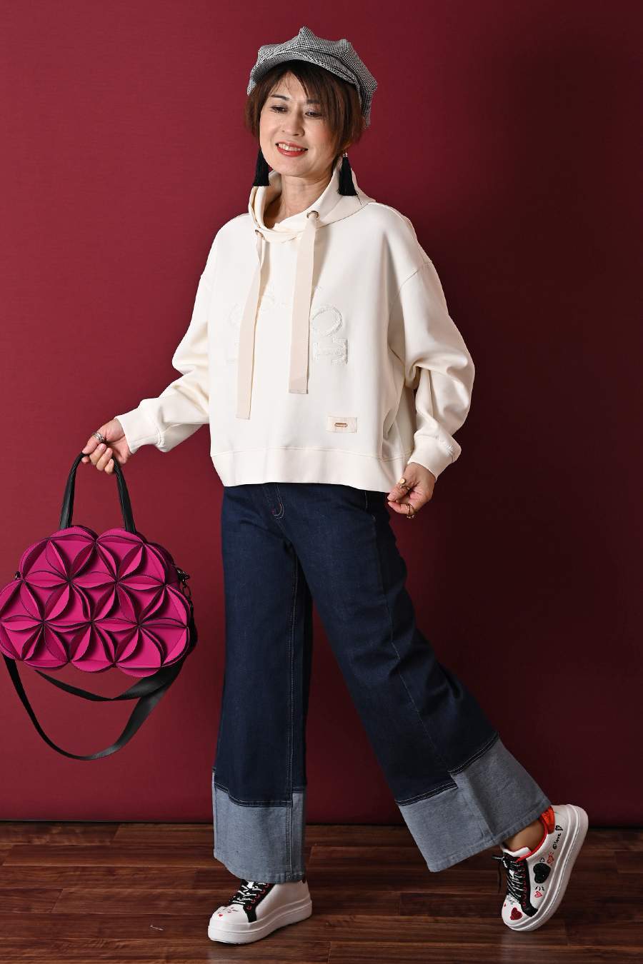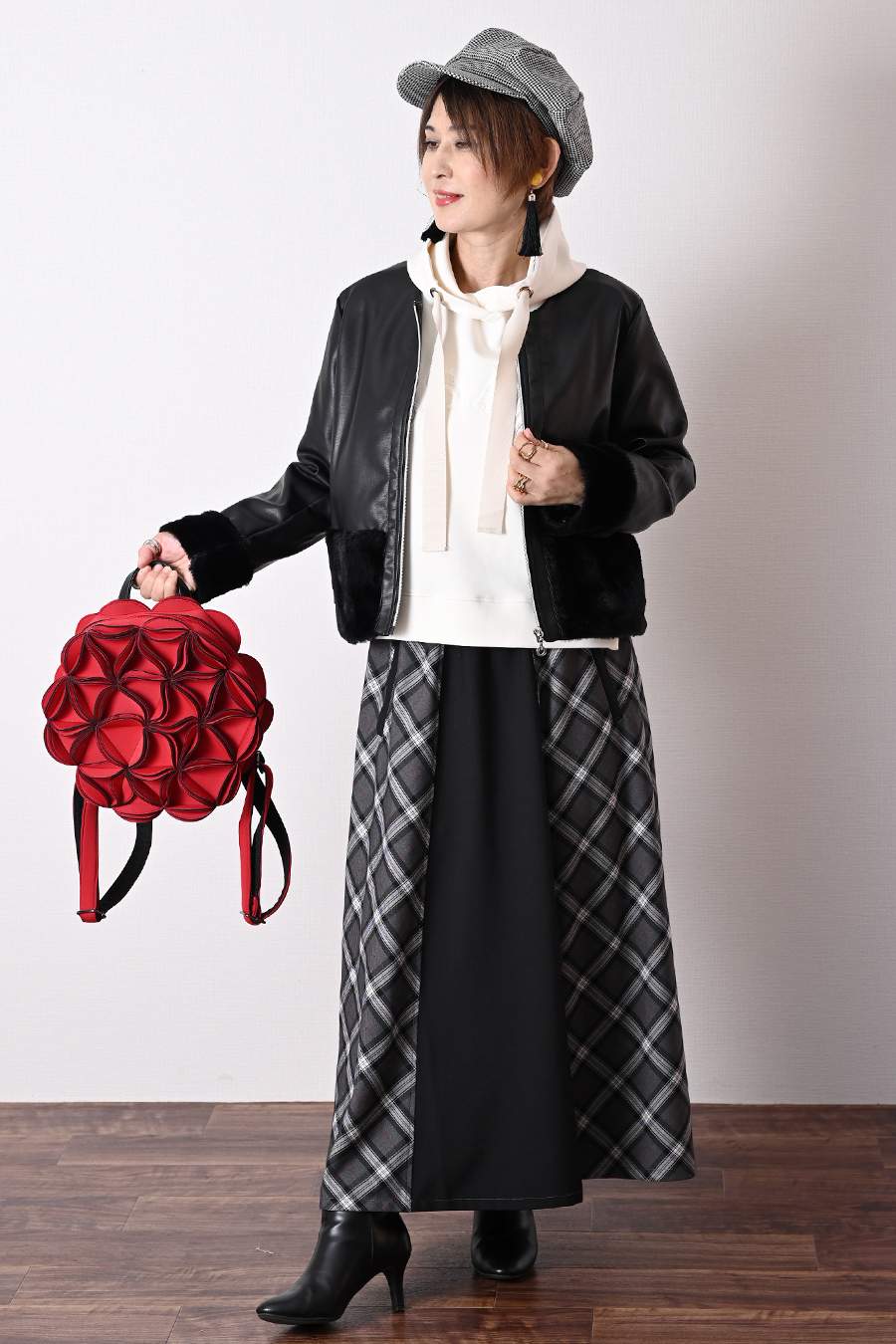 大人のバルーンブルゾン+先染めジャガード多色チェックスカート2点セットコーデ