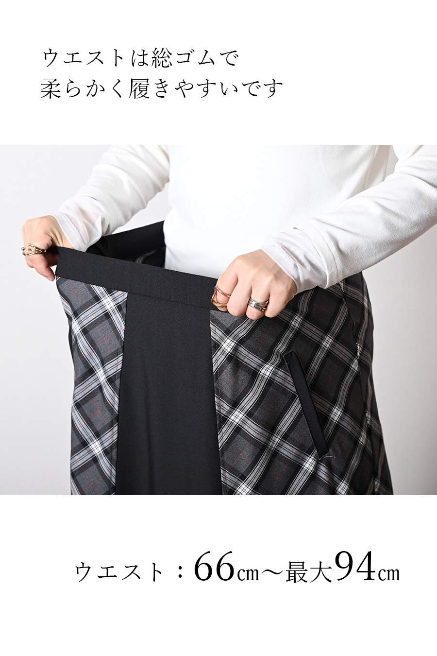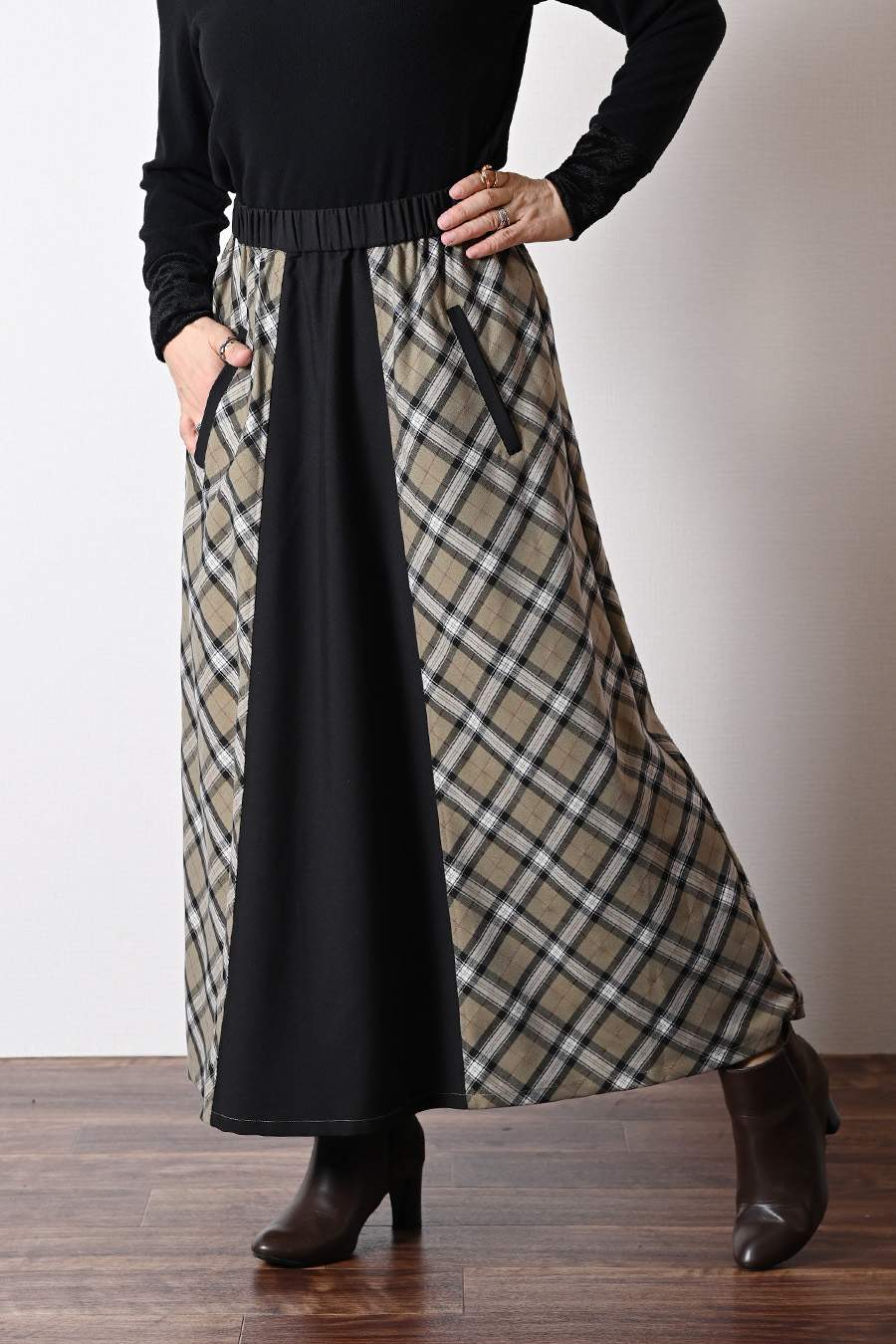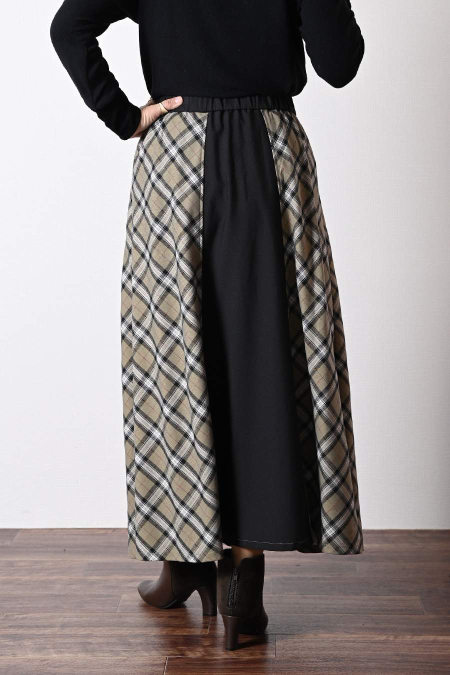 広がりすぎない美ライン!バイヤスチェック×無地 フレアスカート