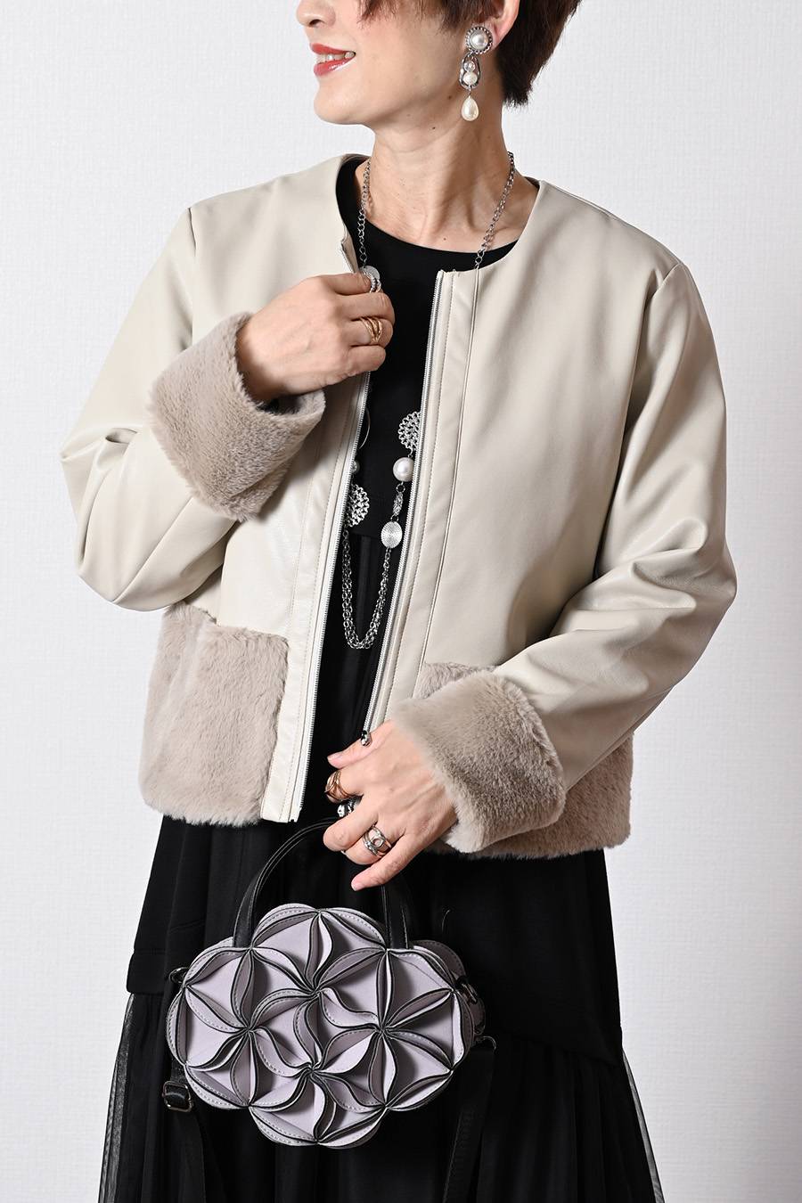 エコファーレザーフリルベスト&ペプラム切り替えボアベスト