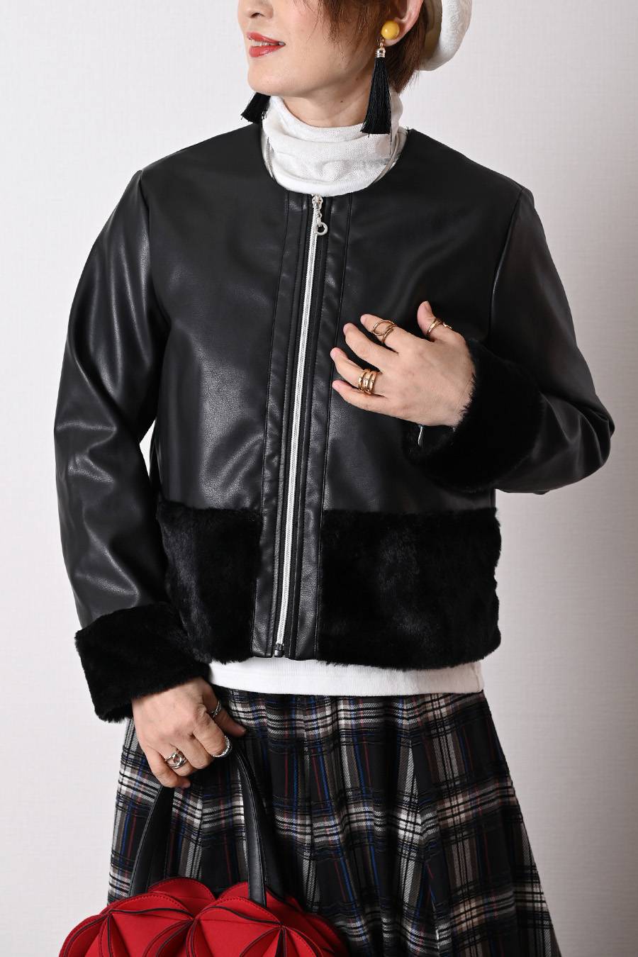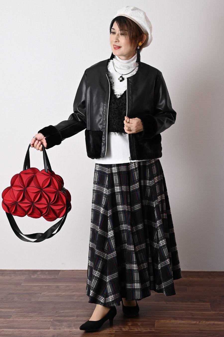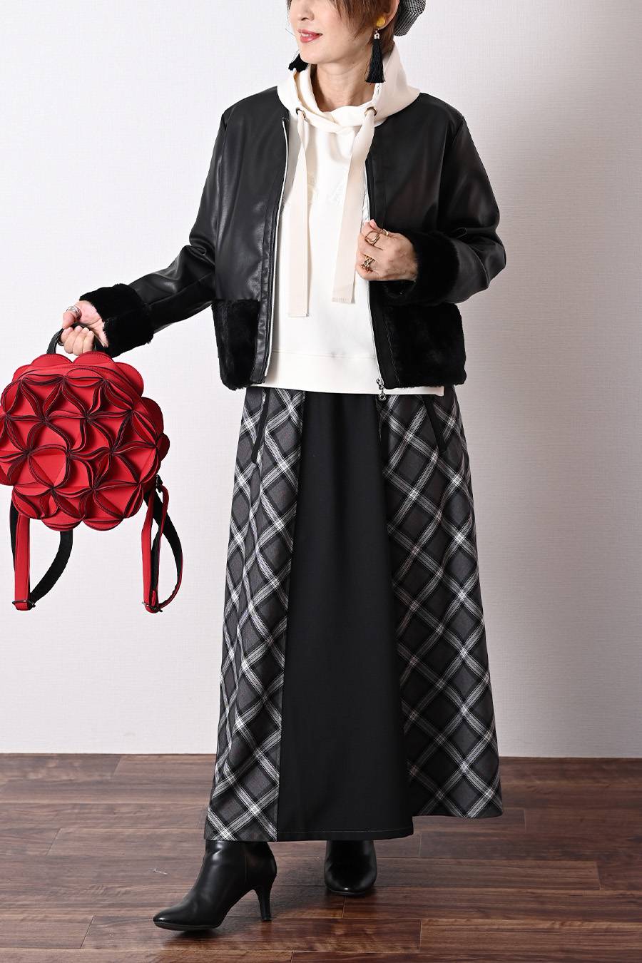 大人のバルーンブルゾン+先染めジャガード多色チェックスカート2点セットコーデ