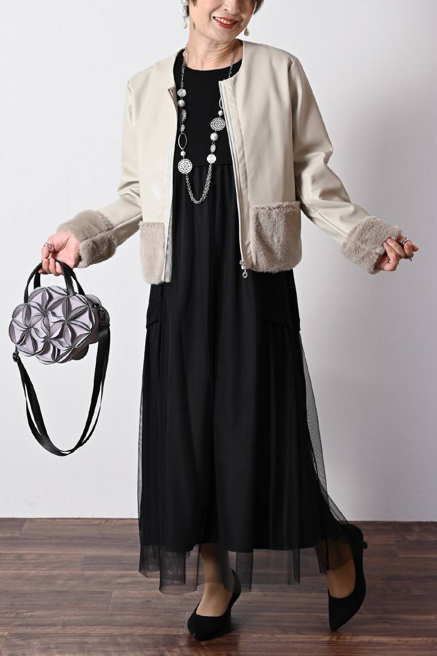 選べるボアベスト+ラメ&チュール タートルネックプルオーバー2点セットコーデ