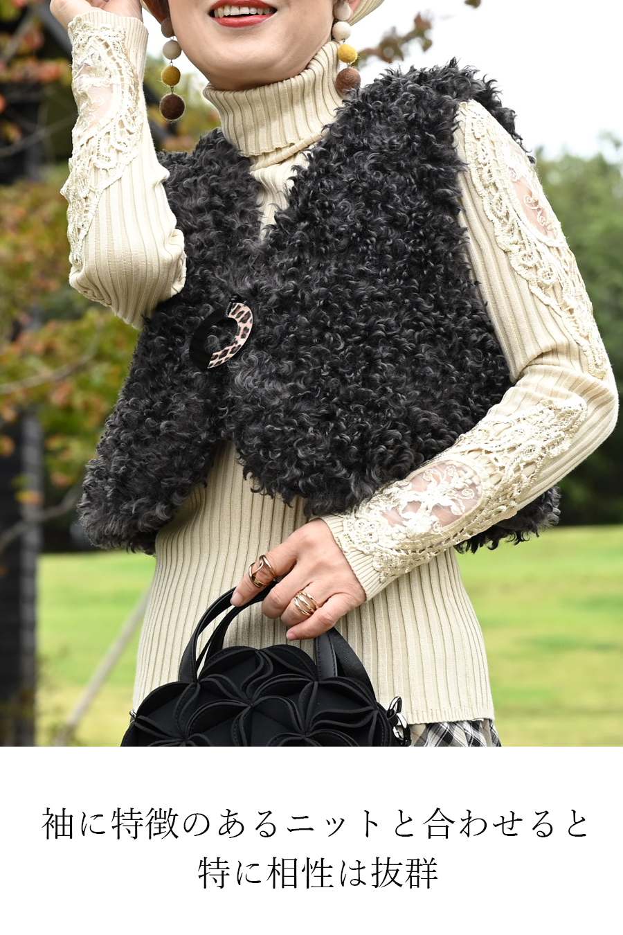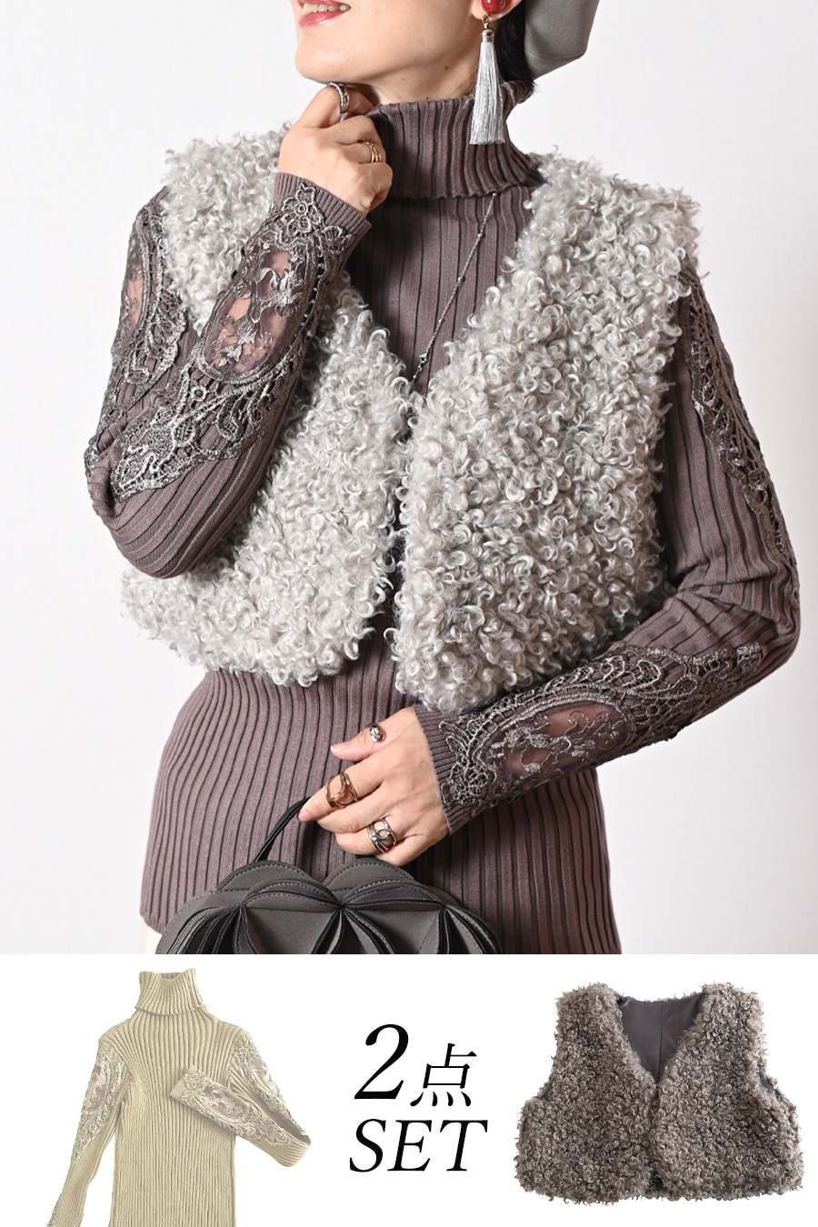 【Special Offer 45%OFF】美ゴージャスレースリブニットソー+プードルファーショートベスト2点セットコーデ