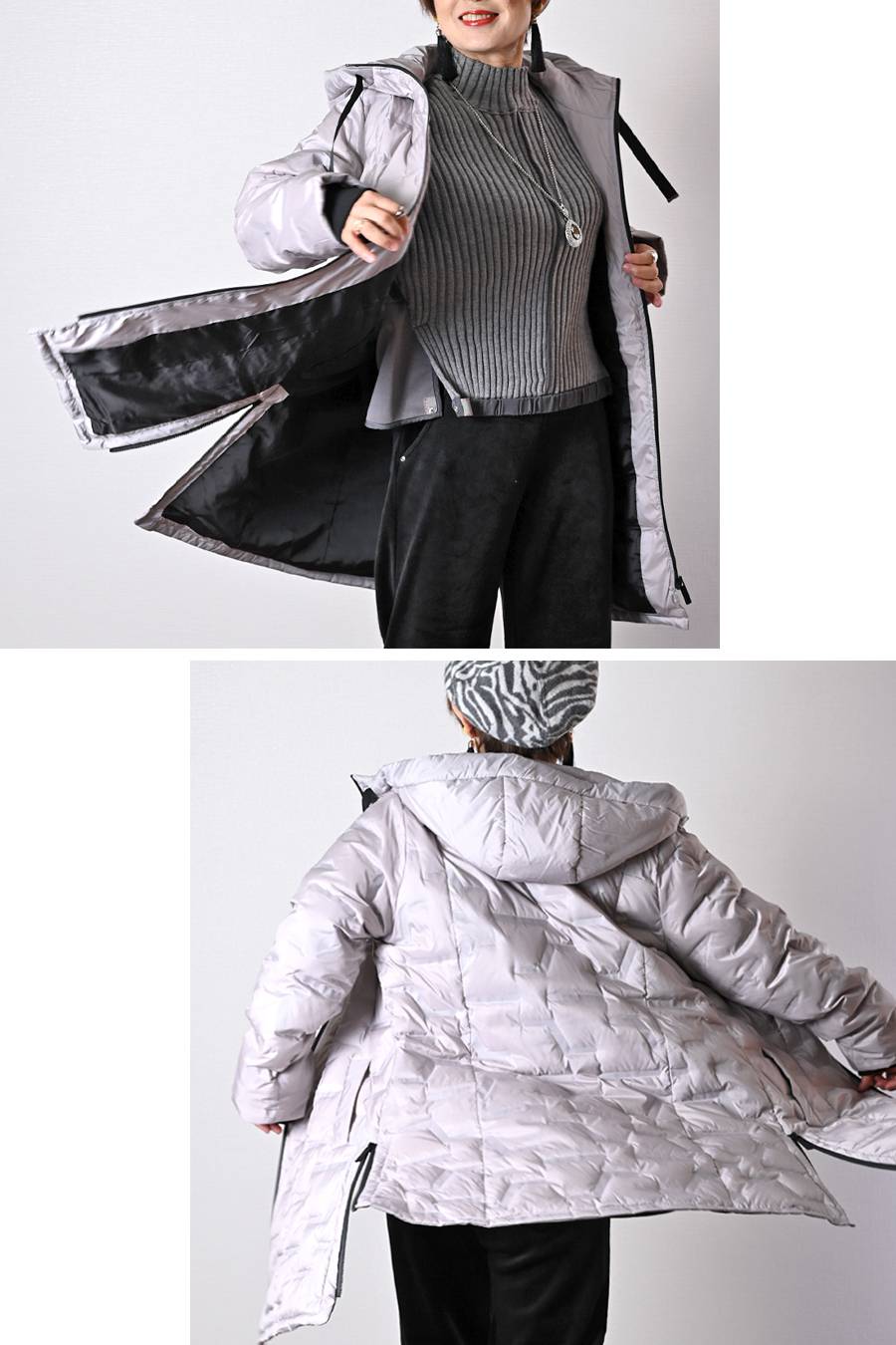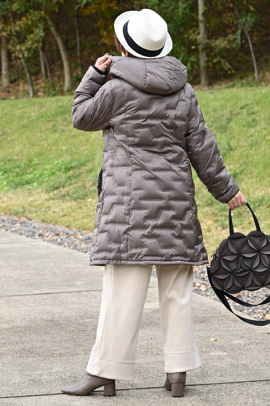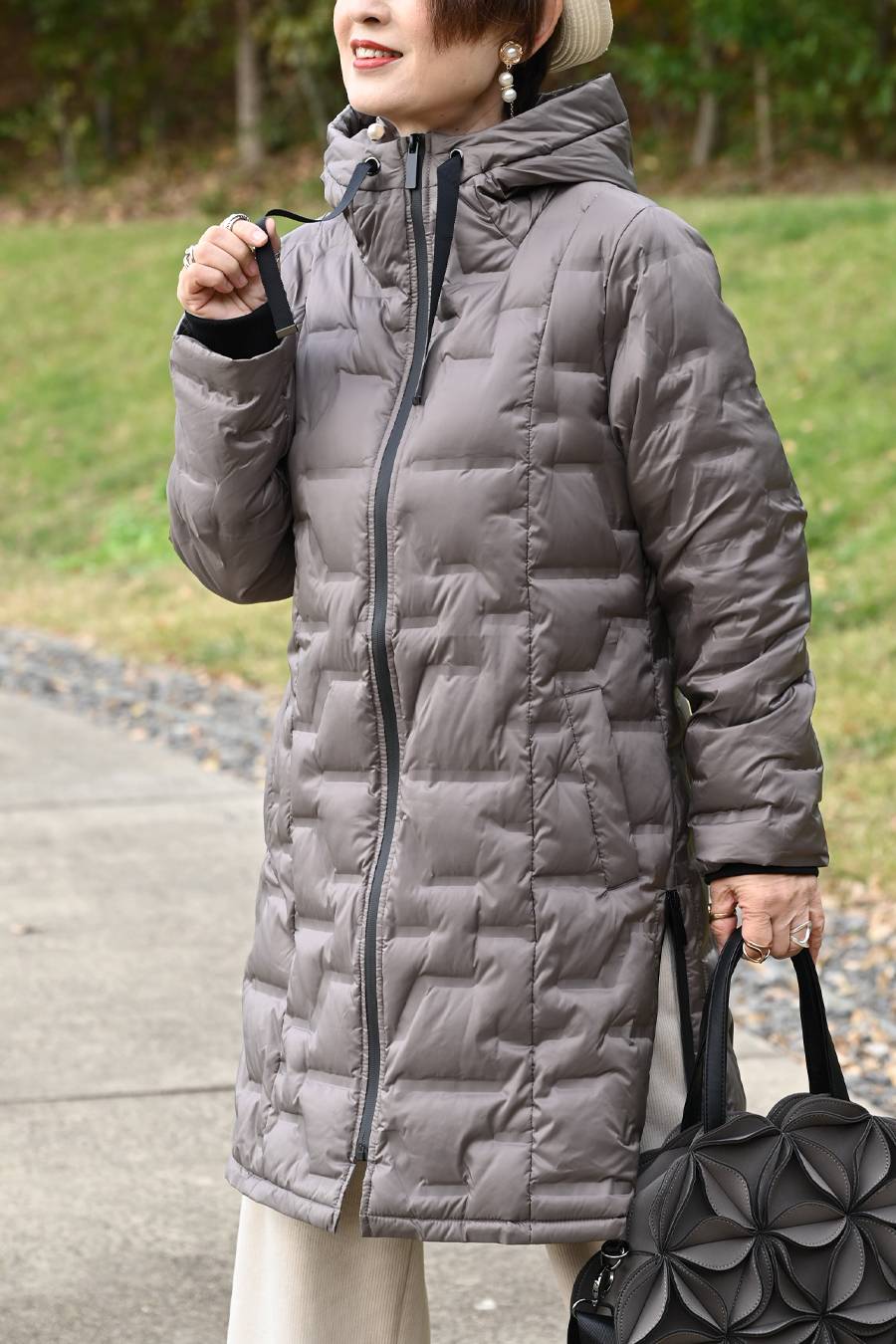 表情豊かなシームレスのラインがスタイリッシュな印象の軽量ロングダウンコート