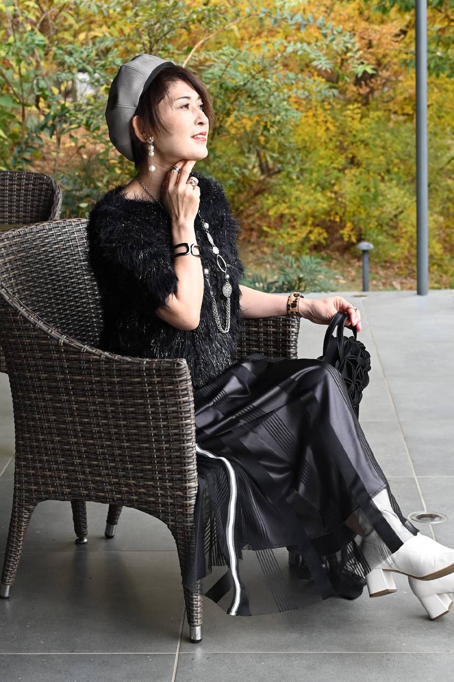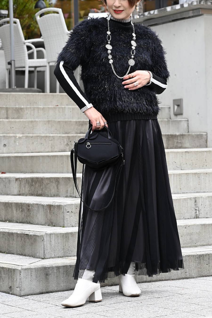 スカートもゴージャスなアイテムを合わせるとワンピースに負けない華やかな大人のリュクスなコーデに