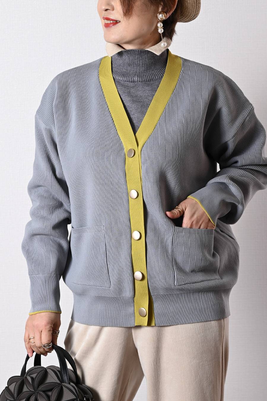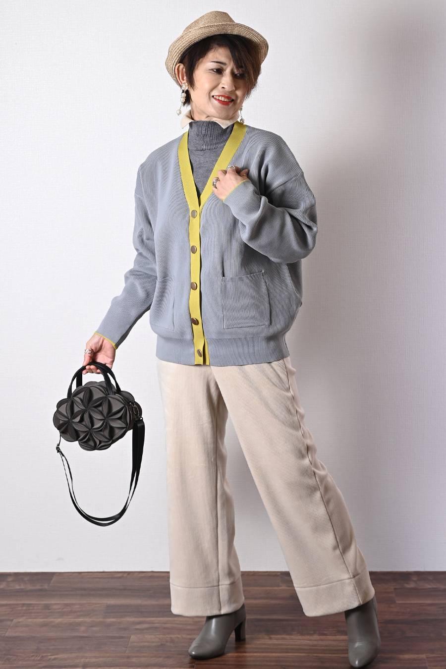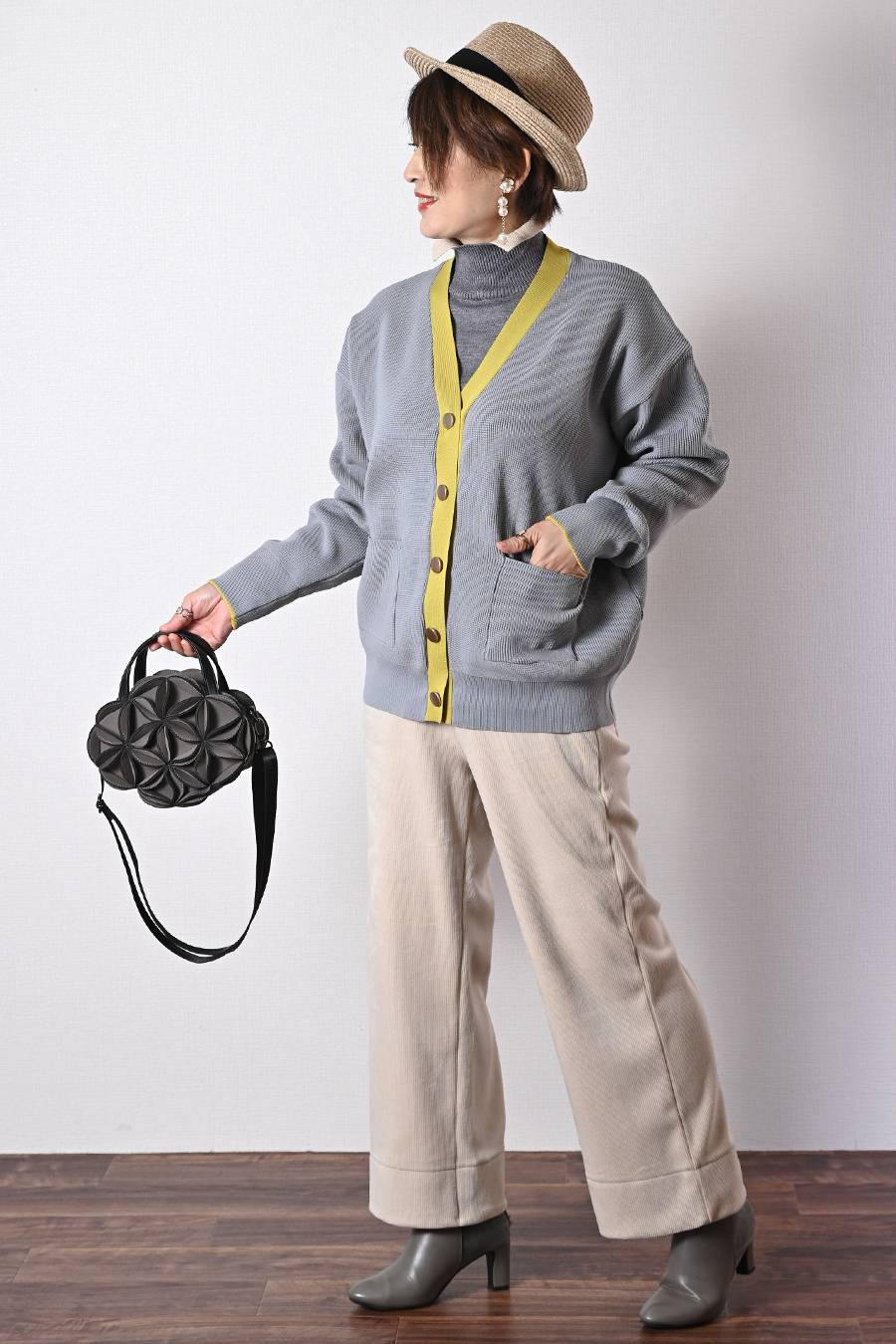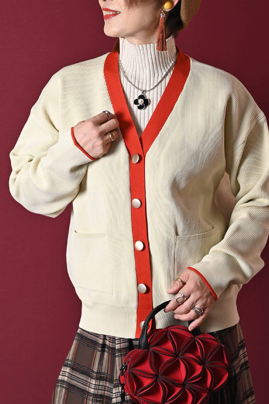 衿周りと前立てのはっきりとした配色が着こなしのアクセントになるカーディガン