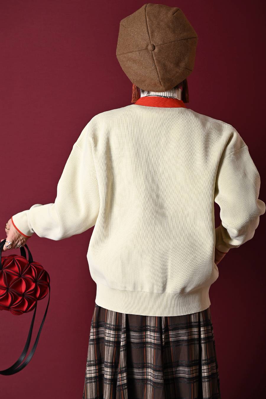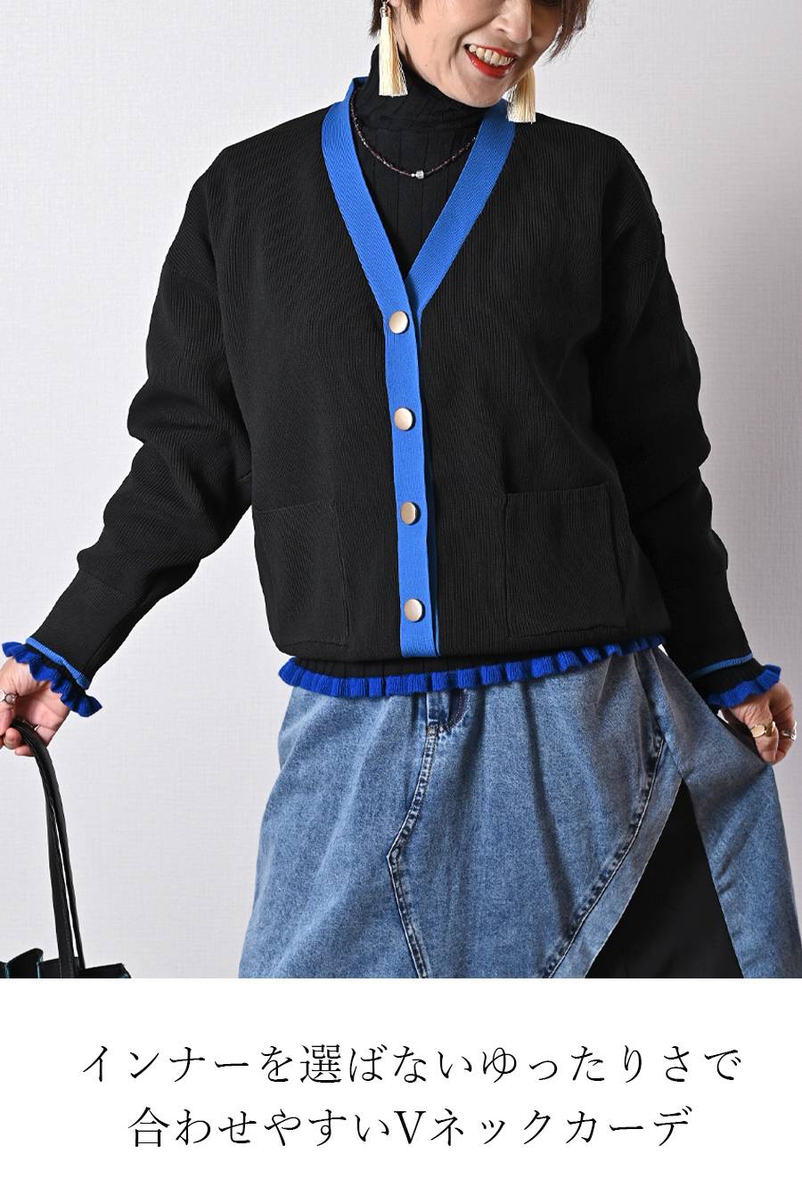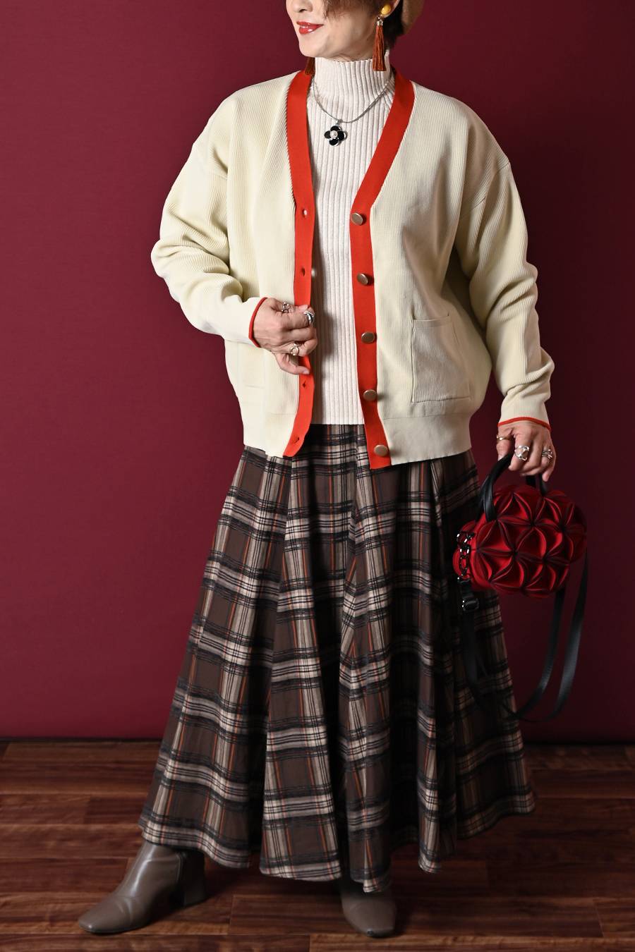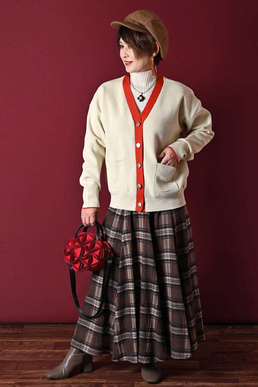 衿周りと前立てのはっきりとした配色が着こなしのアクセントになるカーディガン
