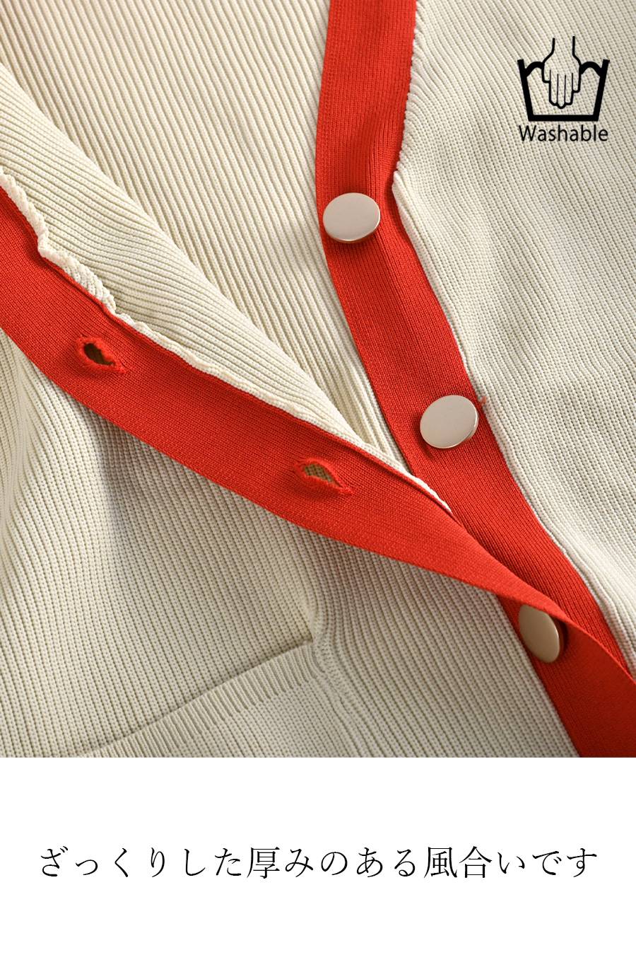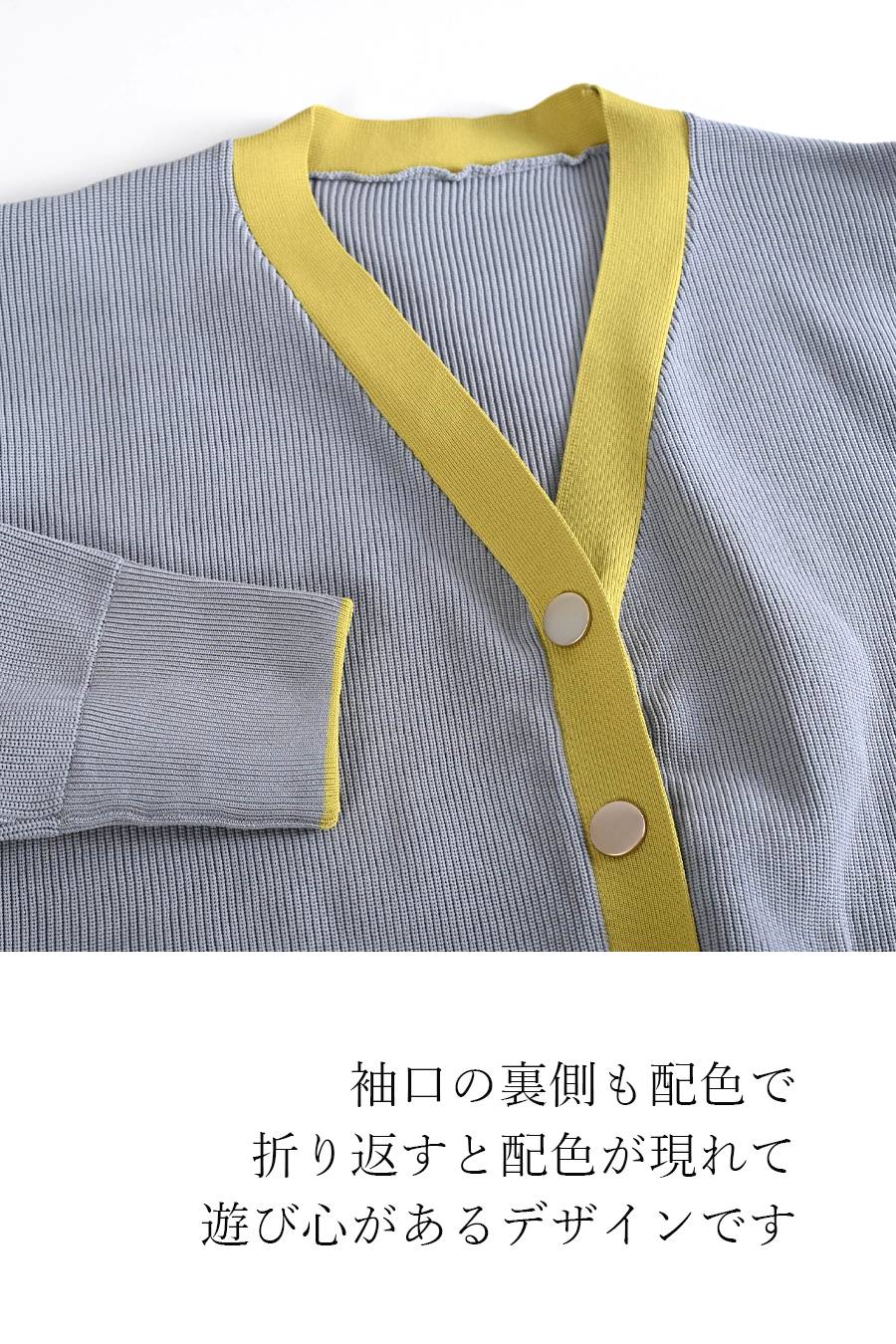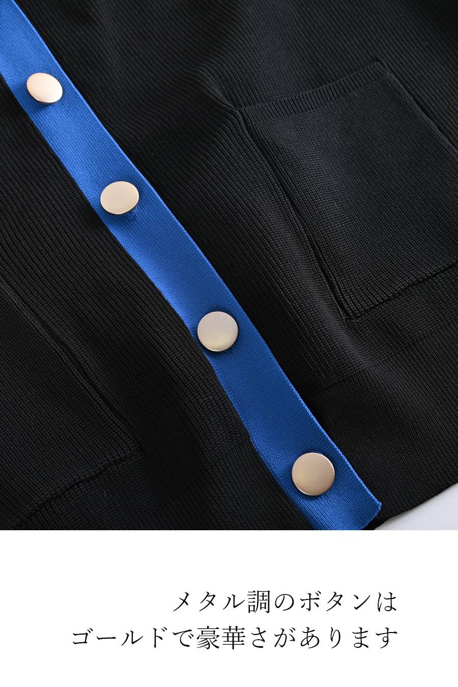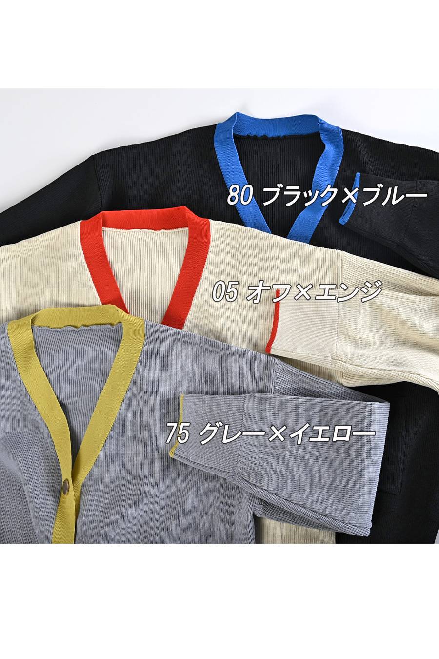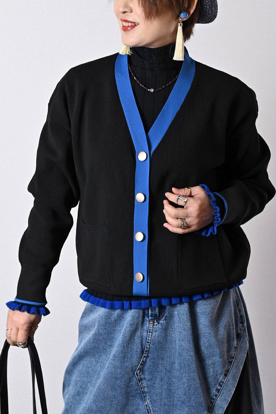 衿周りと前立てのはっきりとした配色が着こなしのアクセントになるカーディガン