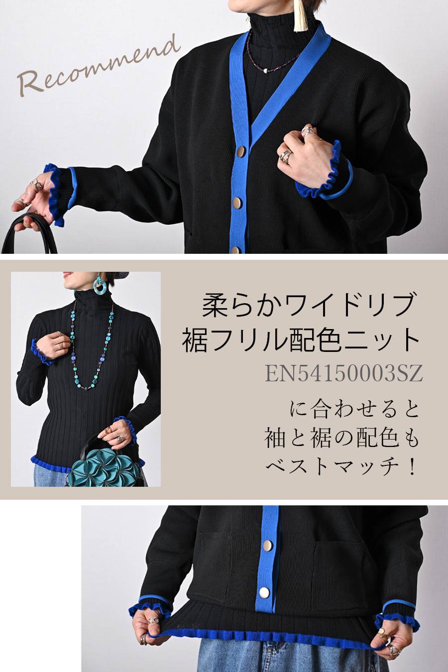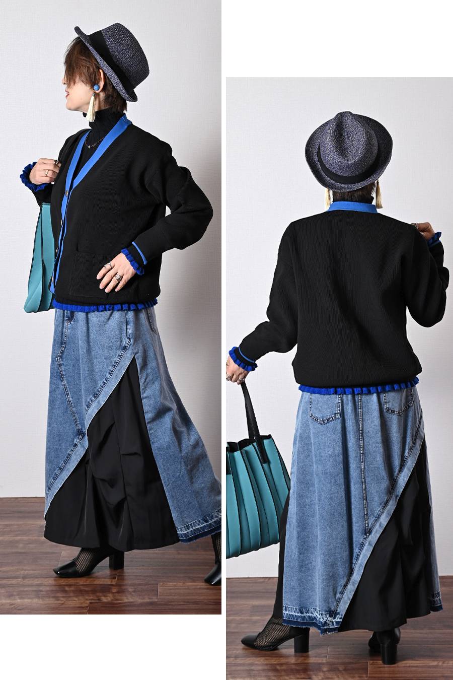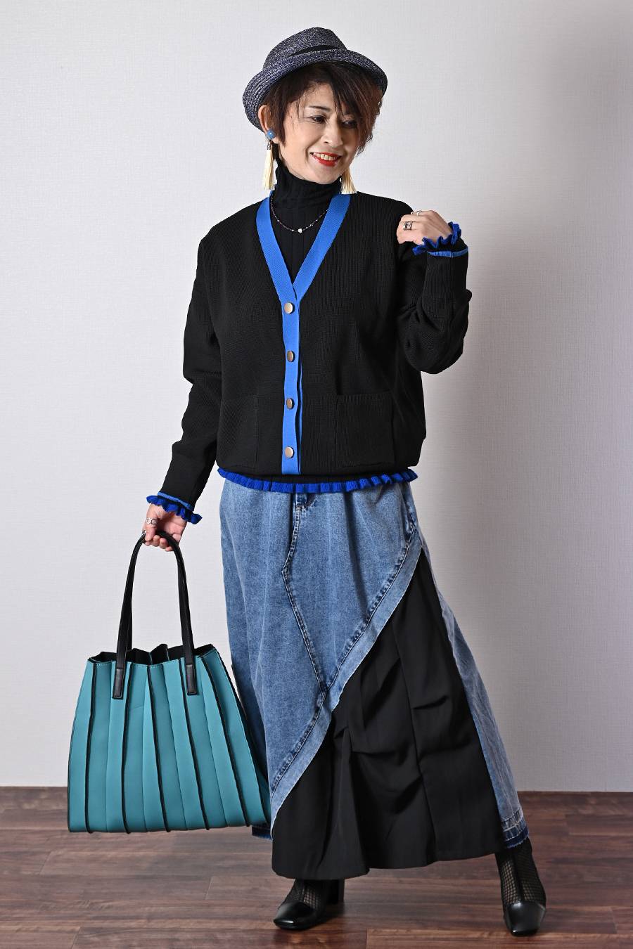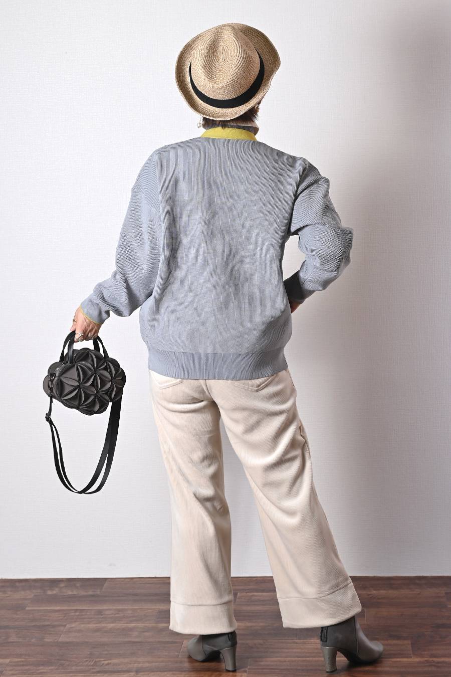 衿周りと前立てのはっきりとした配色が着こなしのアクセントになるカーディガン