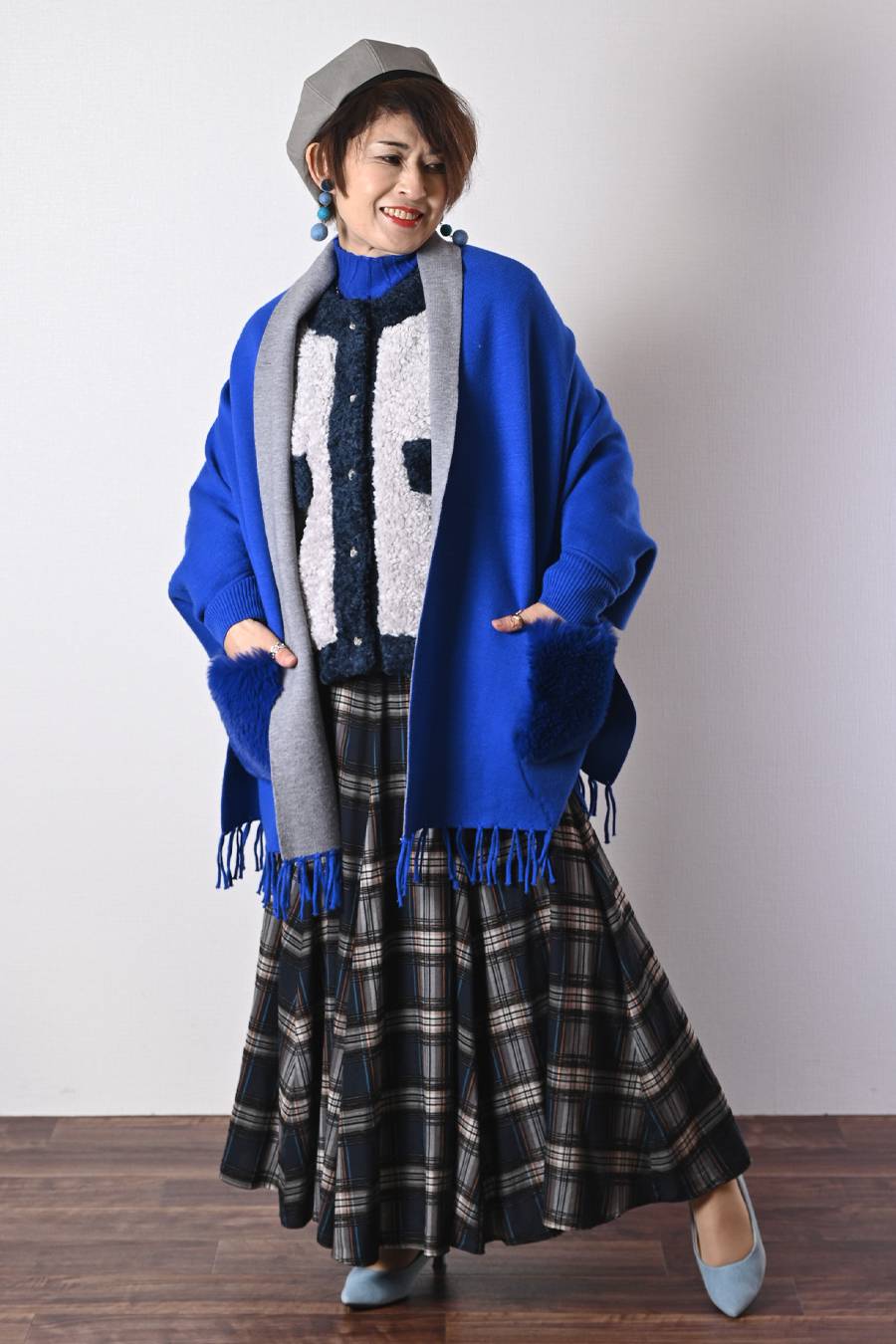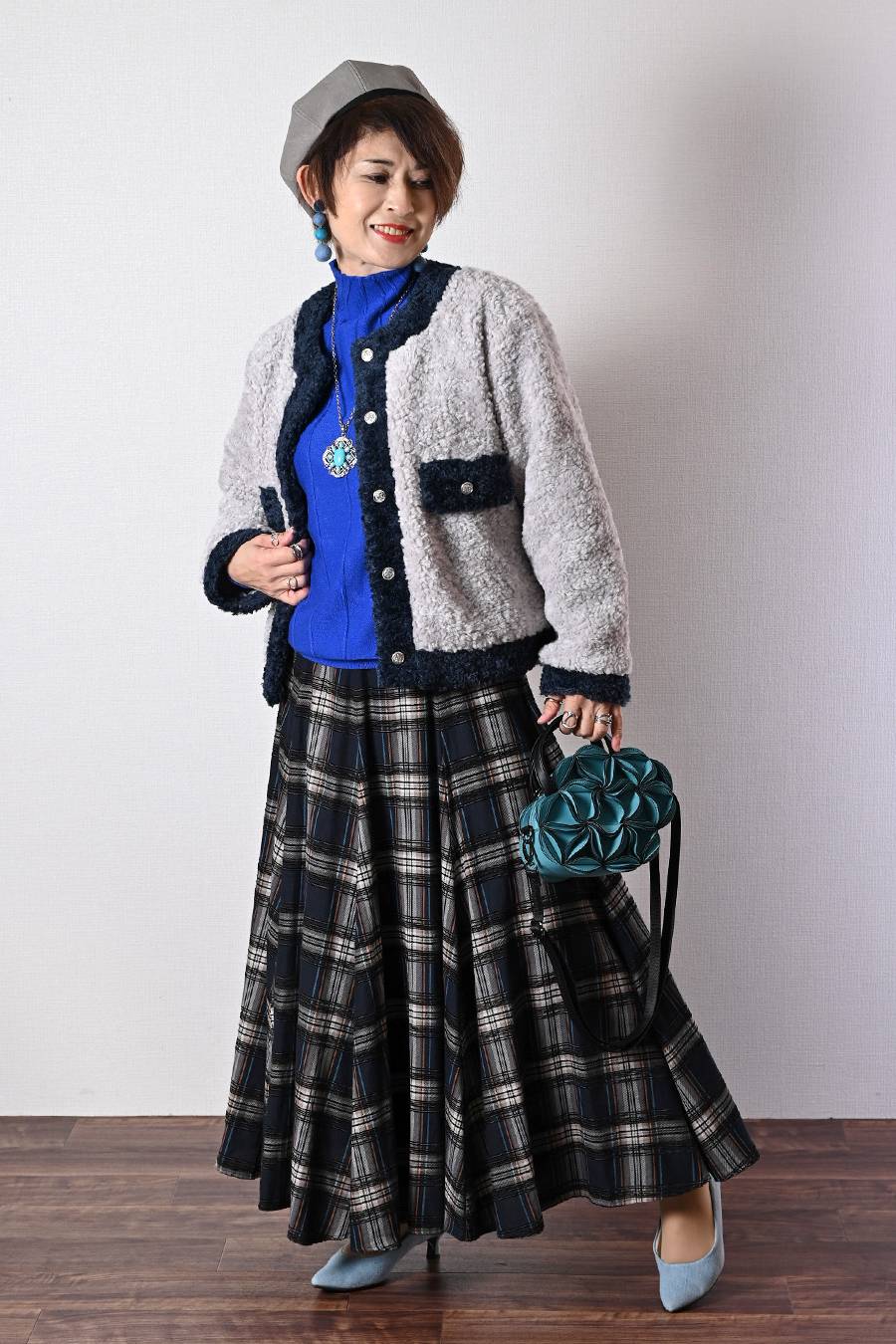 ソフトポンチ×タフタ切り替えジャケット+ジャガード多色チェックスカート2点セットコーデ
