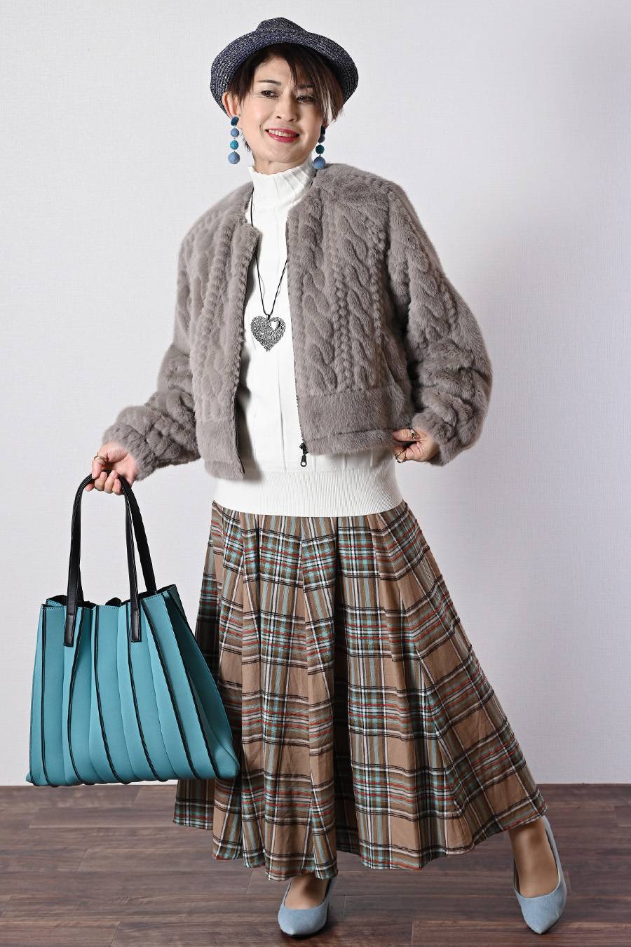 ソフトポンチ×タフタ切り替えジャケット+ジャガード多色チェックスカート2点セットコーデ