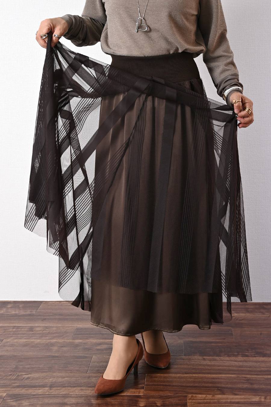 ポンチ&カットジャガードプルオーバー+カットジャガードフレアスカート2点セットコーデ