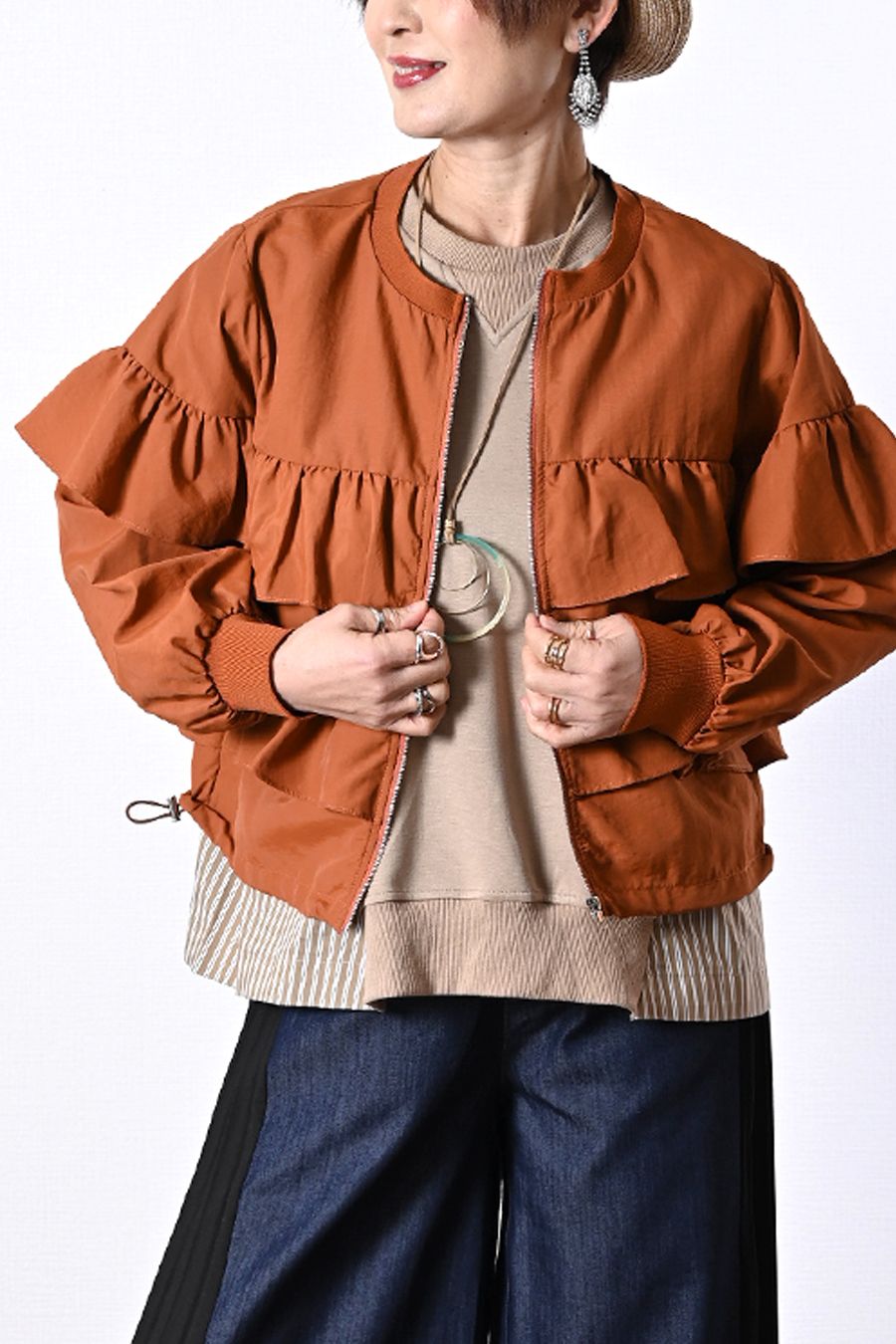 軽い着心地!ワッシャー(しわ加工)の素材に総フリルを施したフェミニンなティアードジャケット