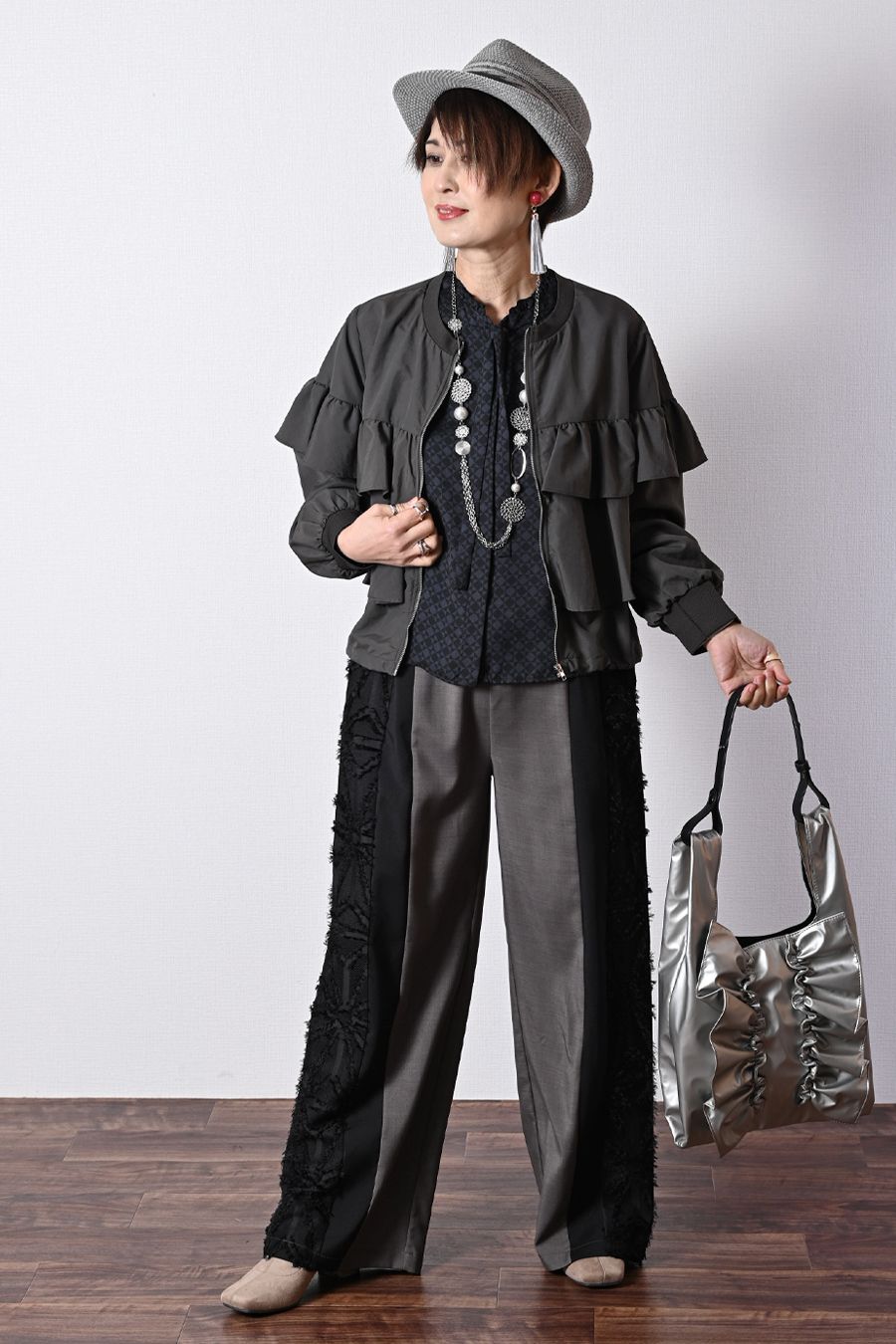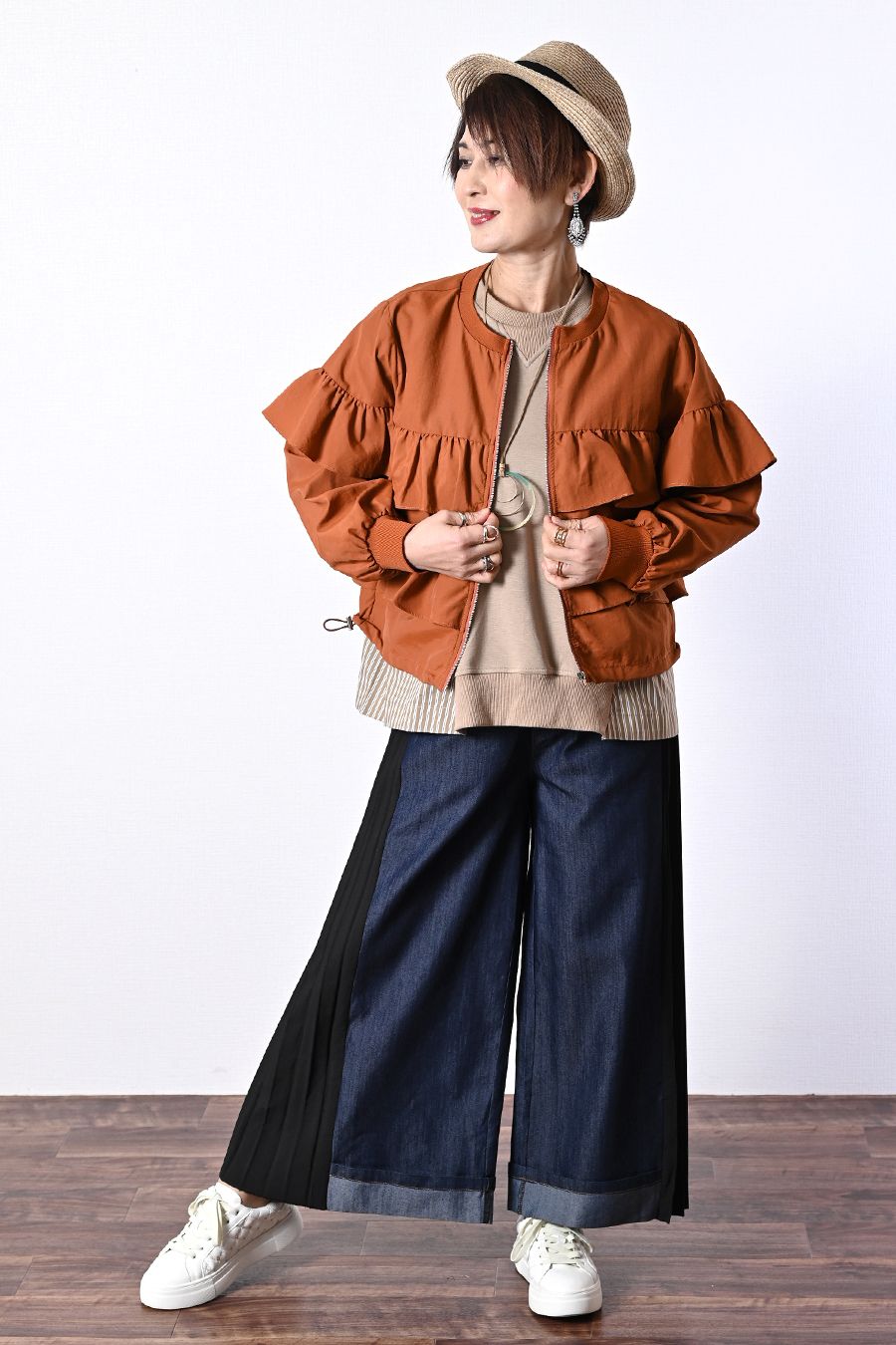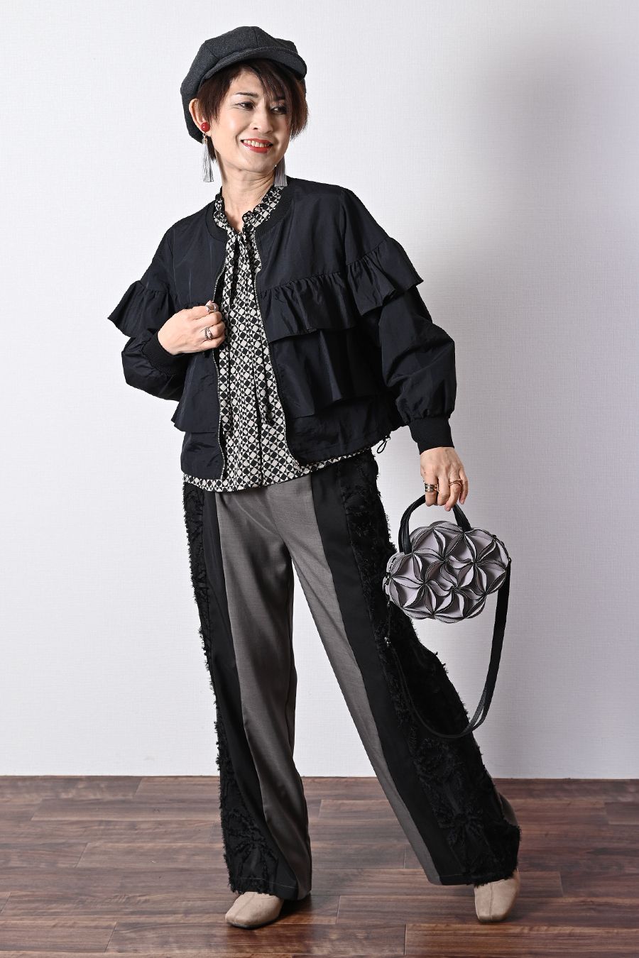 フリルの甘さにパンツを合わせるとバランスが良い甘辛コーデの完成!