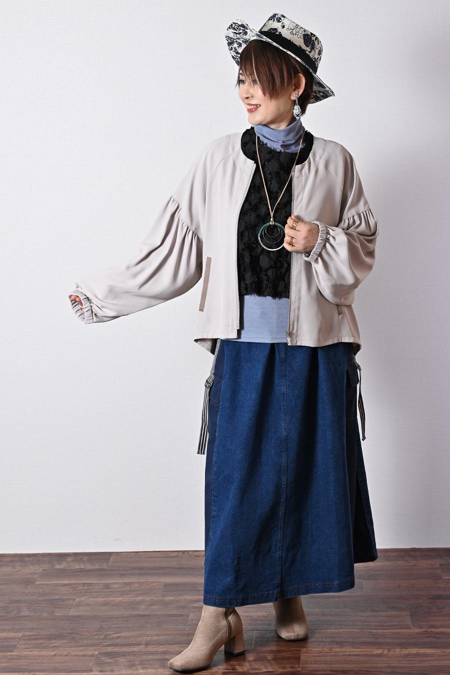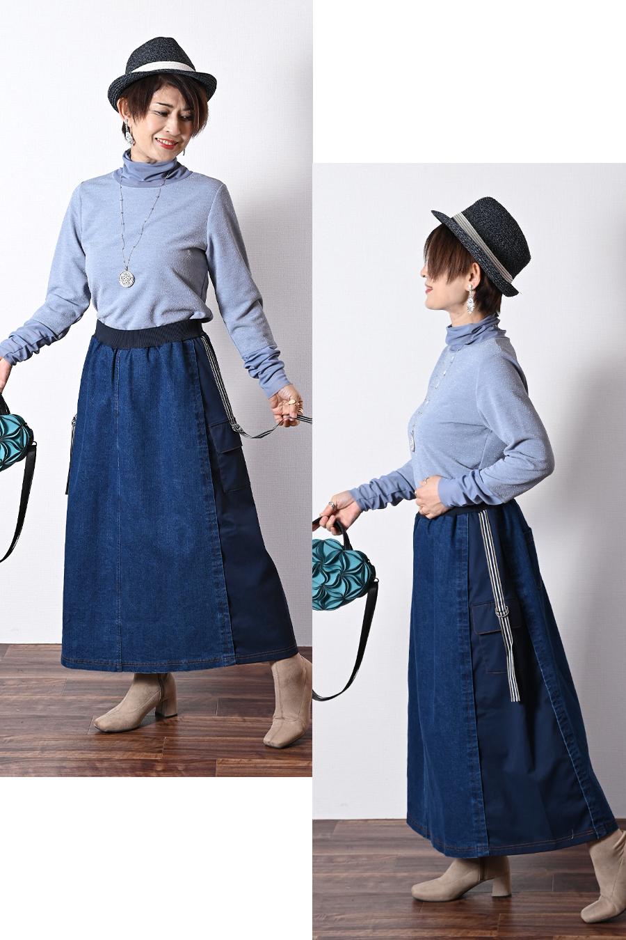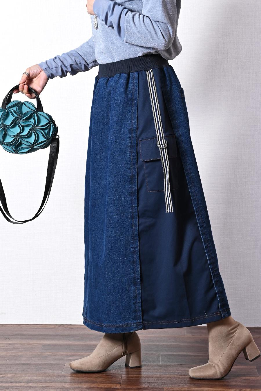 ラフな表情のデニムとキレイな表情のツイルのドッキングデニムスカート