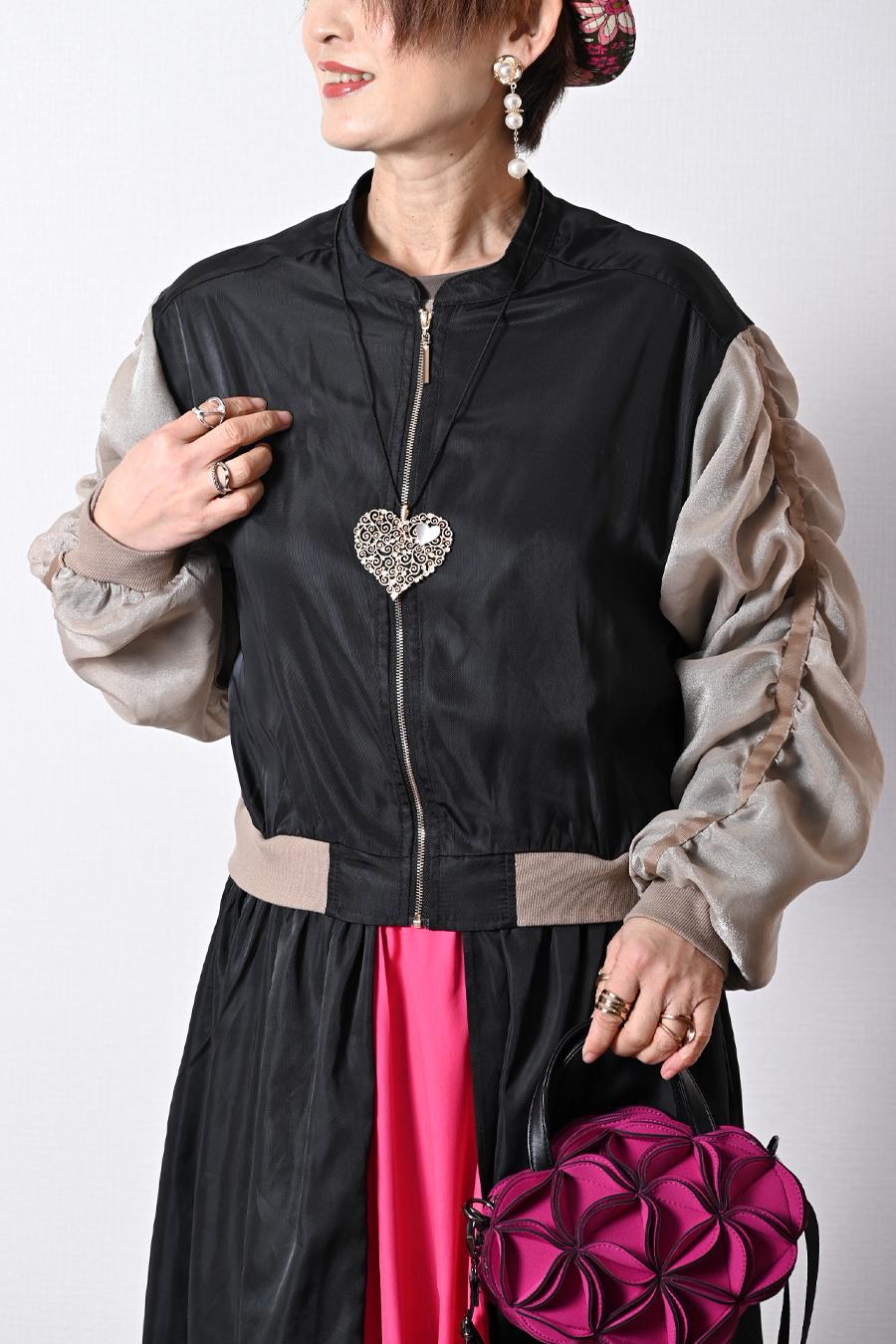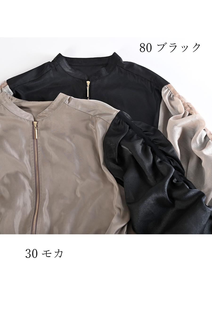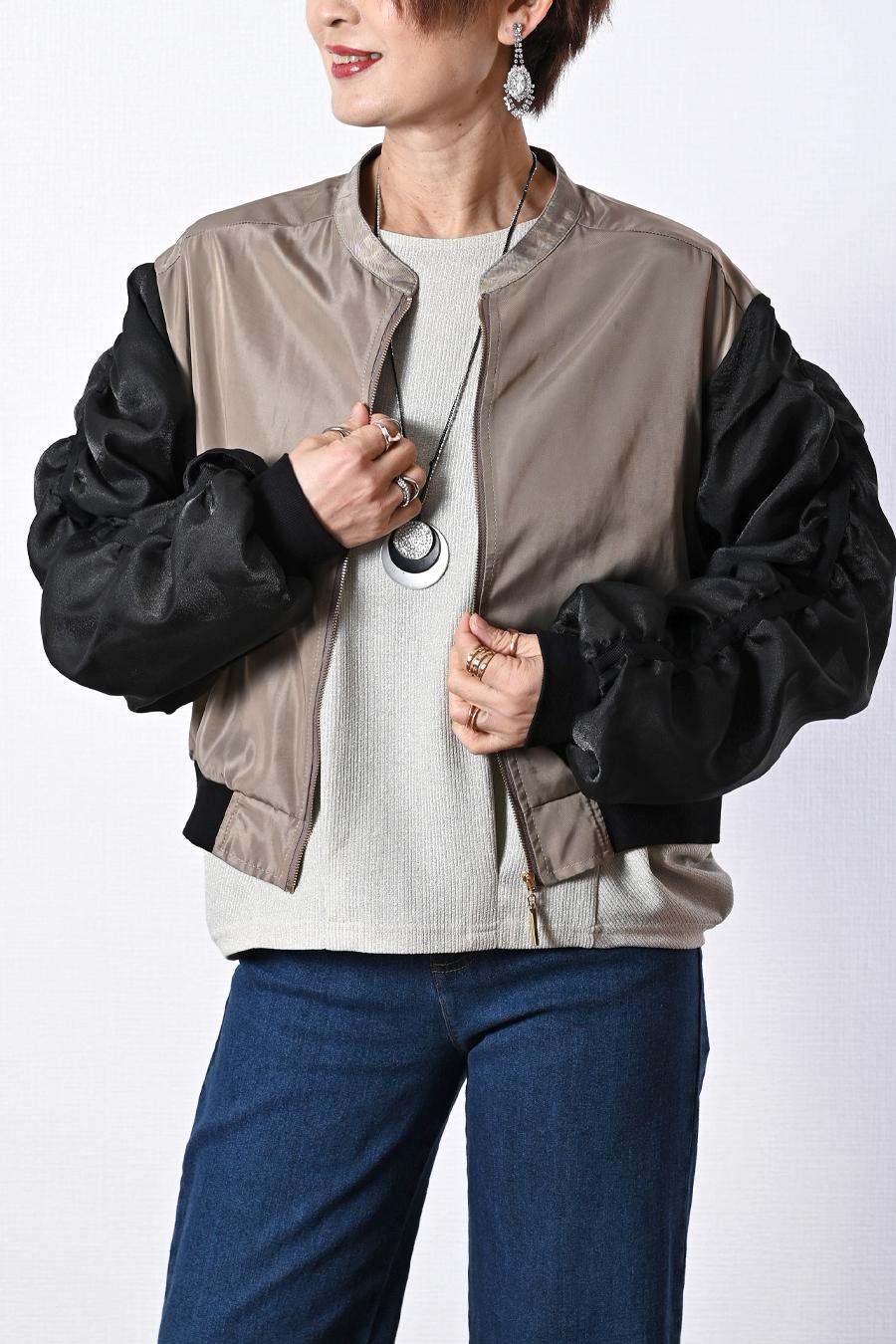 光沢のあるツイル素材のボディとラメ入りシアー素材の袖のドッキング