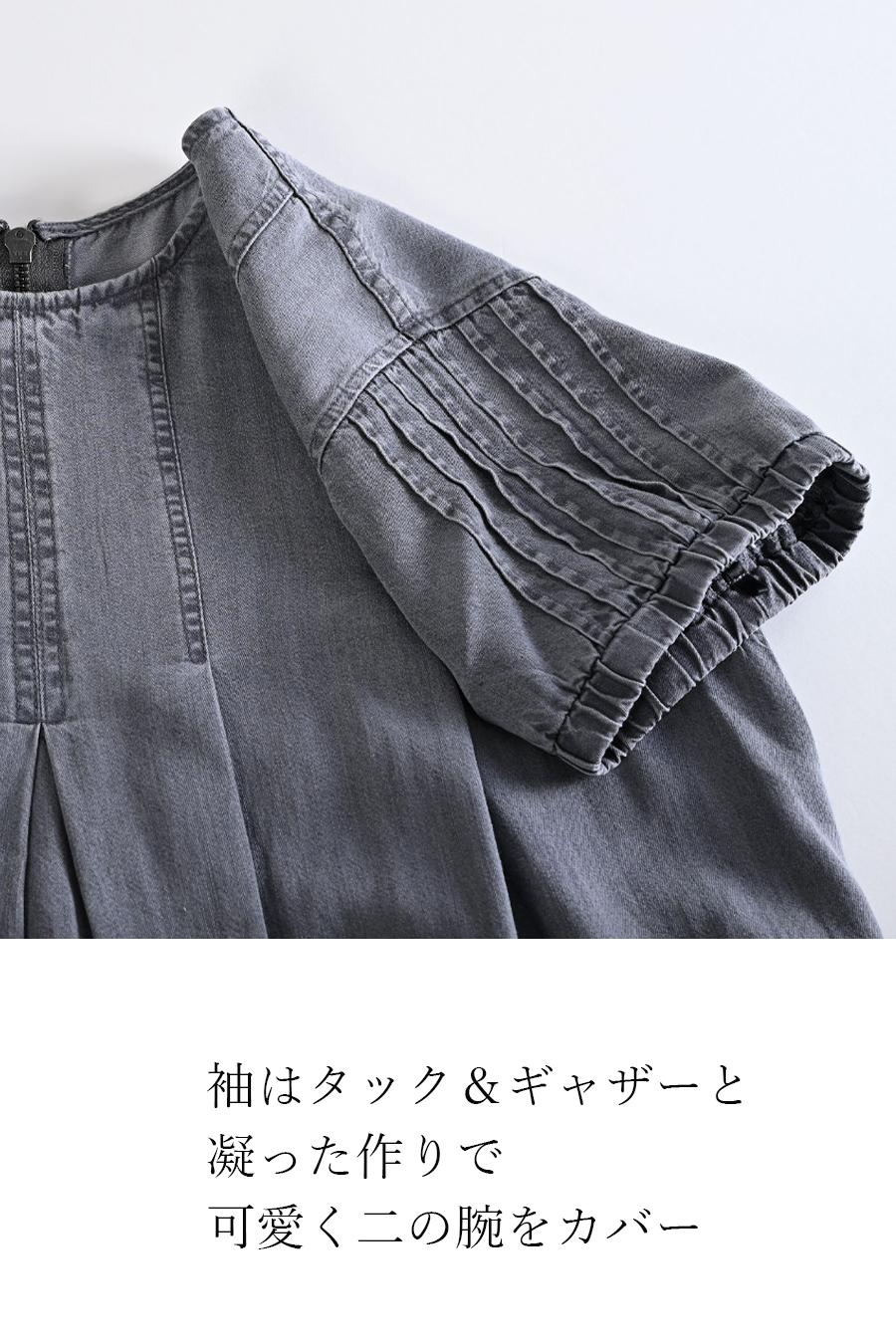袖はタック&ギャザーと凝った作りで可愛く二の腕をカバー