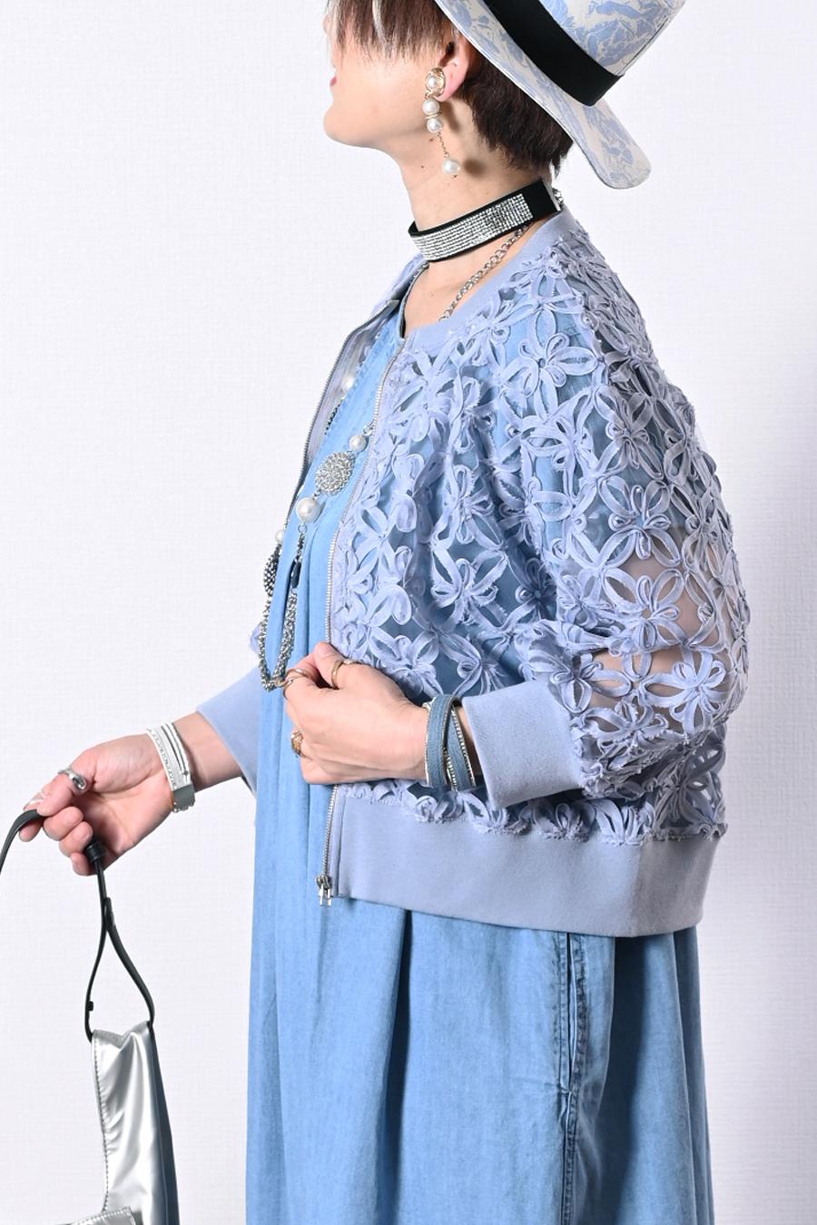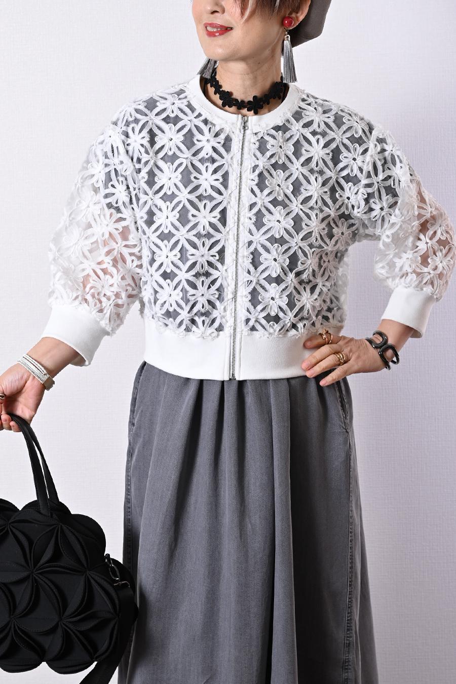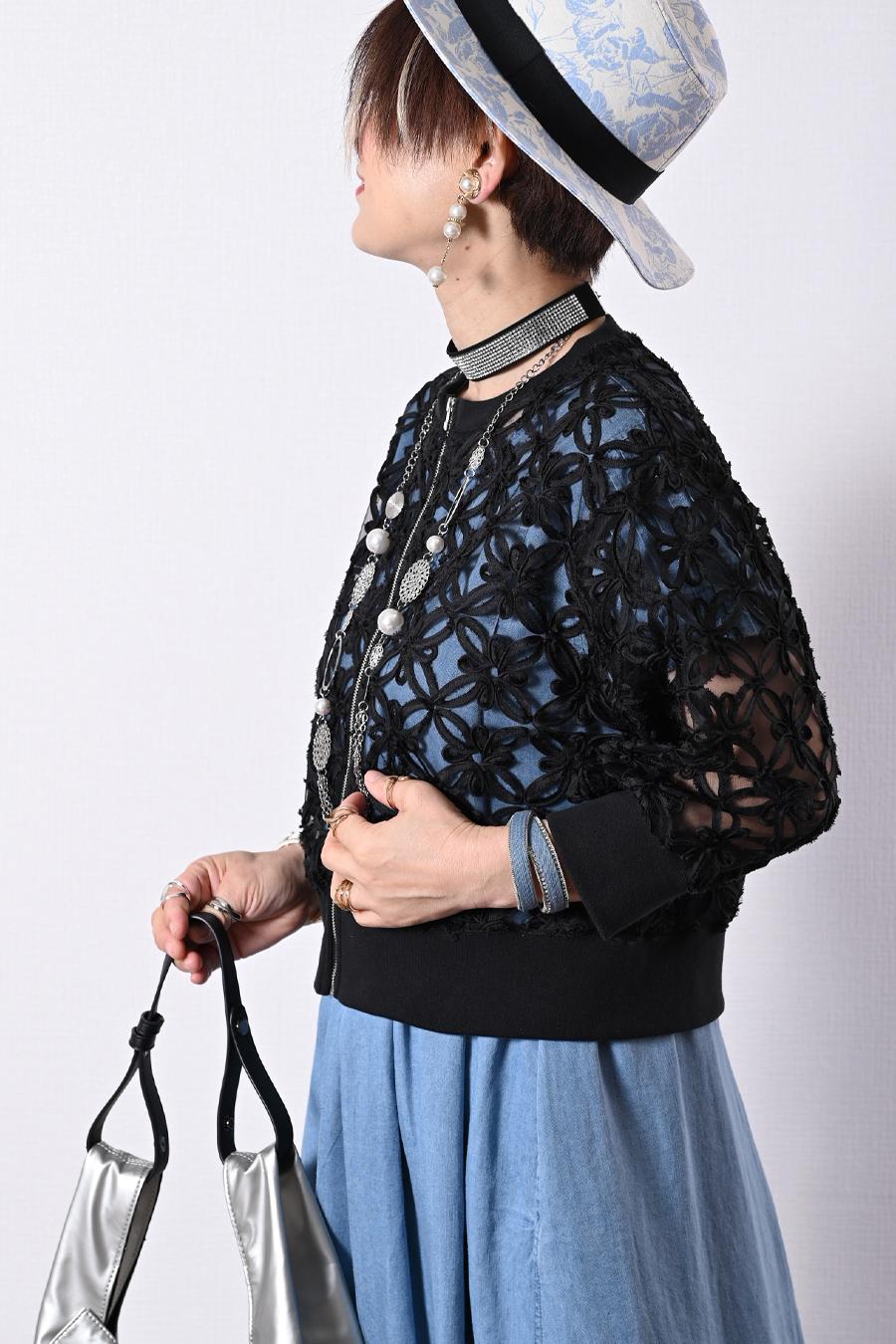 チュール素材をベースに、切りっぱなしのフラワー柄コード刺繍がとても目を惹く華やかショートジャケット
