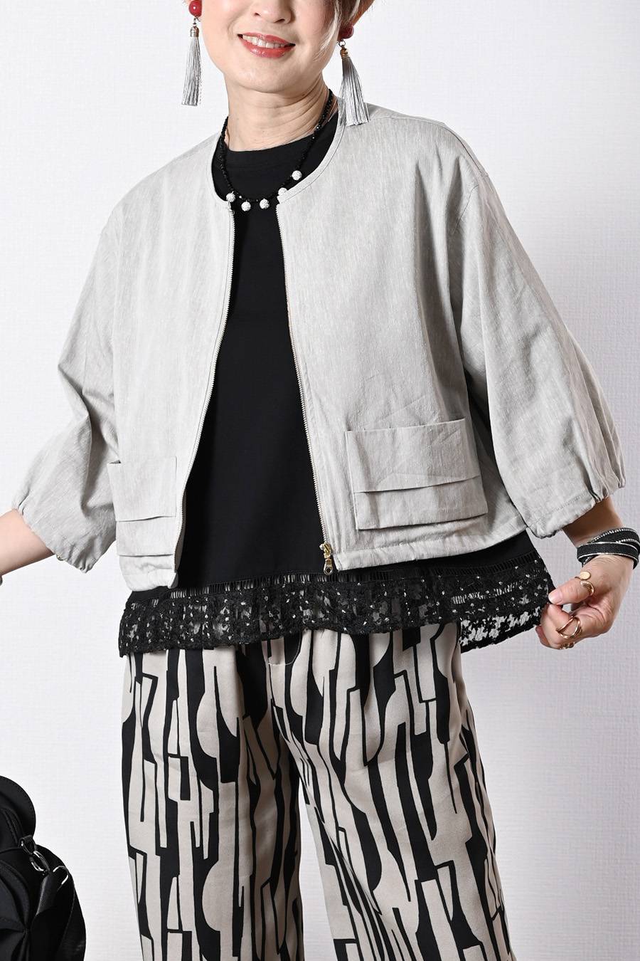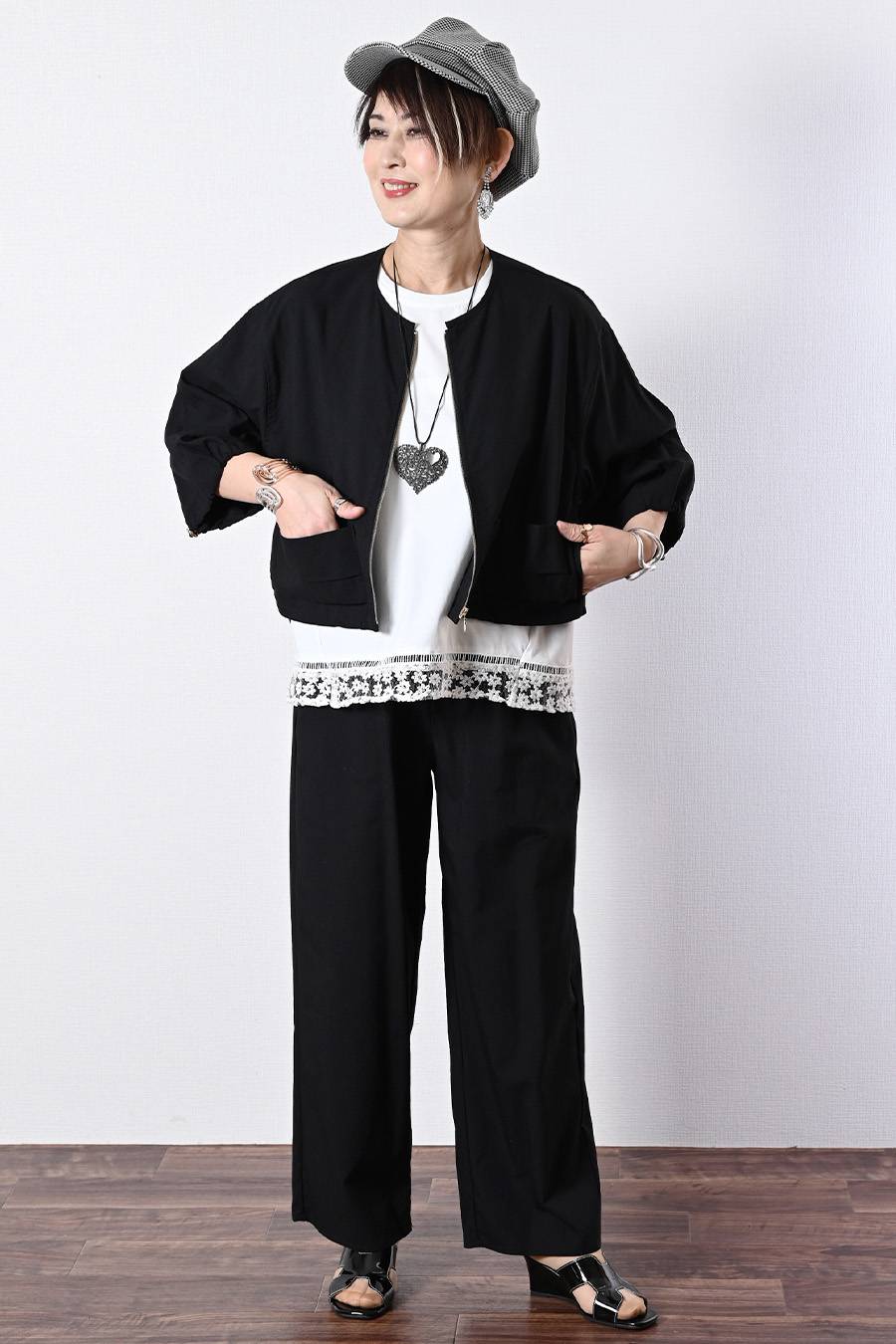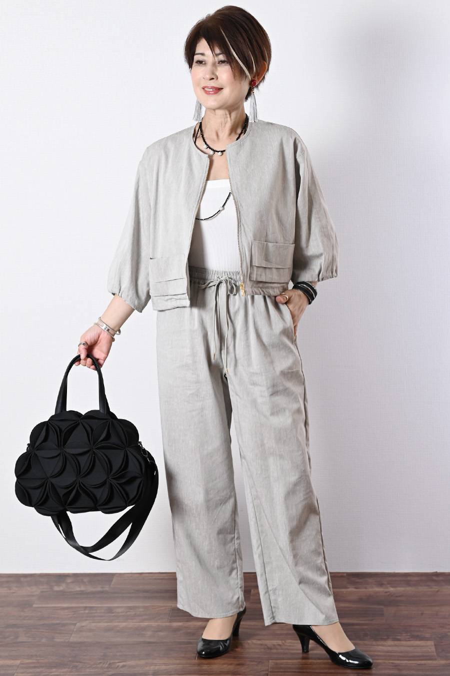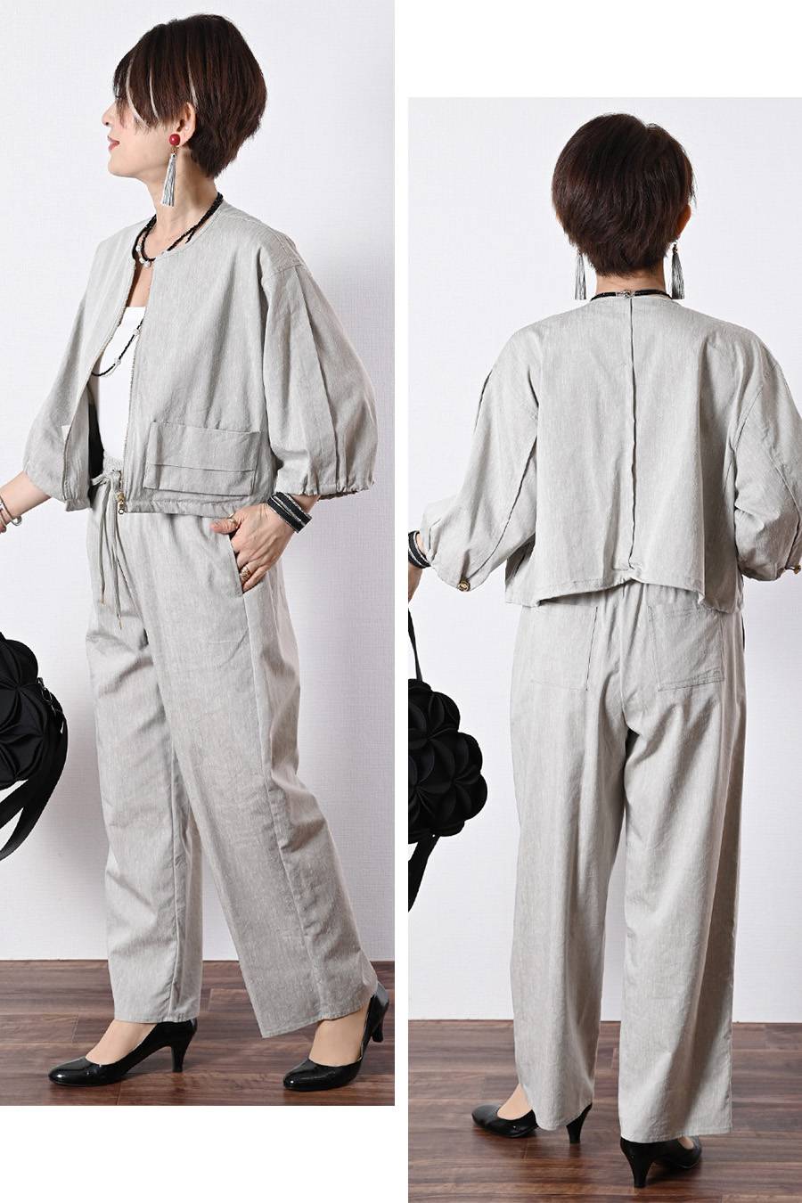 同素材のパンツと合わせて、スタイリッシュで軽やかなお仕事スタイルに。季節の変わり目(春・秋)や、夏の冷房対策としても重宝する軽快な一着です。