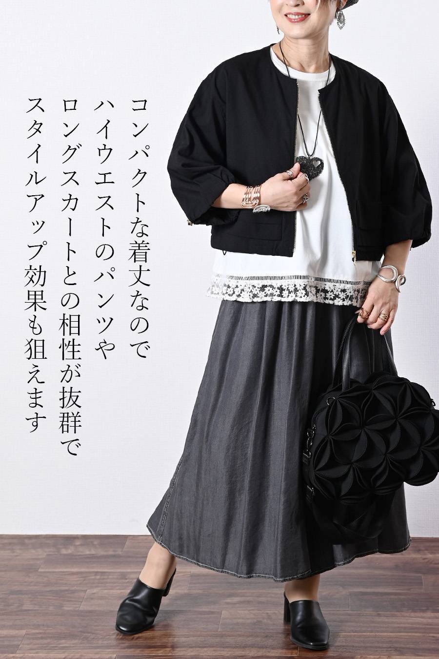 ボトムスを選ばないコンパクトな着丈。ハイウエストのパンツやロングスカートとの相性が抜群で、スタイルアップ効果も狙えます。