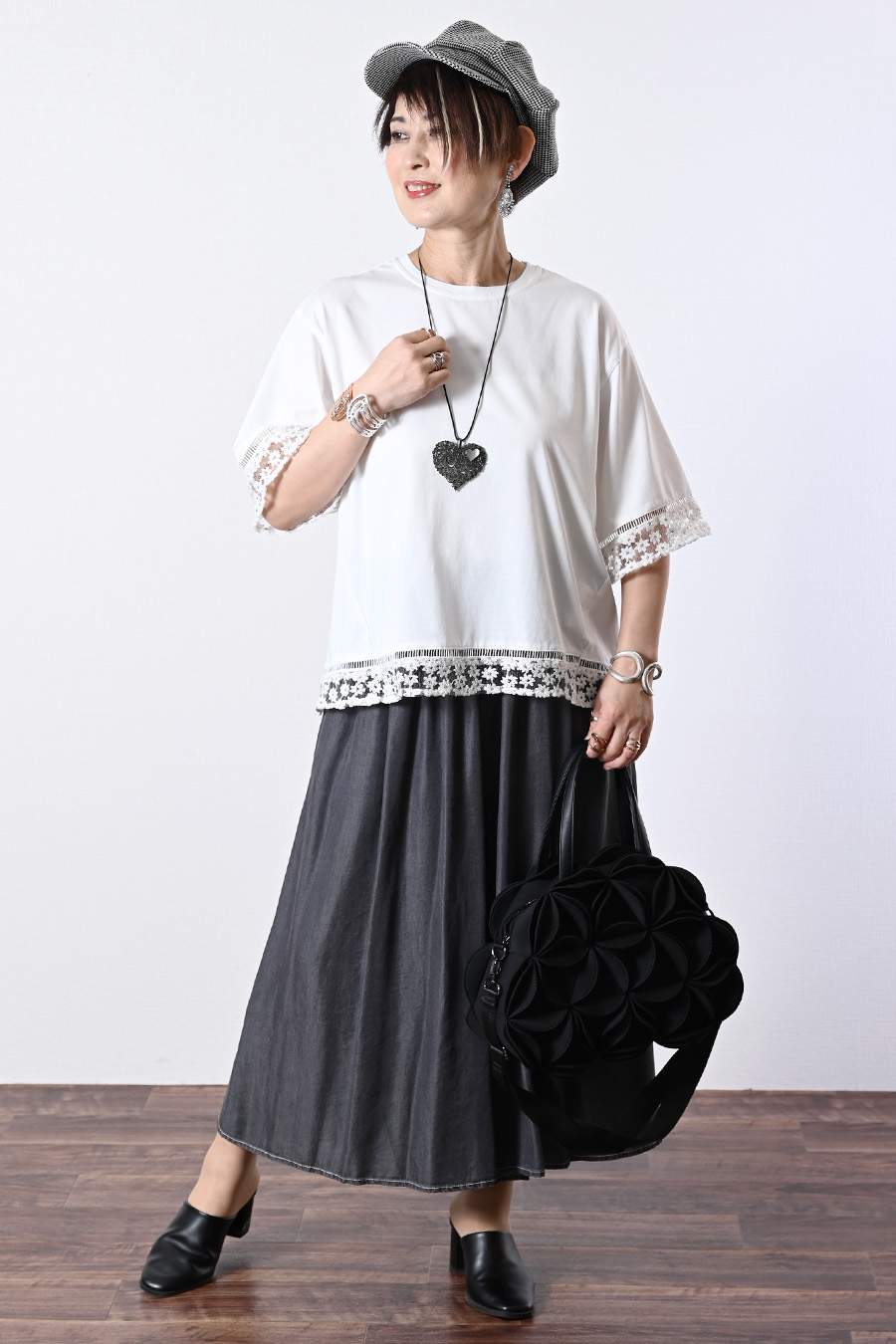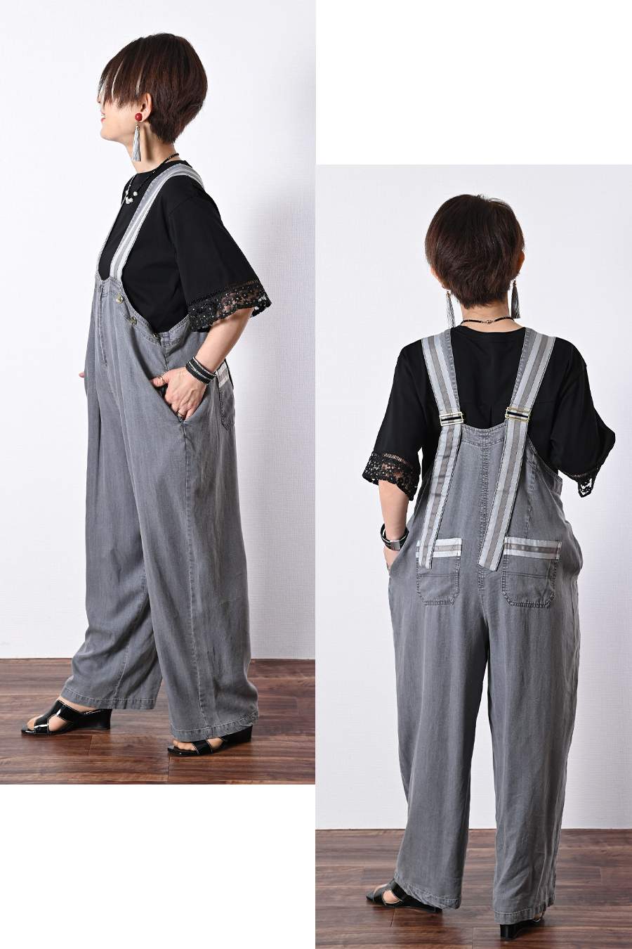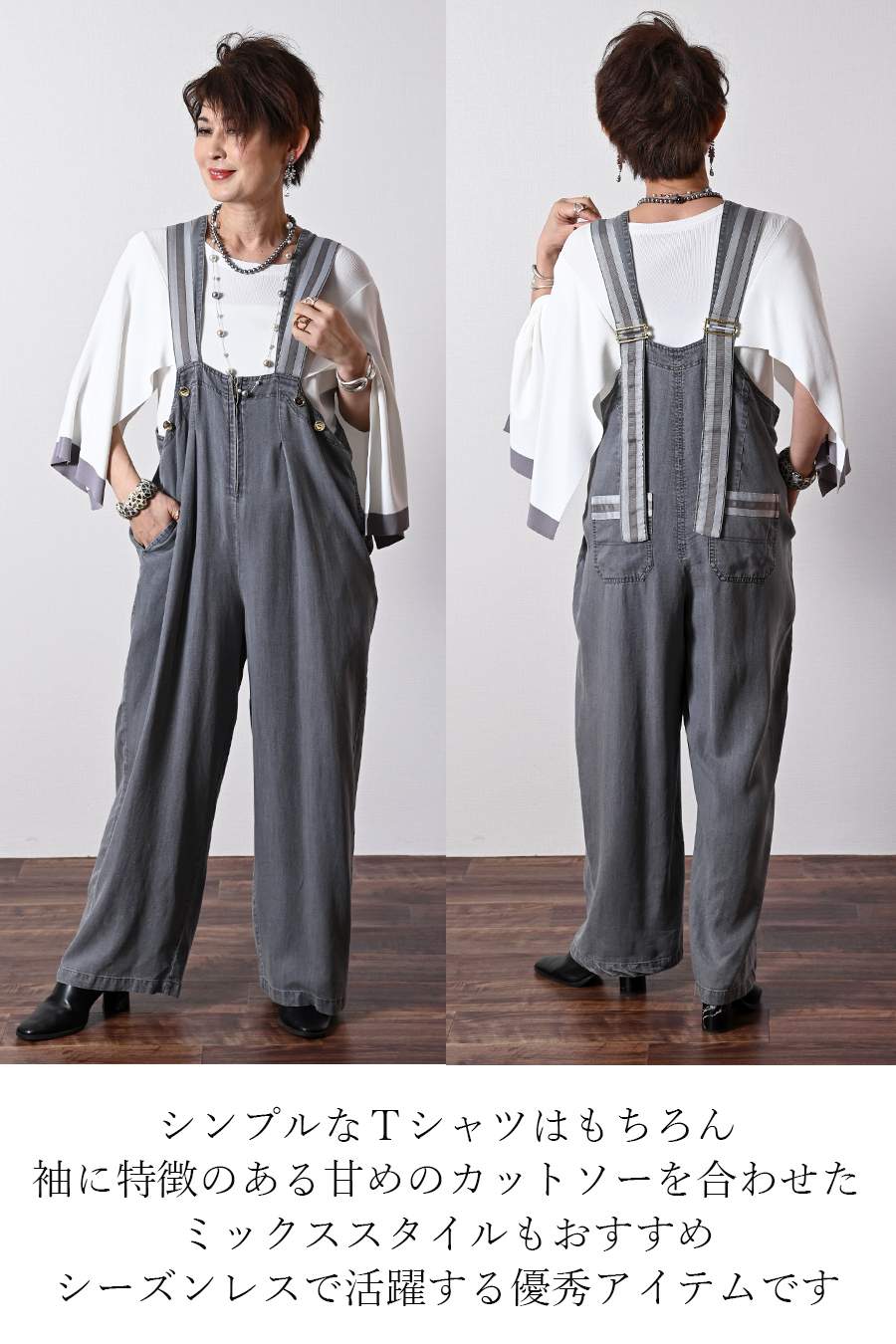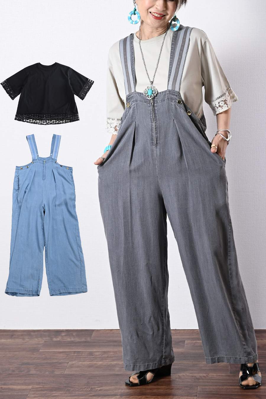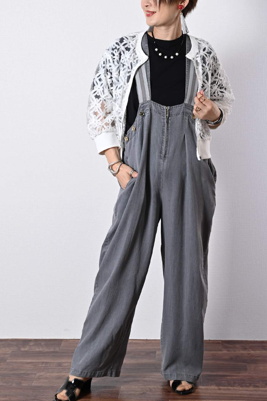 オーガンジーラメ糸刺繍カットソー+ワイドサロペット2点セットコーデ