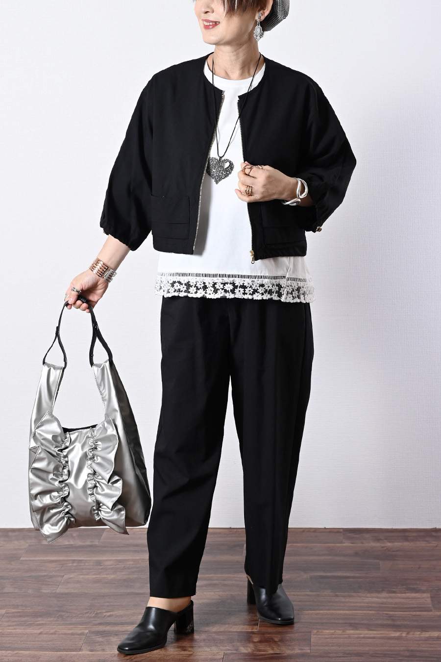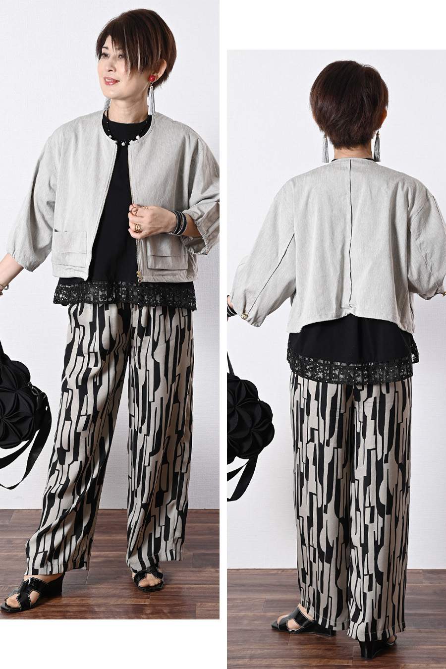 ポンチ切り替えプルオーバー+サイドプリーツワイドパンツ2点セットコーデ