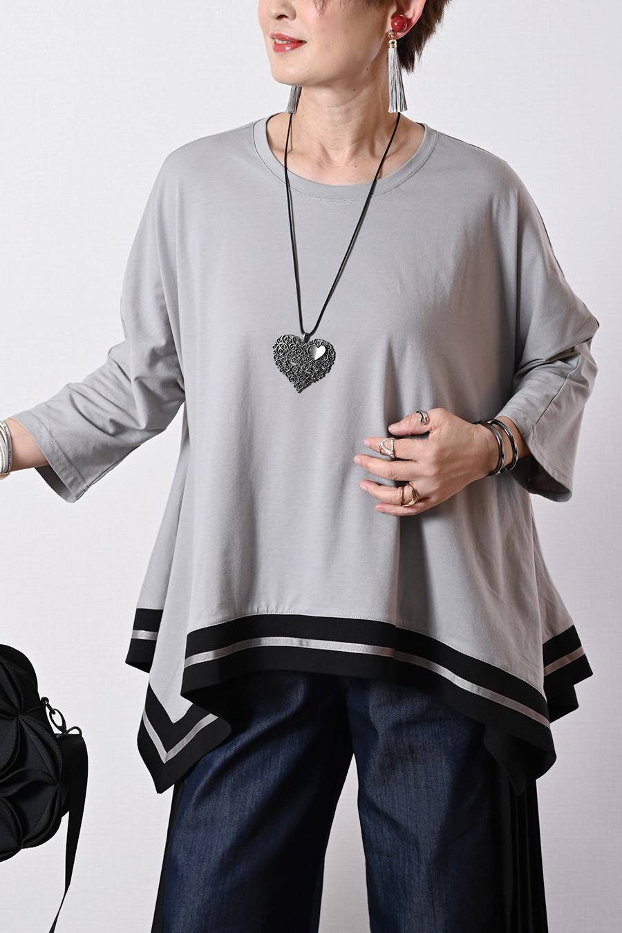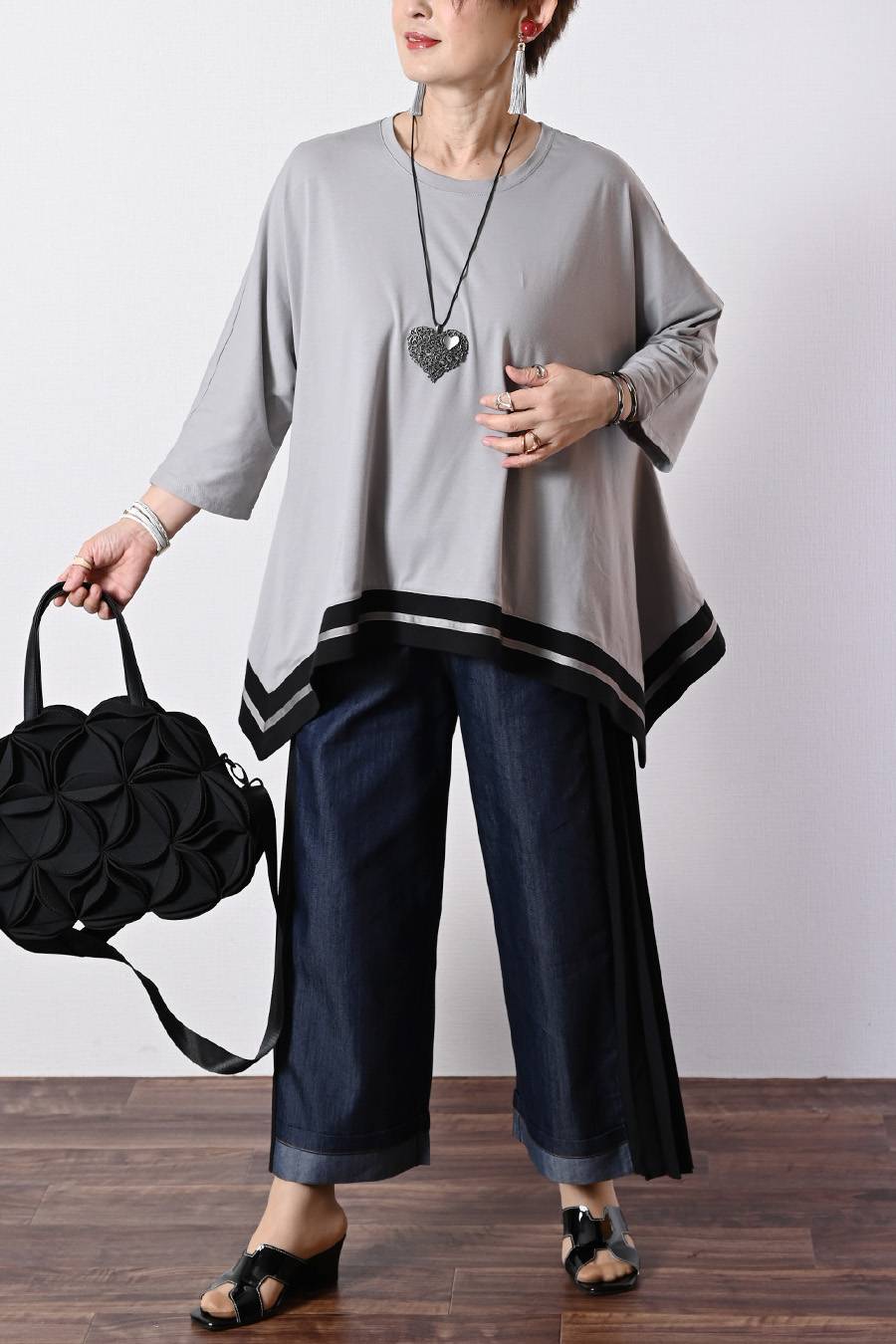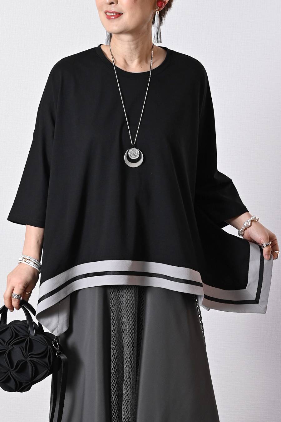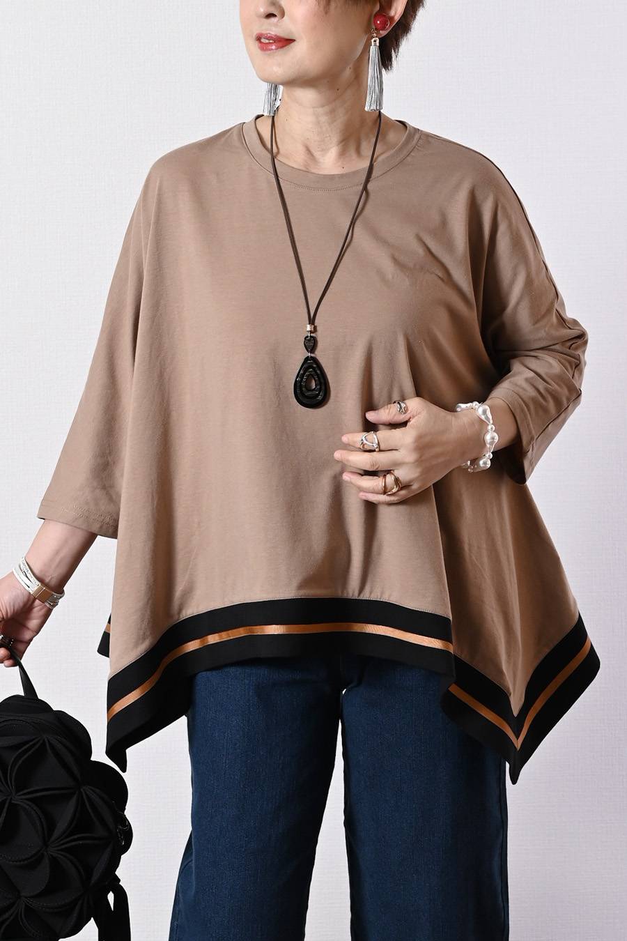 上品な光沢のライン使い(グログランテープ)と、7分袖のバランスが絶妙。カジュアルなカットソー素材ながら、ブラウス感覚で綺麗めにも着こなせる一着です。