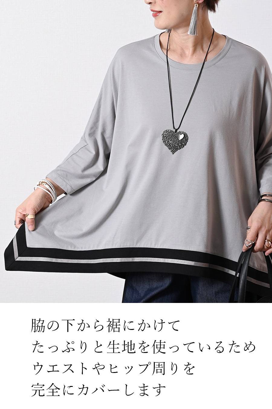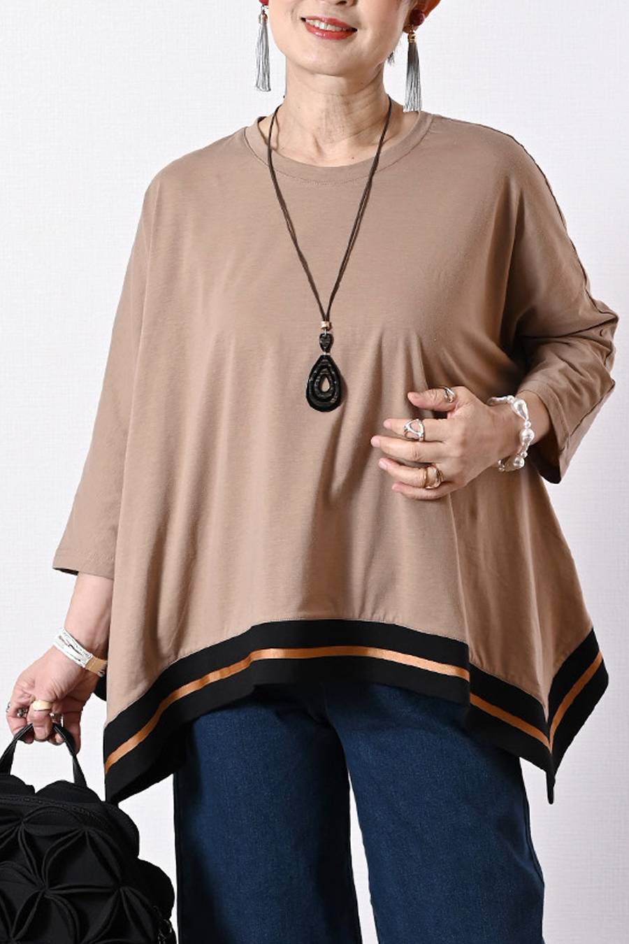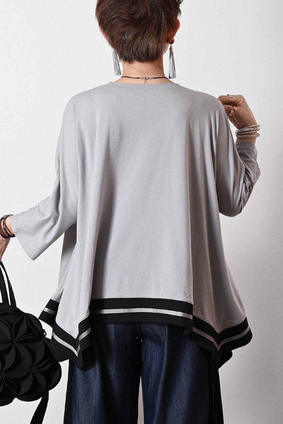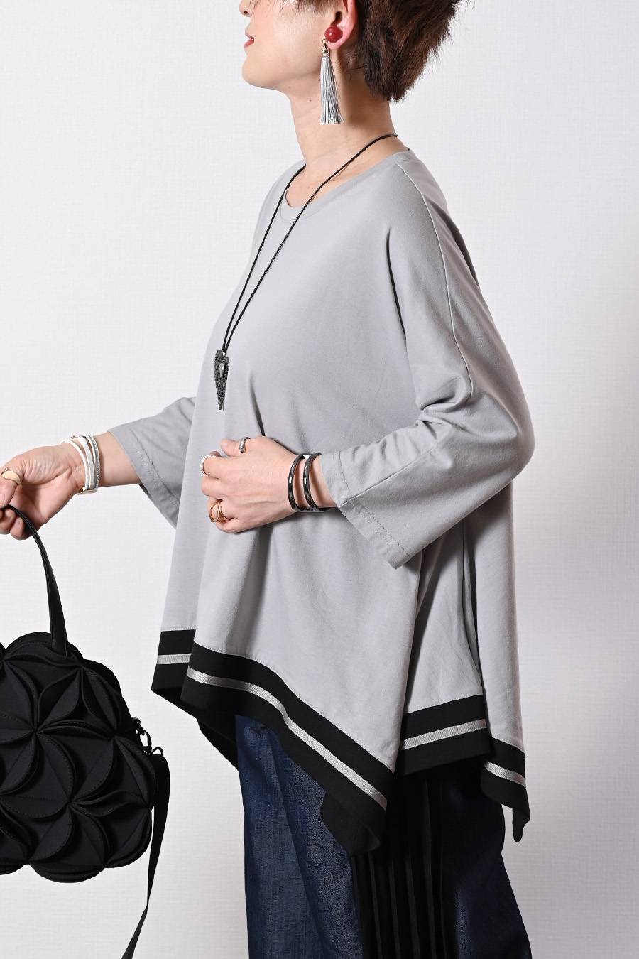 上品な光沢のライン使い(グログランテープ)と、7分袖のバランスが絶妙。カジュアルなカットソー素材ながら、ブラウス感覚で綺麗めにも着こなせる一着です。