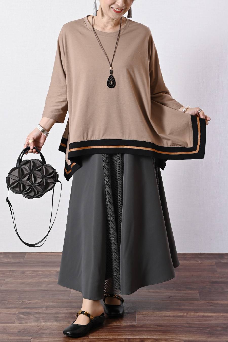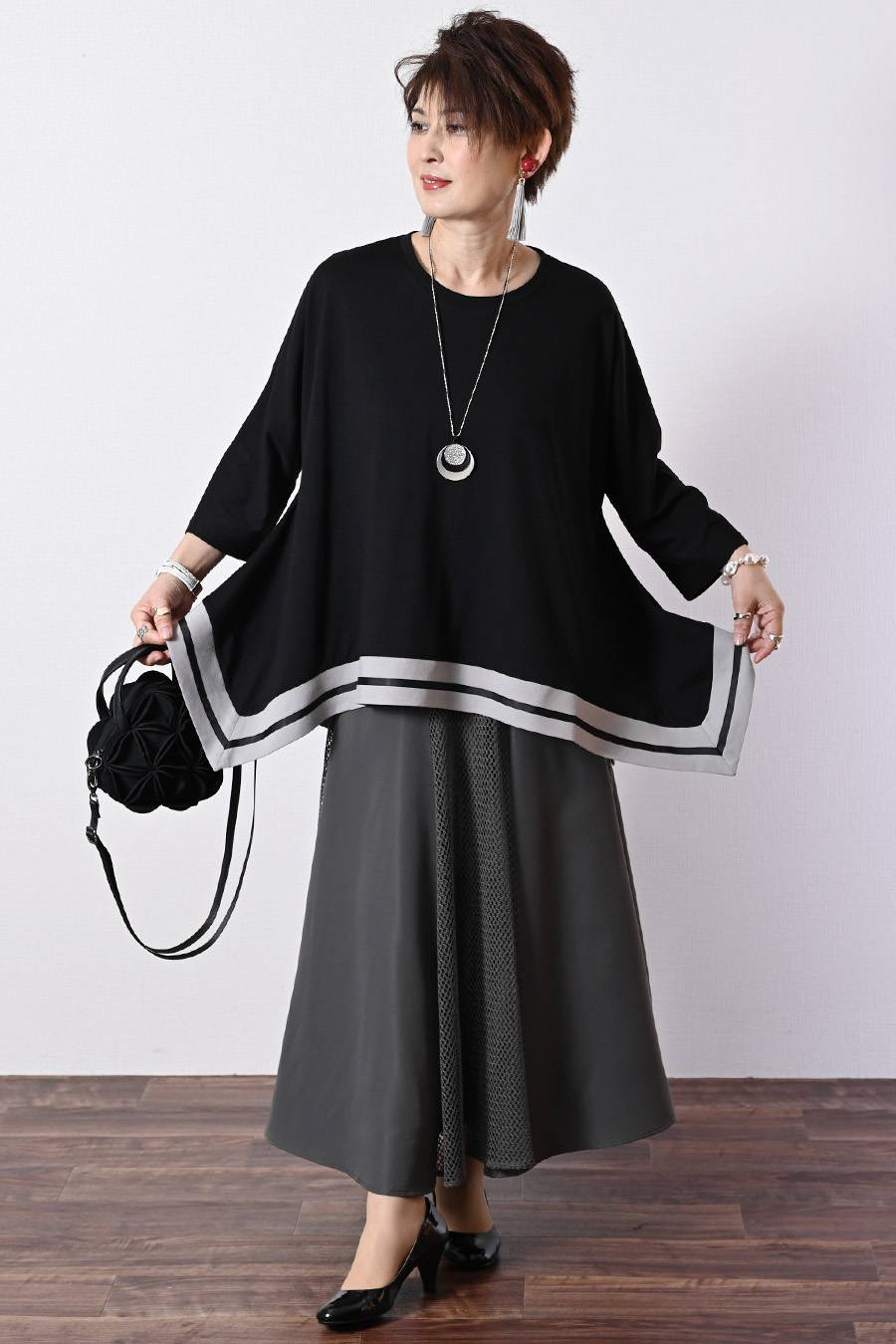 イレヘム配色ラインワイドプルオーバー+メッシュ切替フレアロングスカート2点セットコーデ