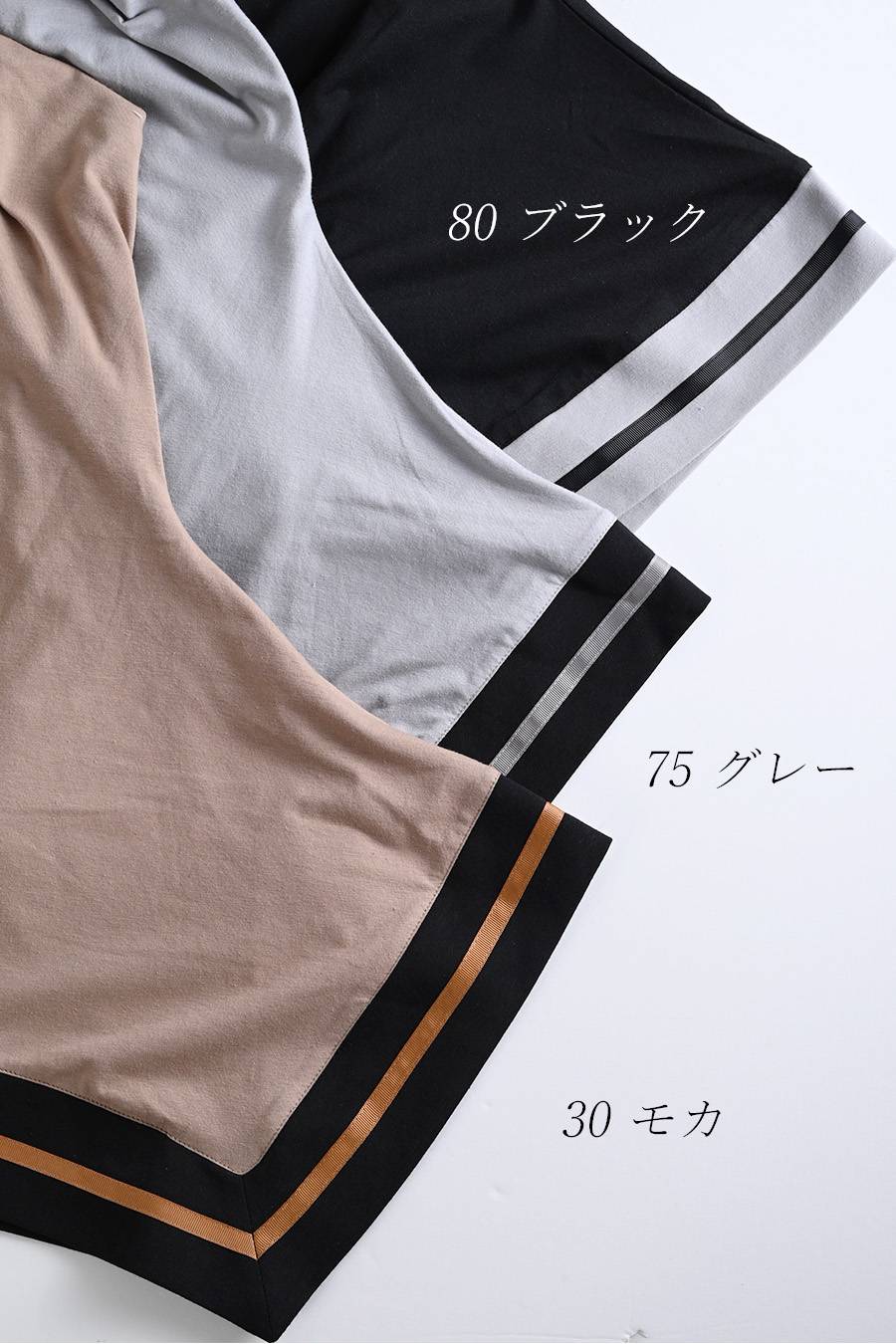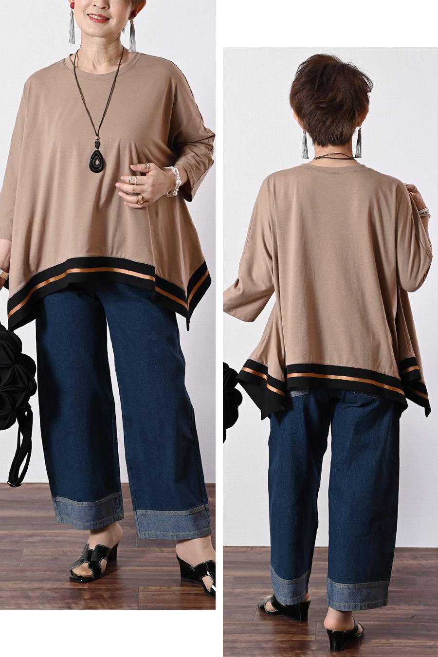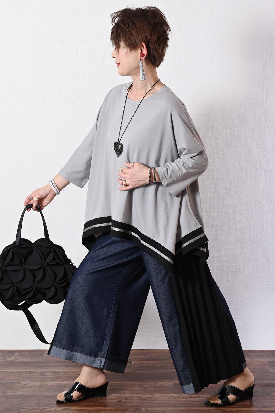 裾に施された太めの配色ラインが全体の印象をギュッと引き締め、ワイドな形でも着膨れして見えないよう計算されています。