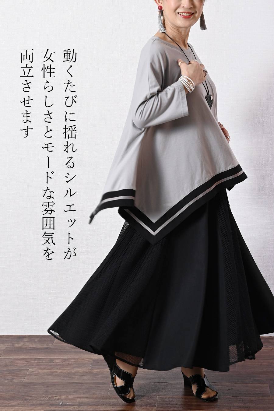 脇の下から裾にかけてたっぷりと生地を使っているため、ウエストやヒップ周りを完全にカバー。動くたびに揺れるシルエットが、女性らしさとモードな雰囲気を両立させます。