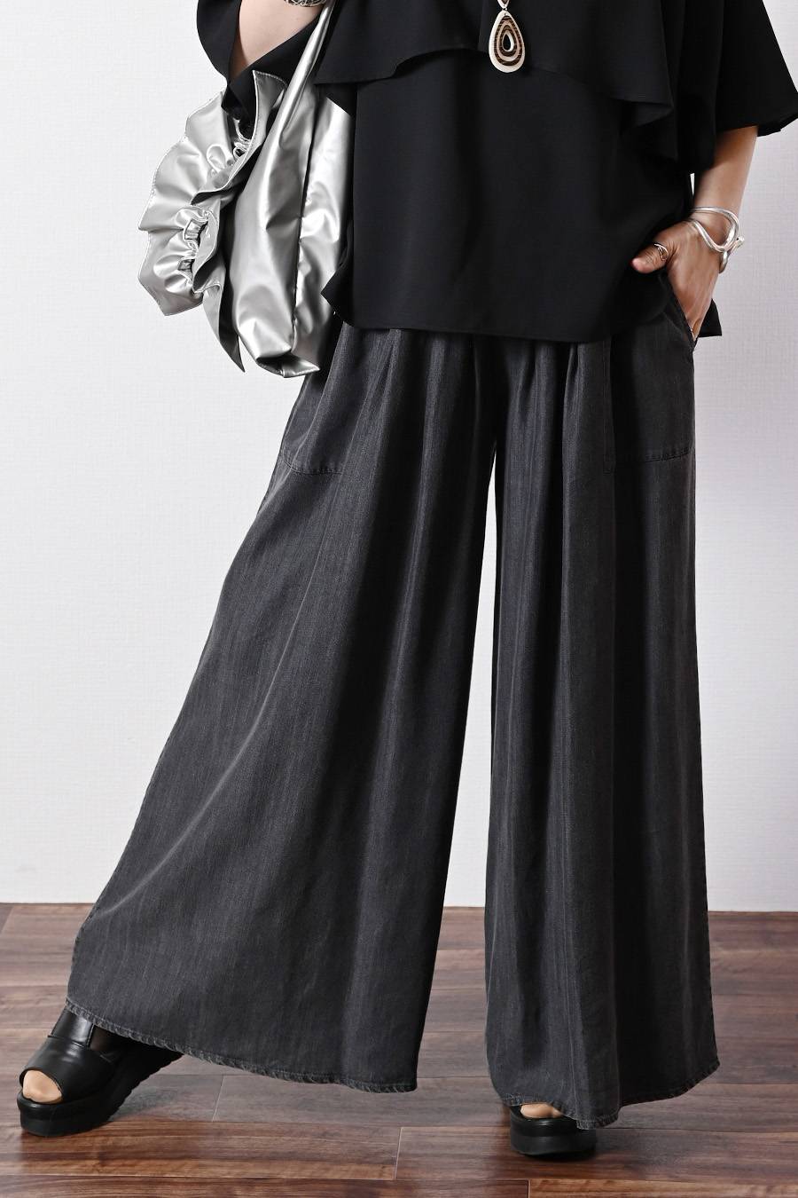 落ち感のきれいなセルロース柔らかなデニムライクな素材を使用した、リラックス感たっぷりのワイドパンツ。深いタックと大きなパッチポケットが、腰回りをスマートに見せてくれます。
