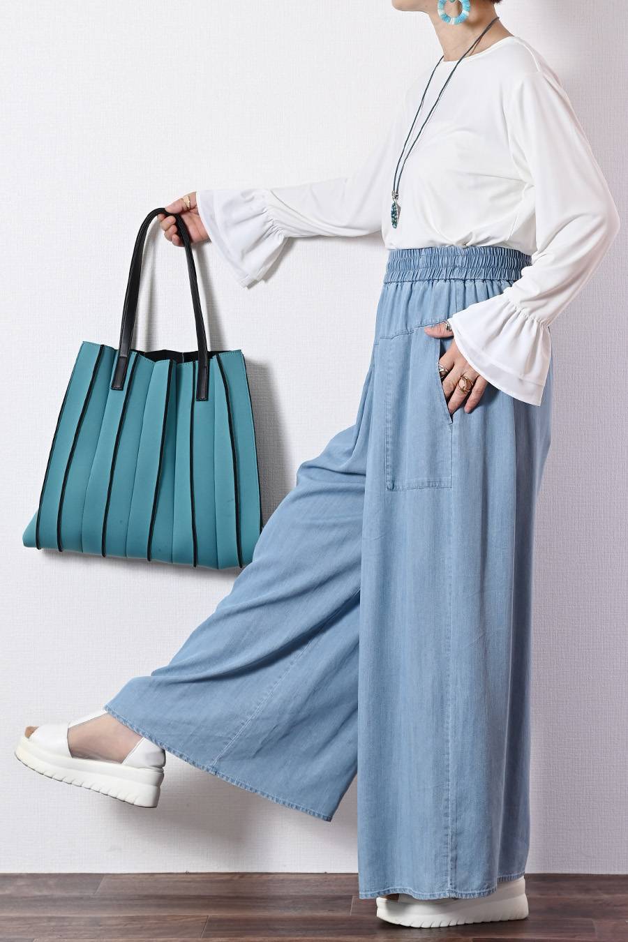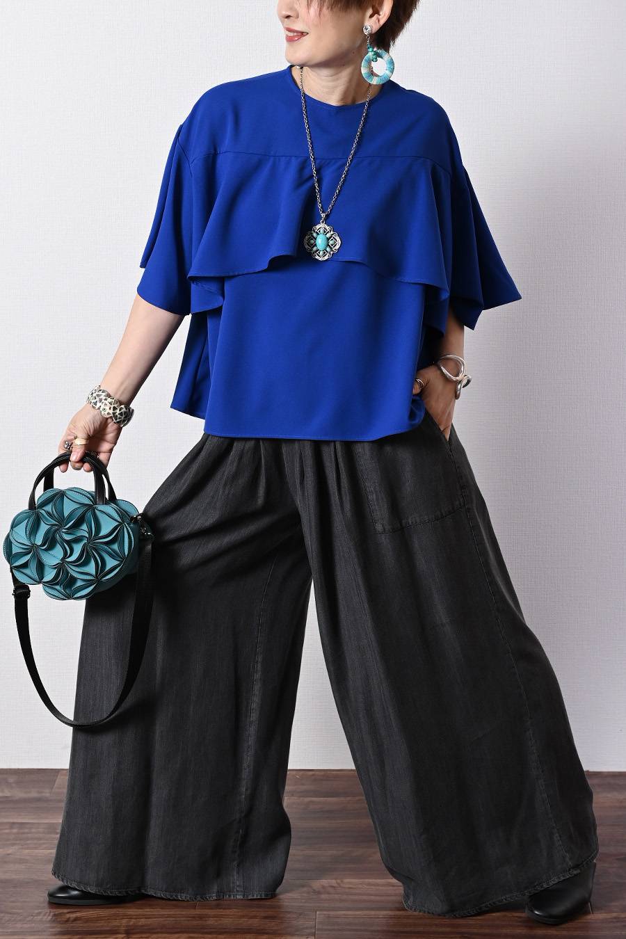 フリルジョーゼットブラウス+タックワイドデニムパンツ2点セットコーデ